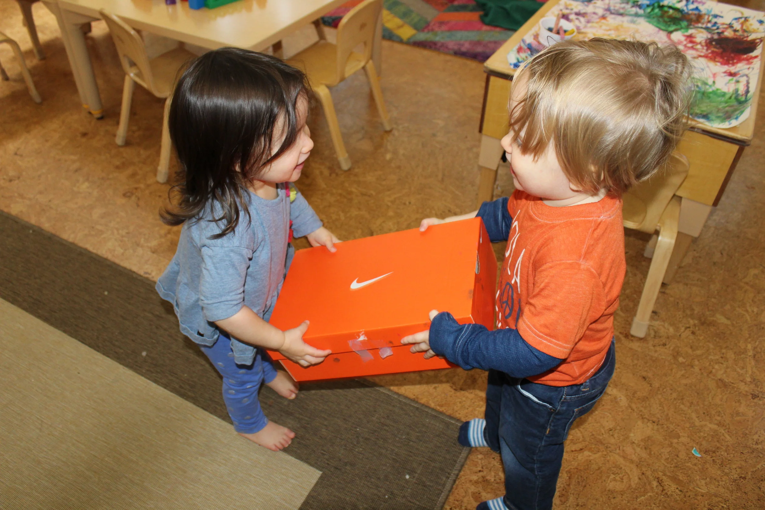 Harry and Ellie needed help moving the box from side by side and Harlow helped both children! Cooperative play is essential in early childhood. It promotes sharing and working together.