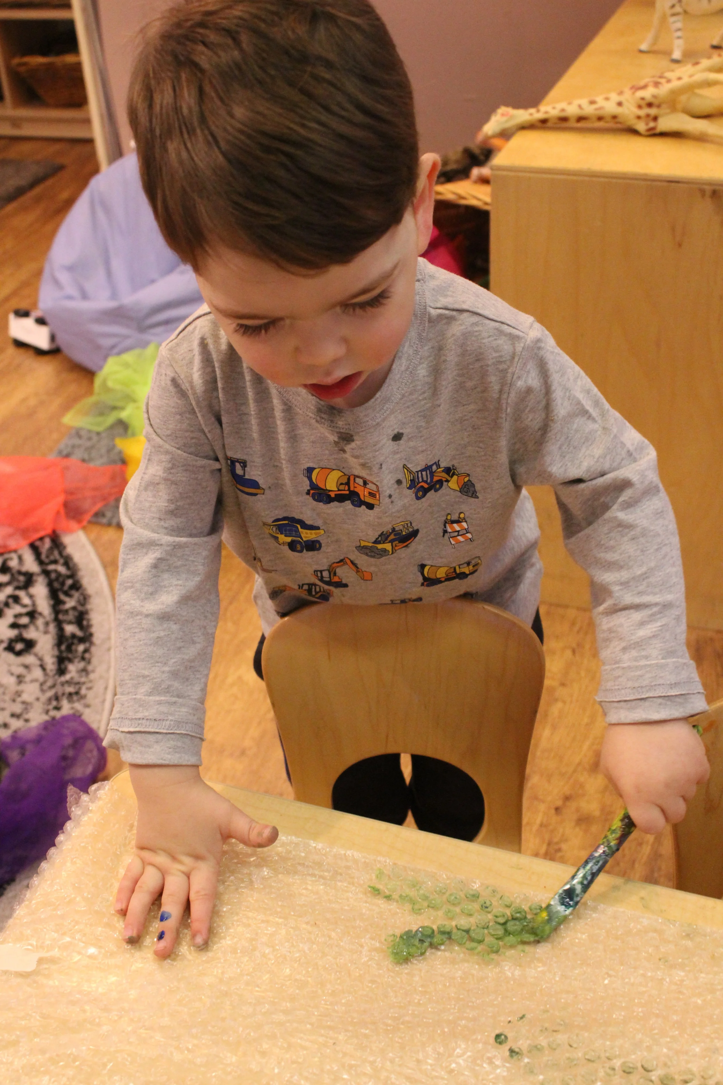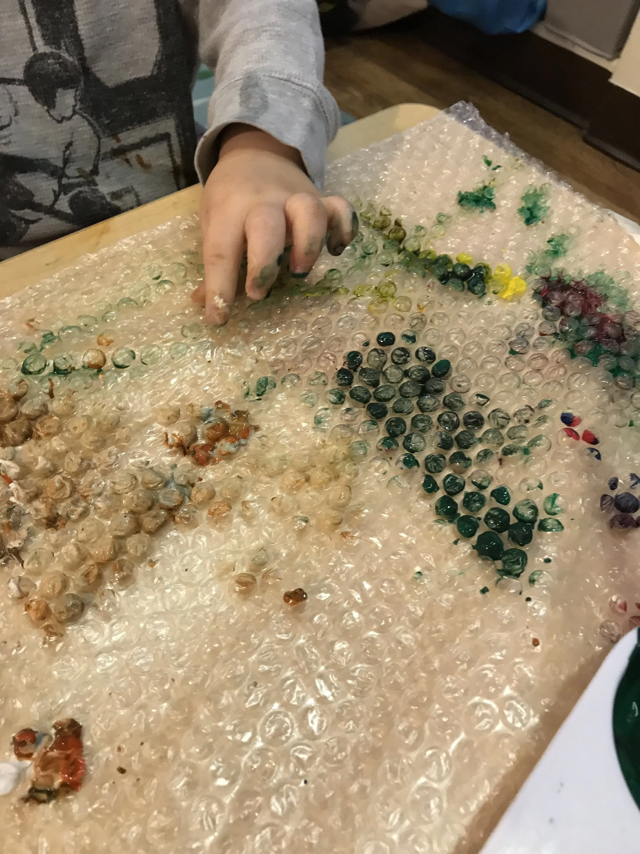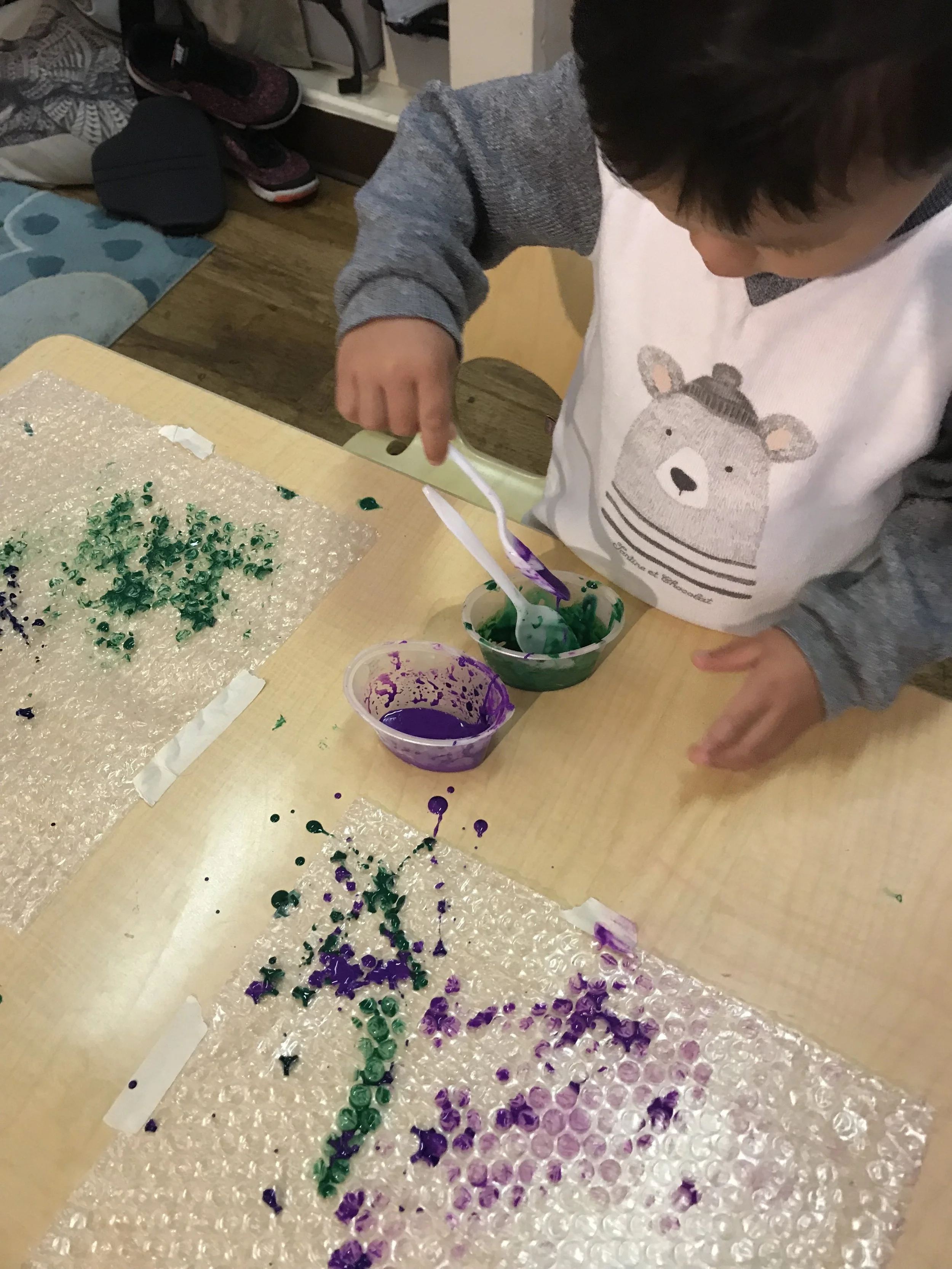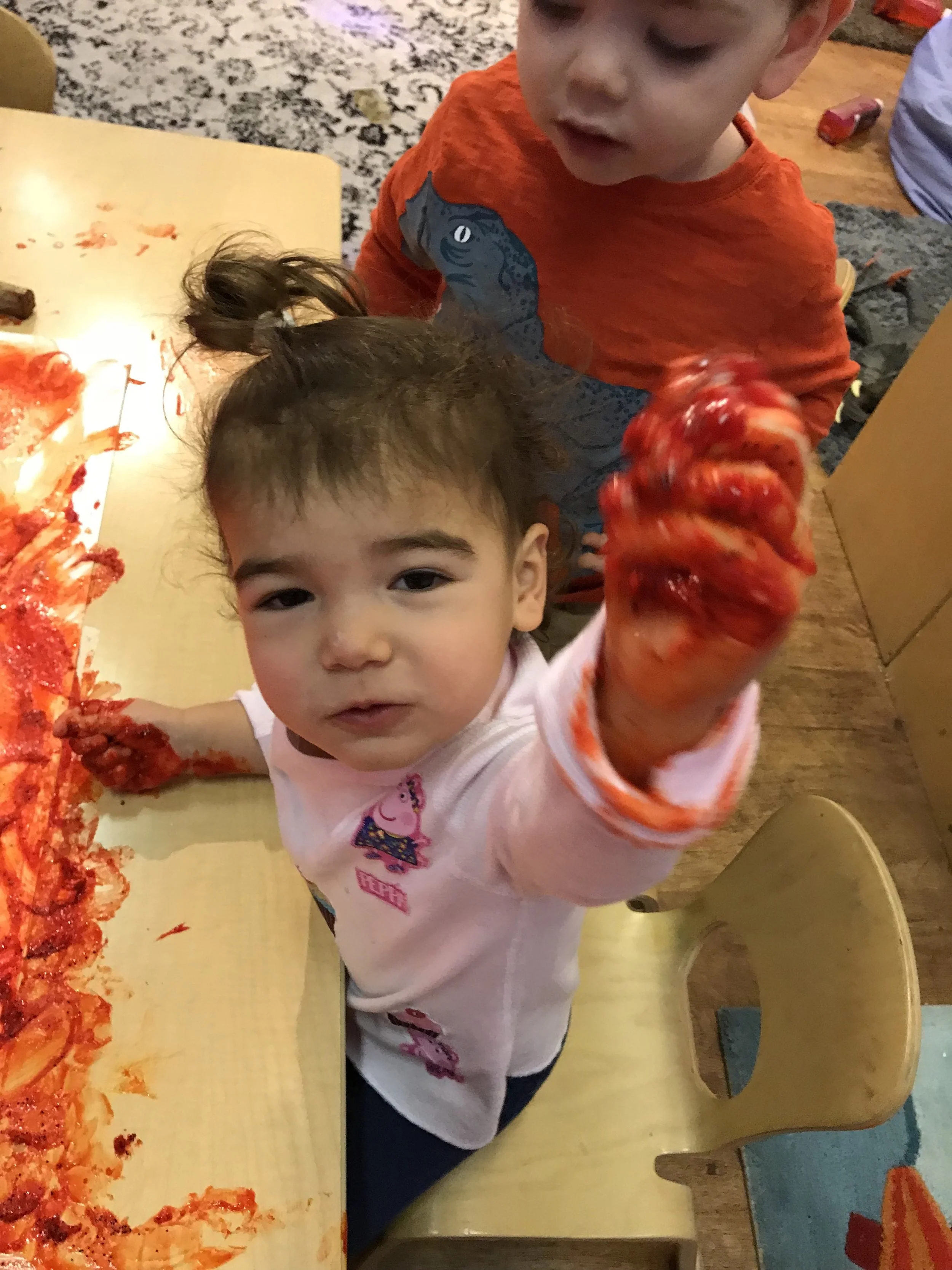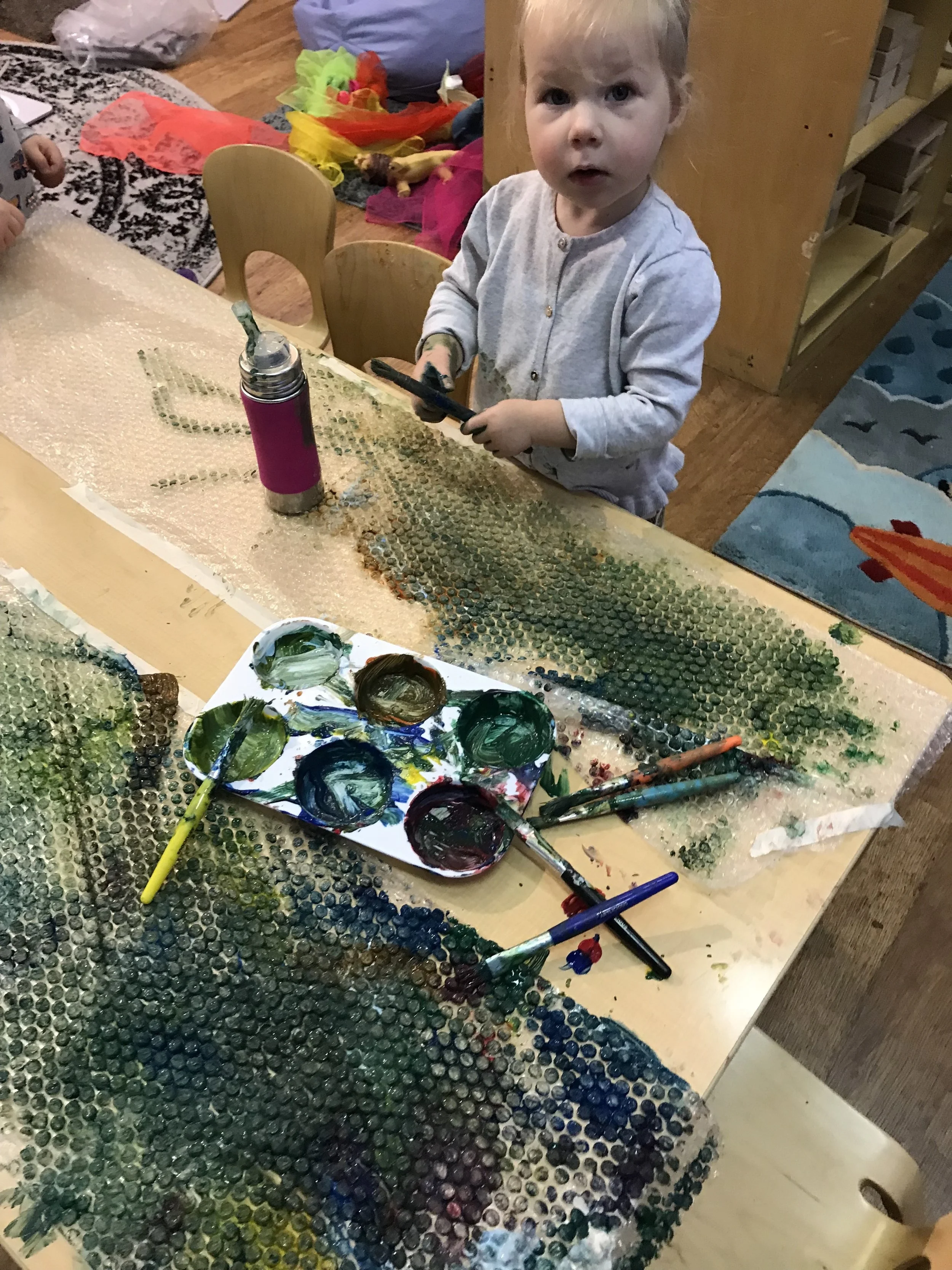 As our school wide intention for this year is paint, we have been doing a lot of exploratory work with this medium. Some of our recent work includes: painting with forks, painting with corks, painting with tubes, using spoons with a glue/paint mixture, using our hands to paint, painting on a variety of surfaces, using sponges to paint, and watercolor paint in both liquid and solid forms.