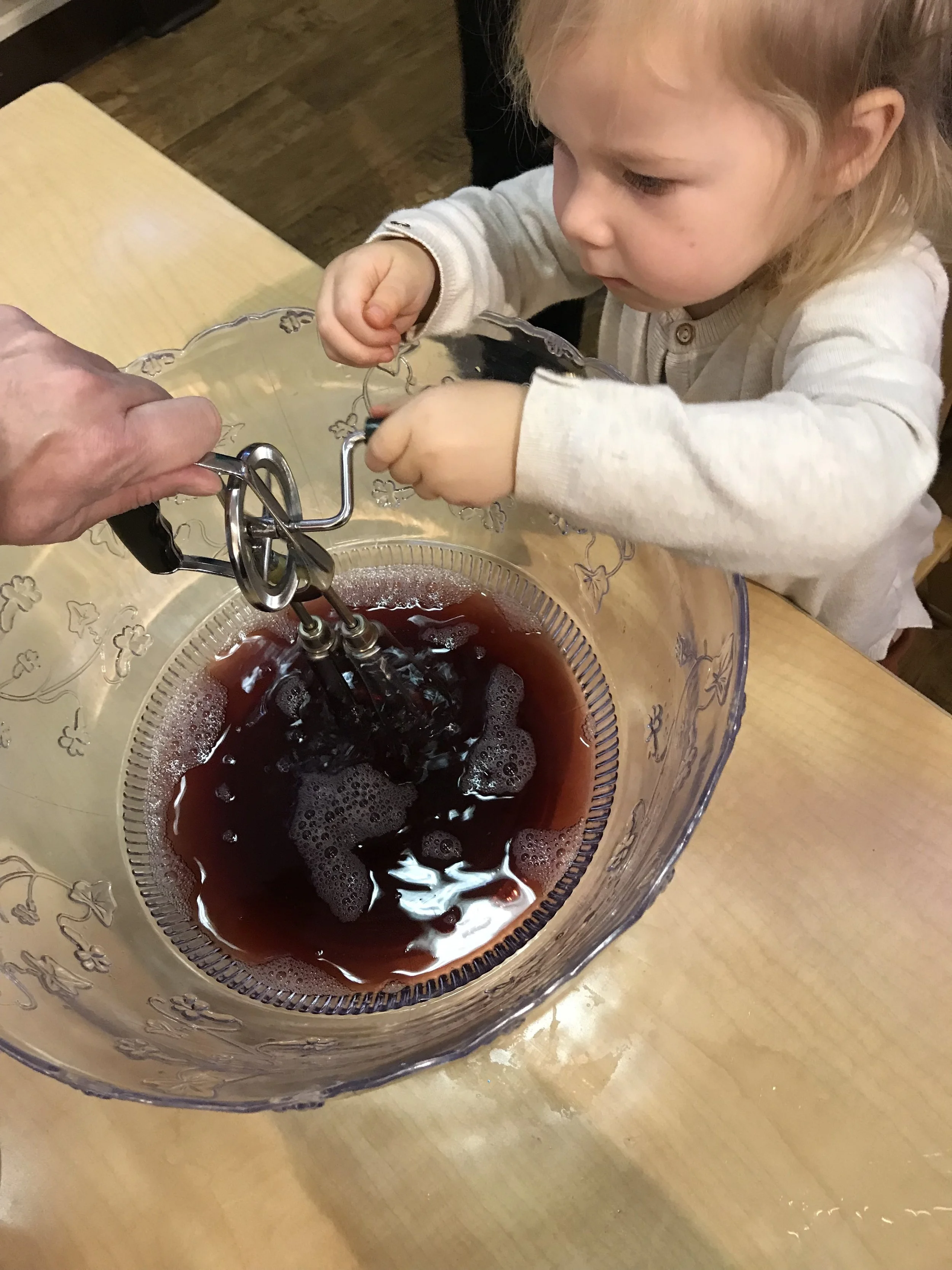 On Tuesday we had cooking with Diane. We created a magic potion by using a hand blender to mix apple and grape juice together.