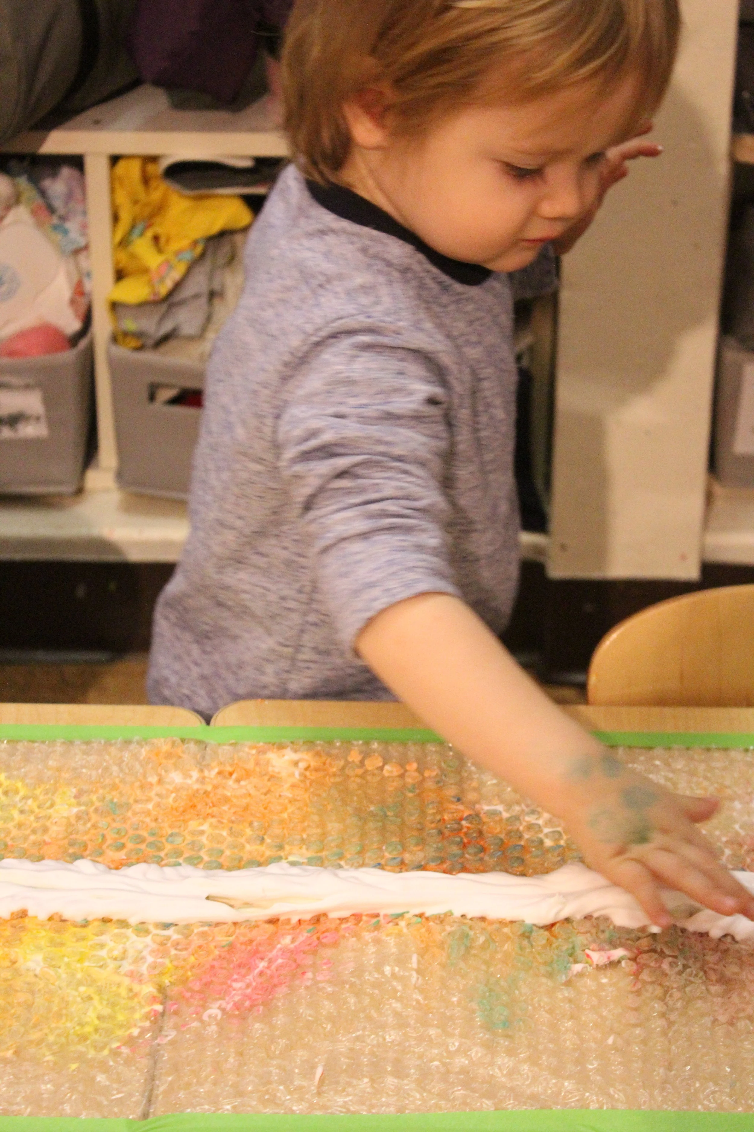 Additionally we: made and used playdough, made and used slime, worked on shape recognition through drawing, created self portraits, used a dough made from cornstarch and soap, jumped on bubble wrap, worked on glue collages . . . and so much more!
