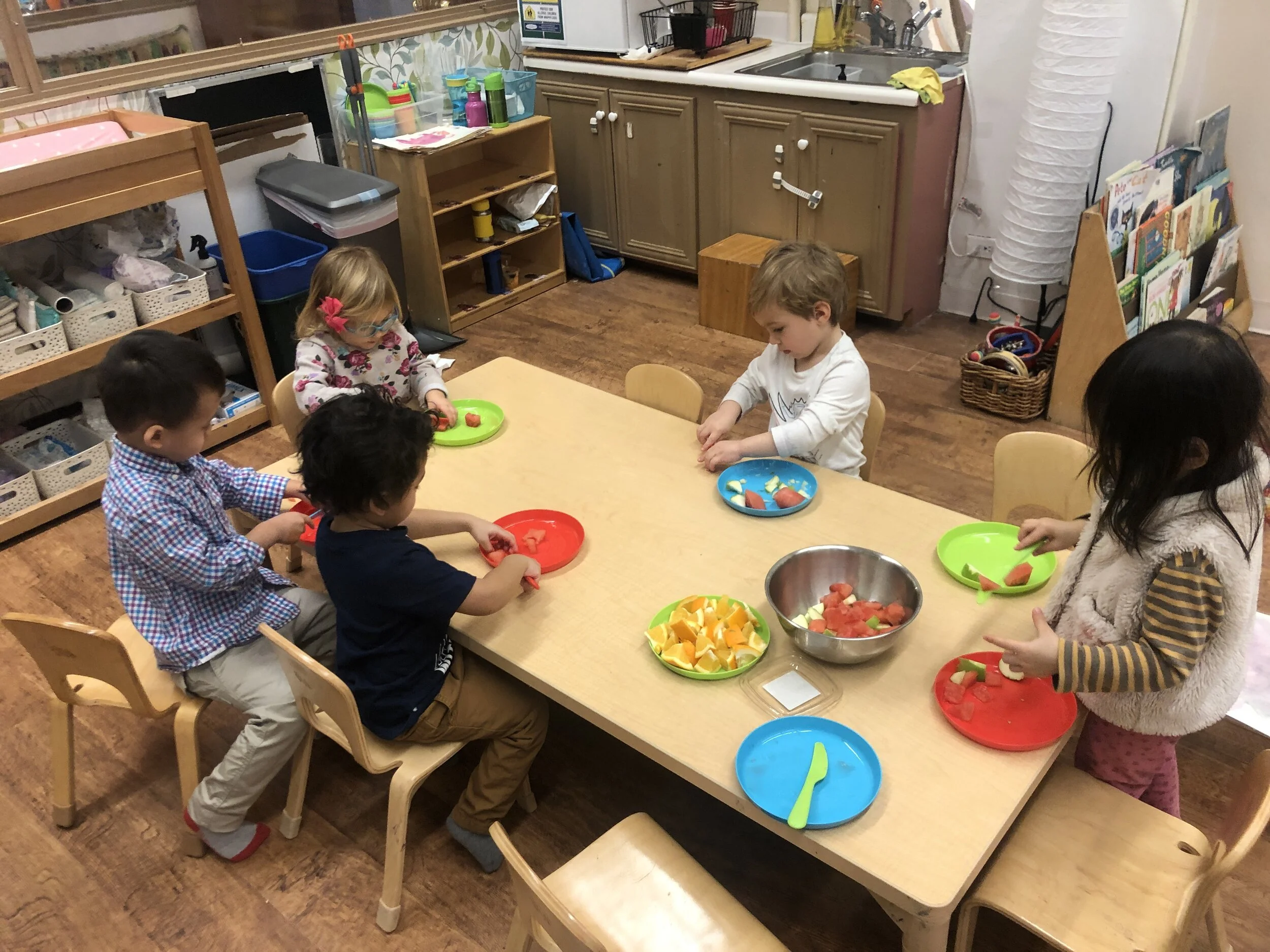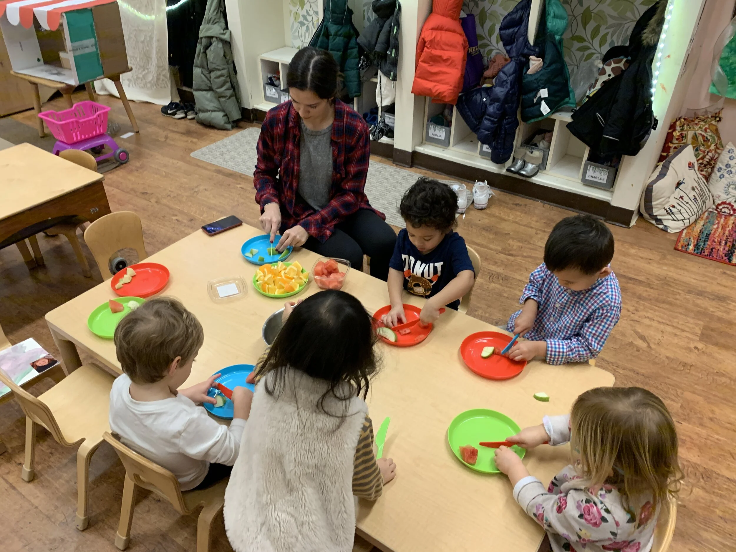 On Friday, we took another trip to the grocery store to buy ingredients for a fruit salad. Before we left, the children collectively decided that we should buy oranges, green apples, and watermelon. When we arrived back at school, the children used plastic knives to cut up our fruit. We also talked about how to say orange (naranja), watermelon (sandía), and apple (manzana) in Spanish. After, the children took turns mixing while we counted to 5 in Spanish. Then, we enjoyed! This cooking activity allowed us to do more grocery store research, engaged their fine motor muscles, and gave us a chance to practice our Spanish and counting.
