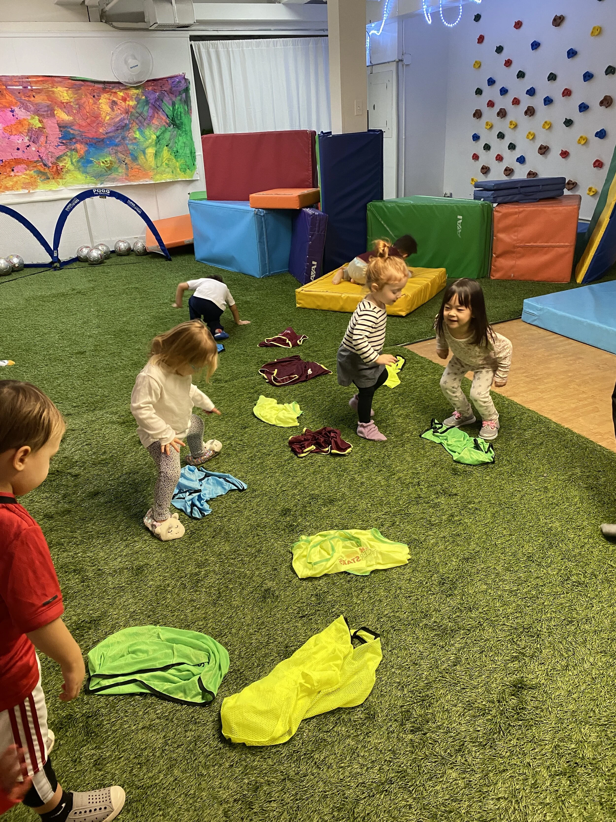Soccer - we played a game with “beach towels” where the children had to jump over the shirts. Then, they kicked the mini soccer balls onto the shirts and did two kicks on the ball.