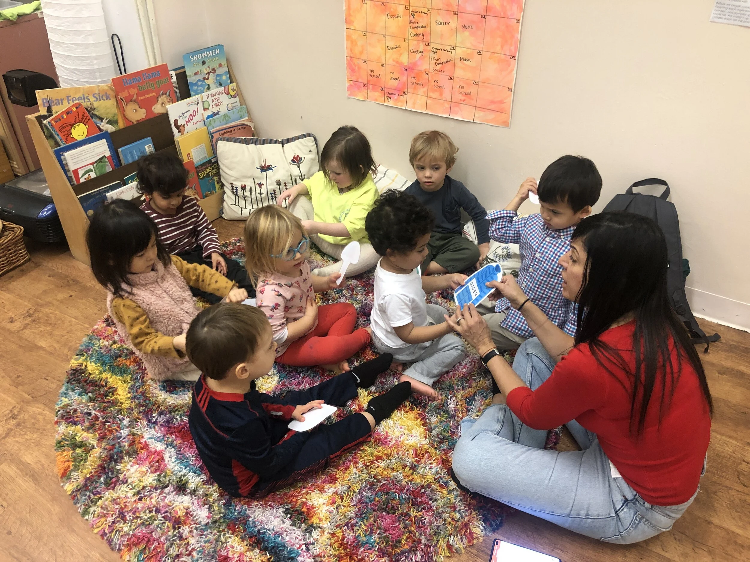 Spanish - we sang “Cinco Patitos” (Five Little Ducks) and “Viejo Macdonald” (Old Macdonald). We practiced counting and went over farm animals in Spanish.