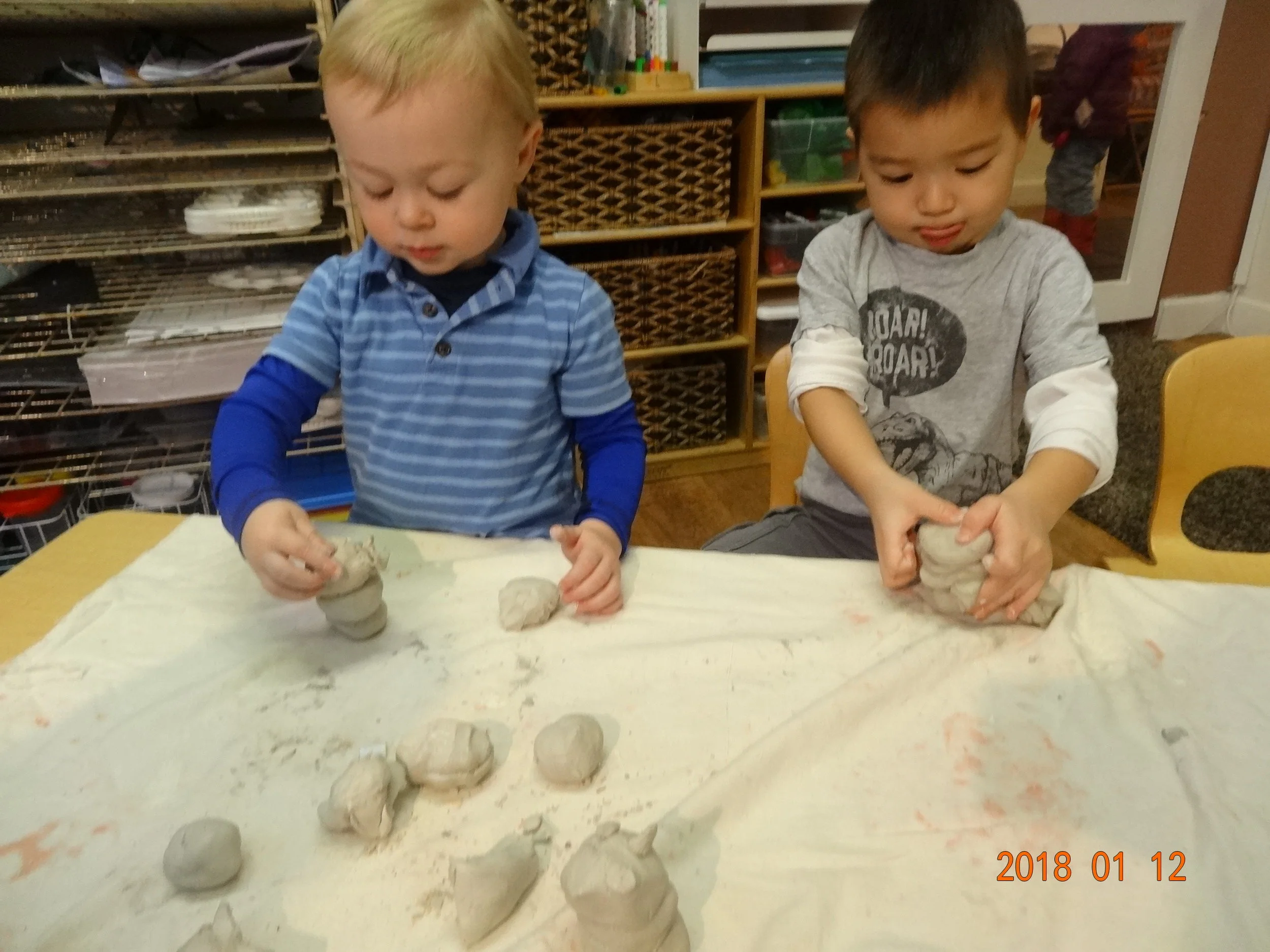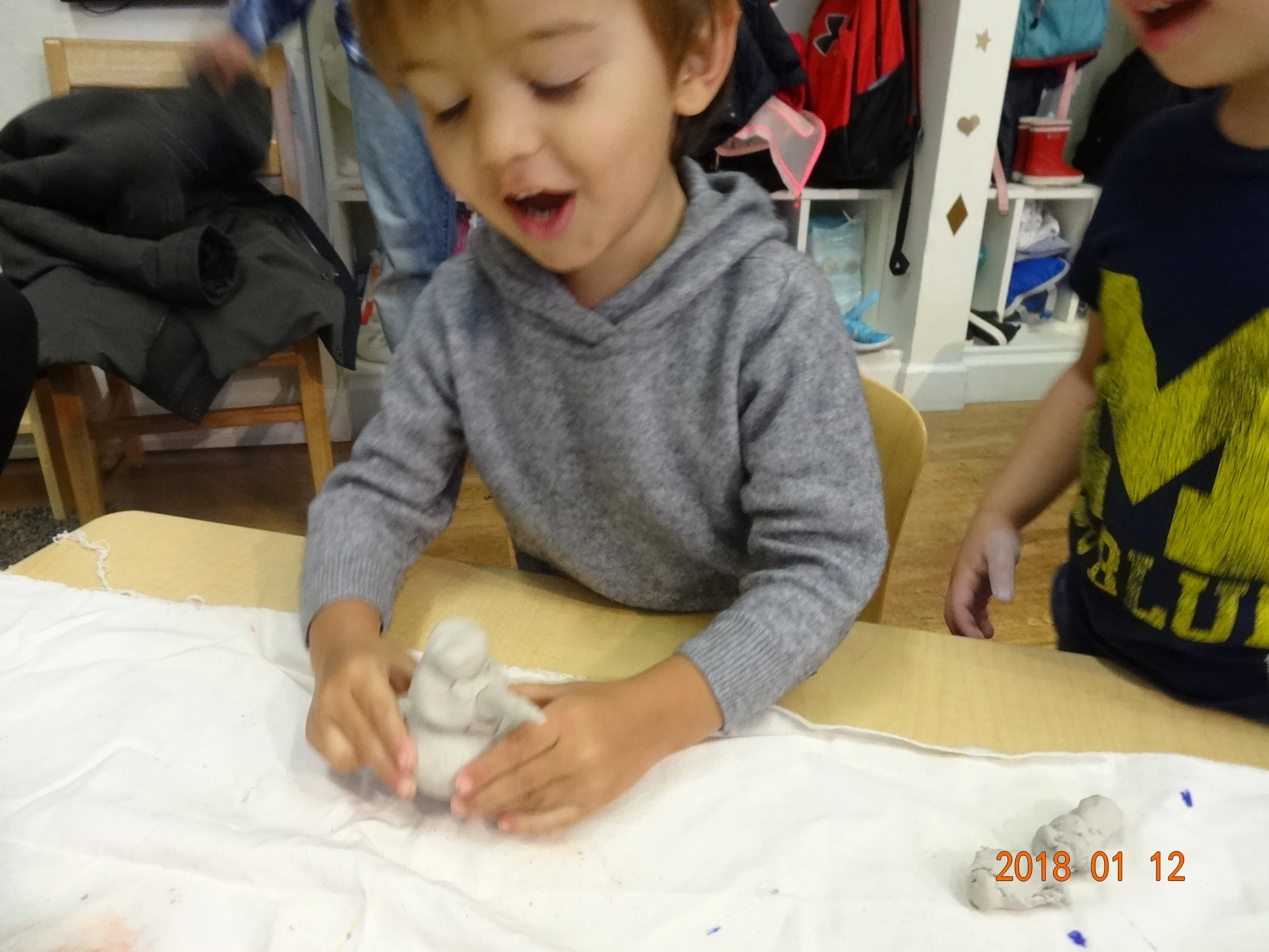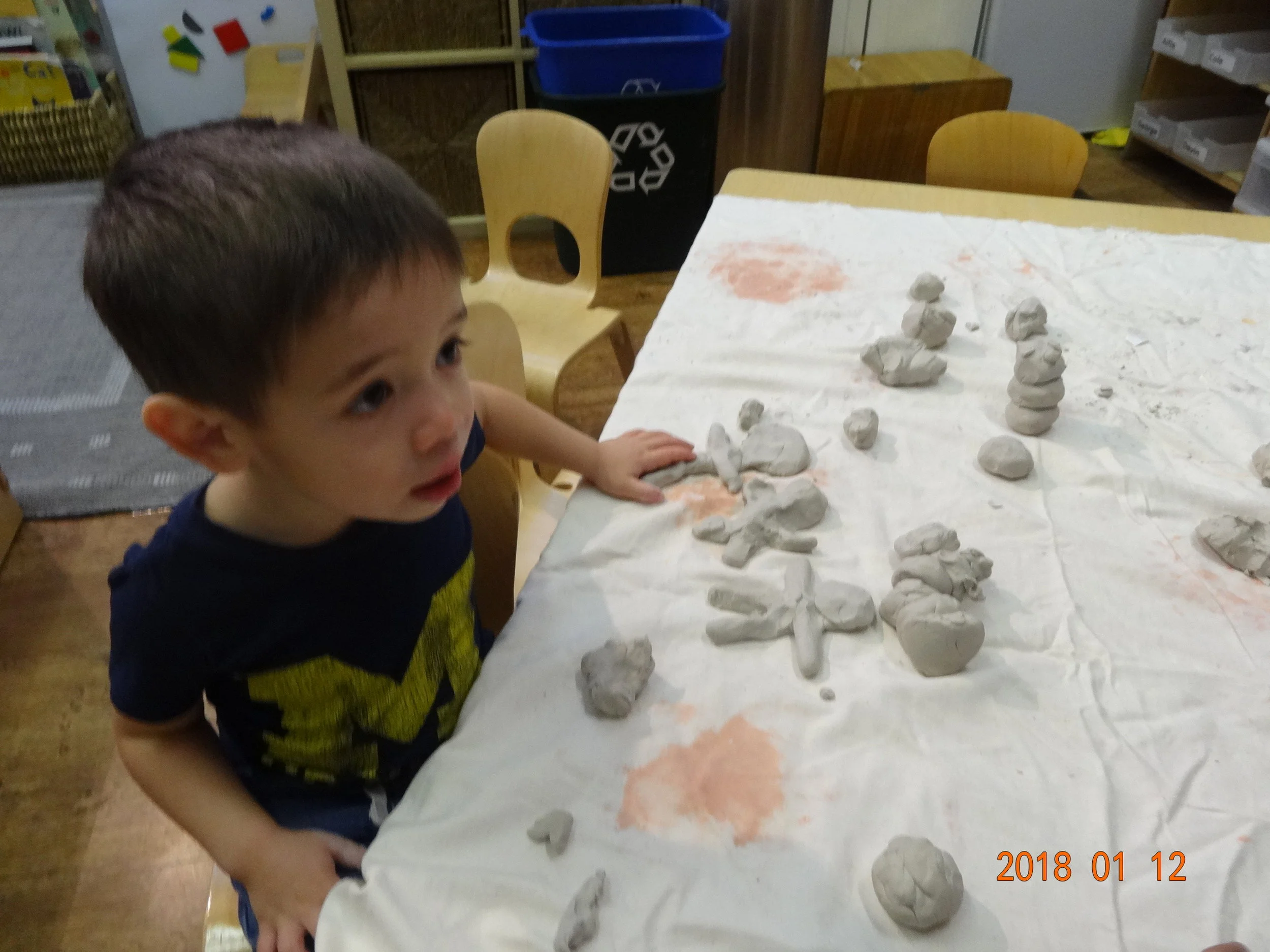 This week we have seen more imaginative play and artwork. From putting out invisible fires and riding in cars, to covering a boat to keep out water and making snowmen and big bears out of clay - we sure know how to get creative! Today, Romeo made a snow man family with clay while Cole made a big bear (see the pictures below). In gym, friends take turns pretending to be the rainbow ghost - a funny character that 2B has carried over from last semester - while Oliver likes to be a kitty cat and sleep in nice little block houses with his friend Grady, who is never a kitty cat. In the upstairs gym, Lauren covered the boat shaped seesaw with a veil. "What is this for?" Hillary asked her. "No water come in." she replied. Smart!