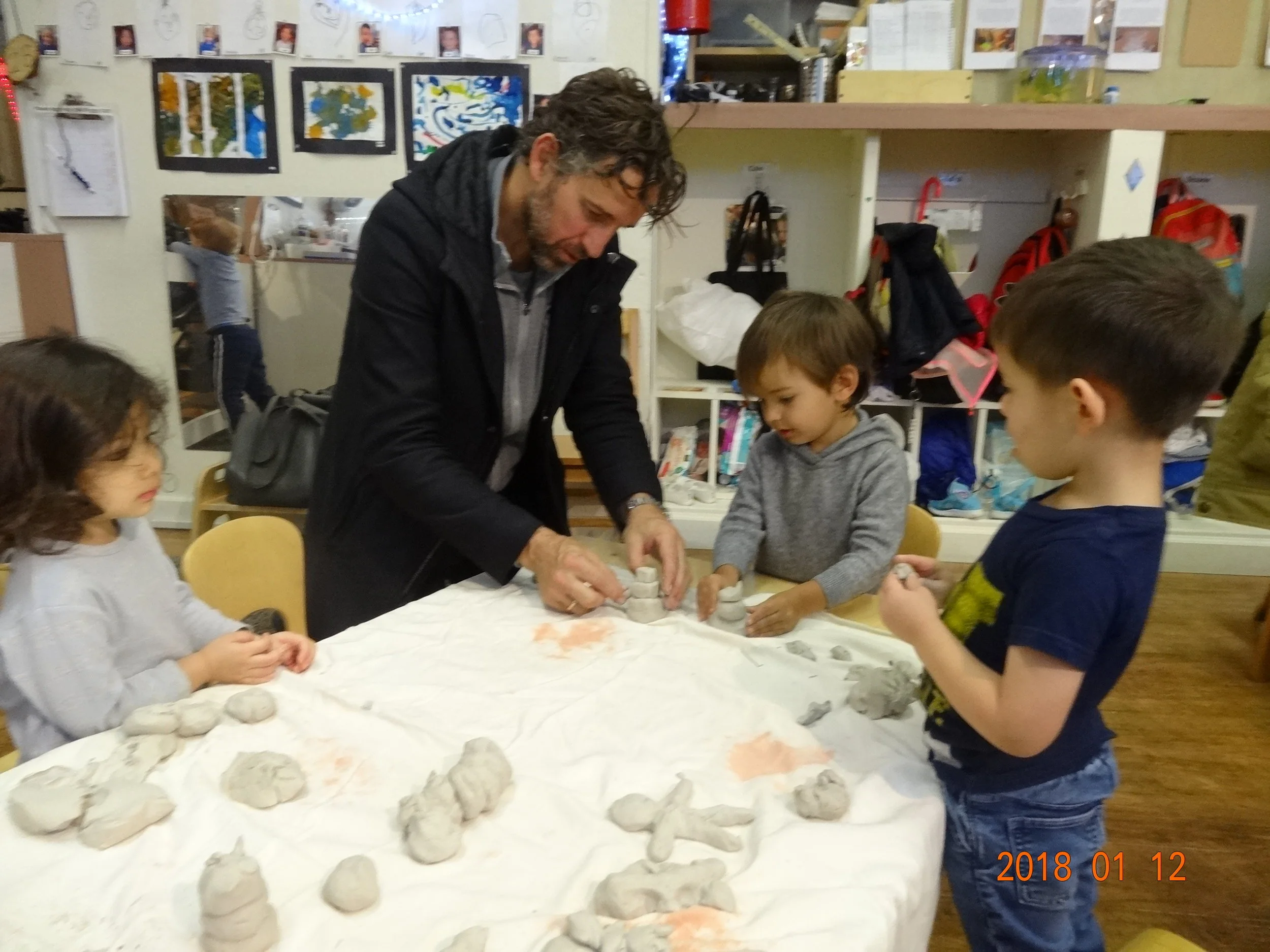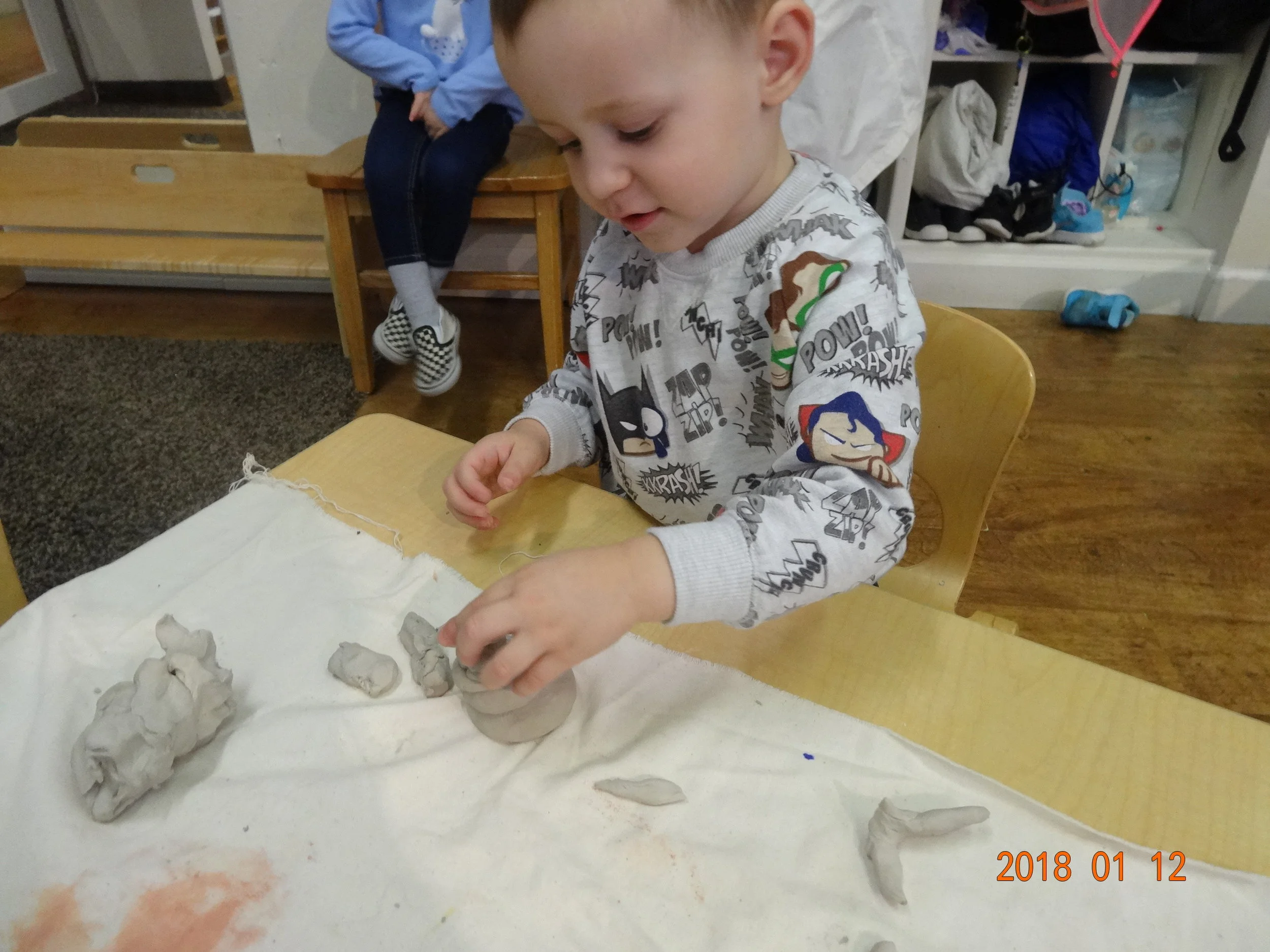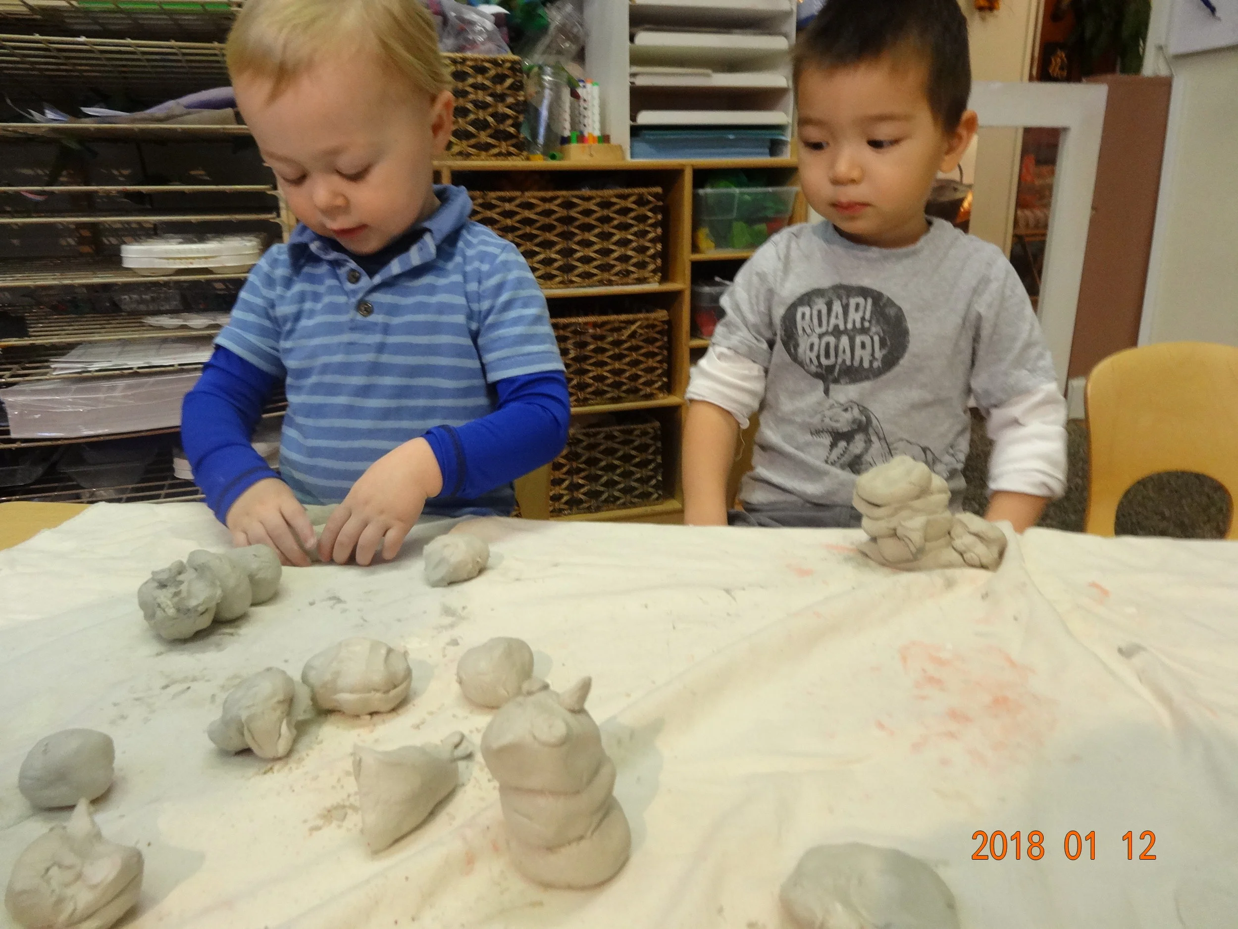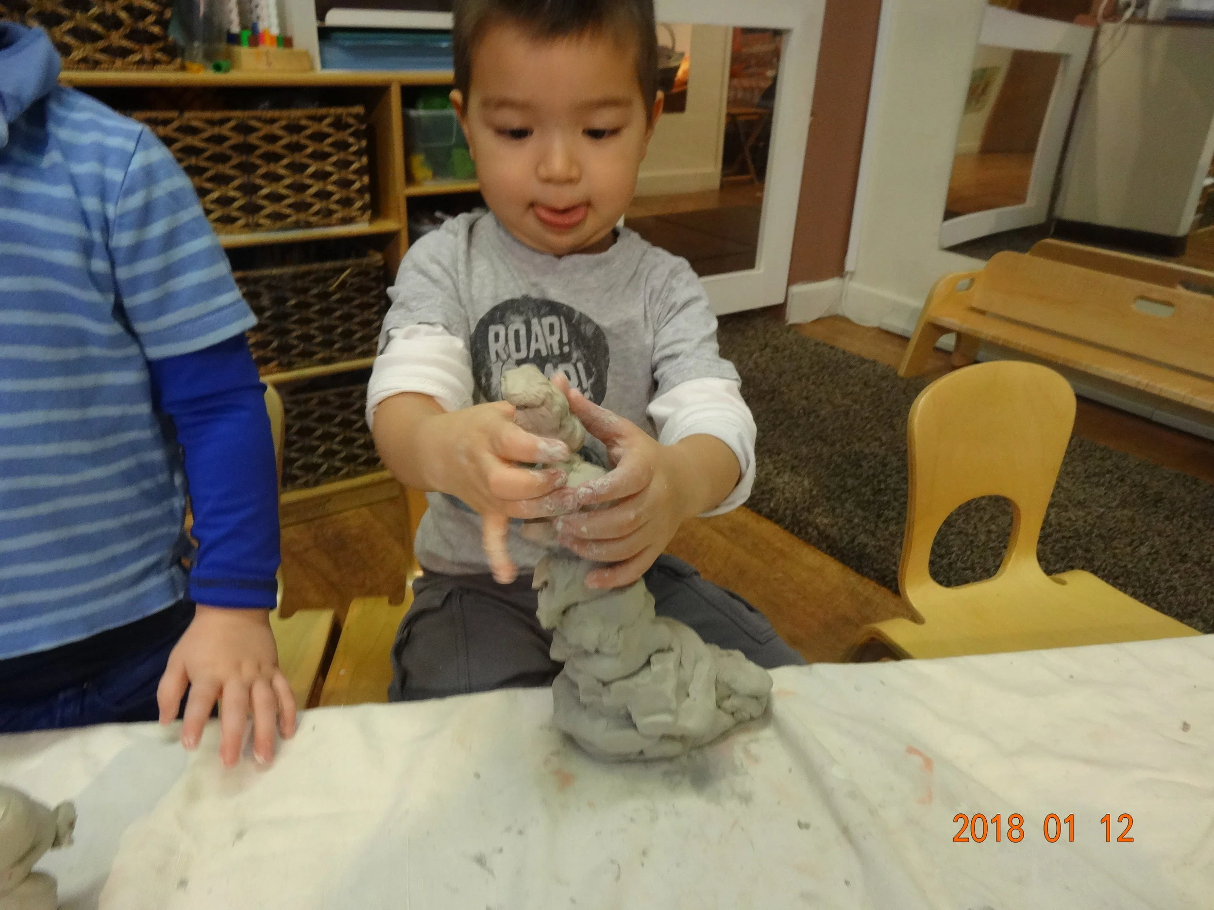 This week we have seen more imaginative play and artwork. From putting out invisible fires and riding in cars, to covering a boat to keep out water and making snowmen and big bears out of clay - we sure know how to get creative! Today, Romeo made a snow man family with clay while Cole made a big bear (see the pictures below). In gym, friends take turns pretending to be the rainbow ghost - a funny character that 2B has carried over from last semester - while Oliver likes to be a kitty cat and sleep in nice little block houses with his friend Grady, who is never a kitty cat. In the upstairs gym, Lauren covered the boat shaped seesaw with a veil. "What is this for?" Hillary asked her. "No water come in." she replied. Smart!
