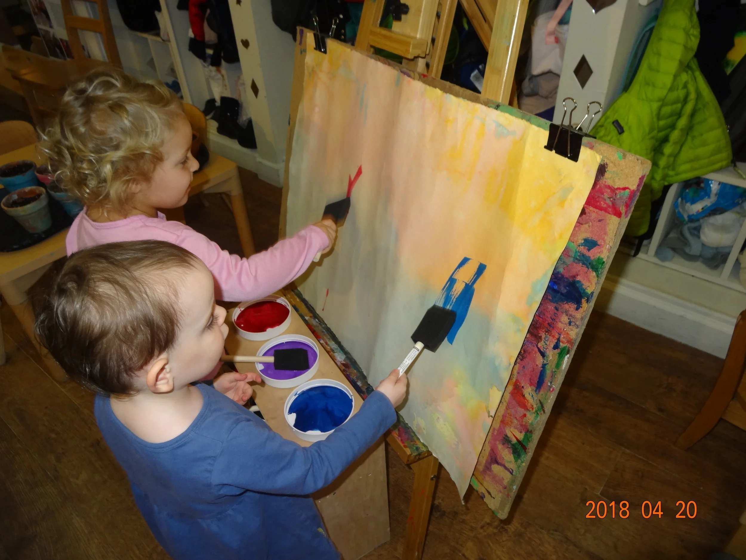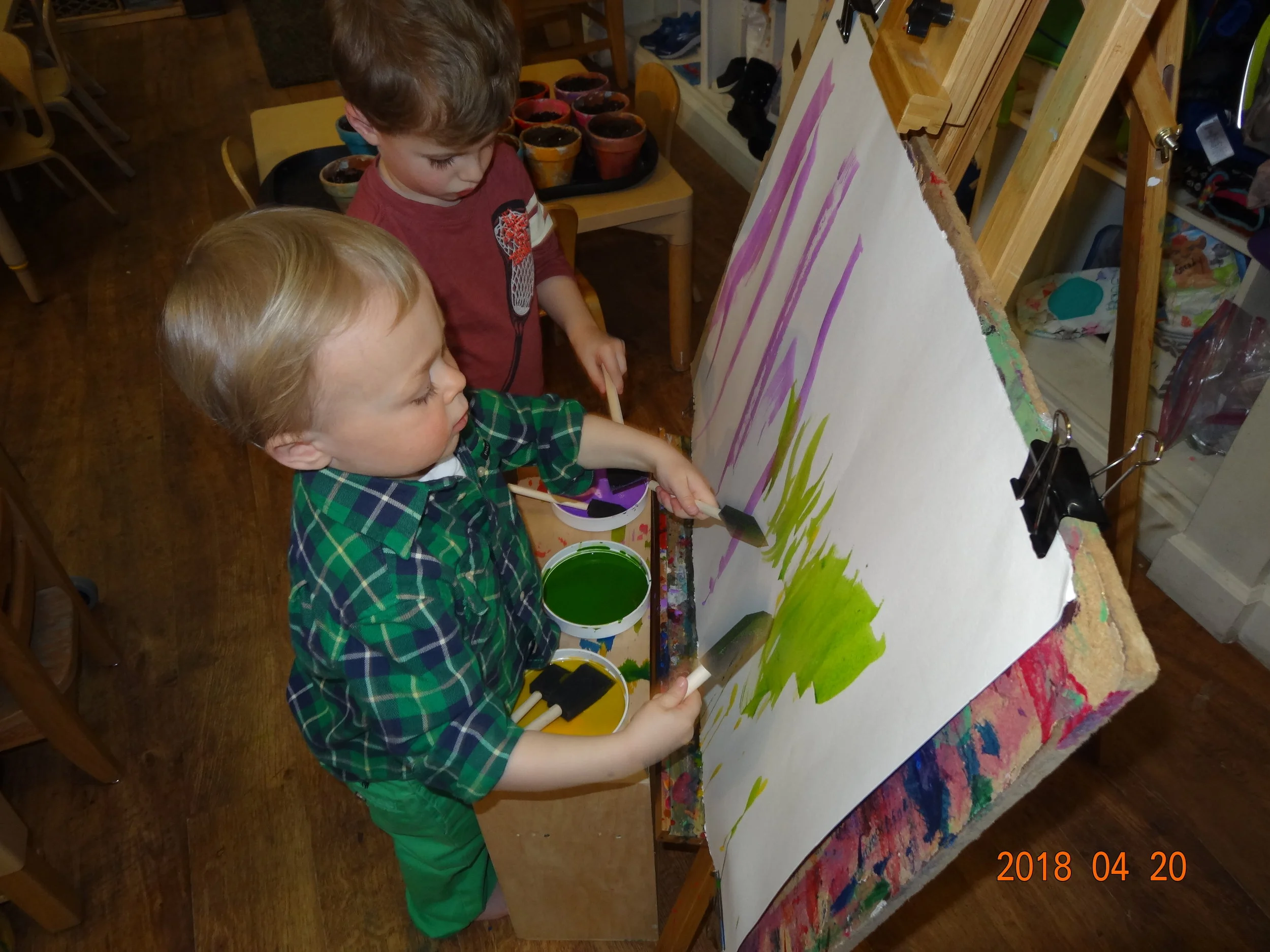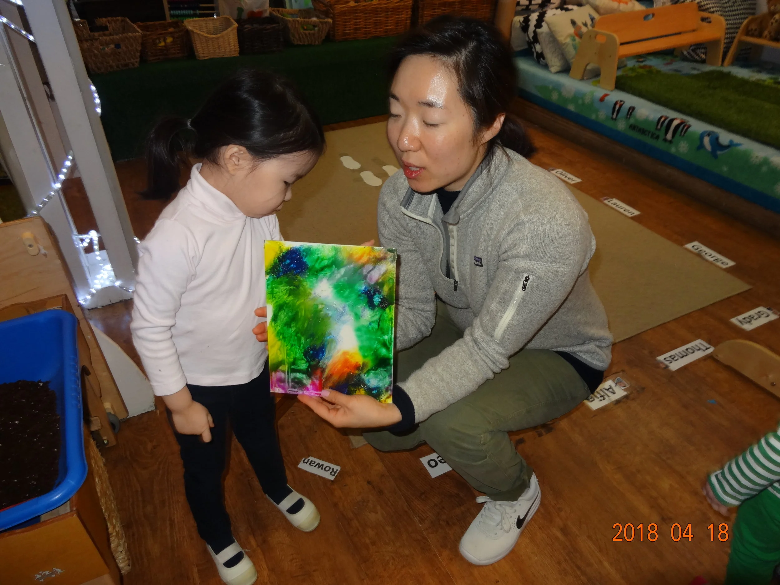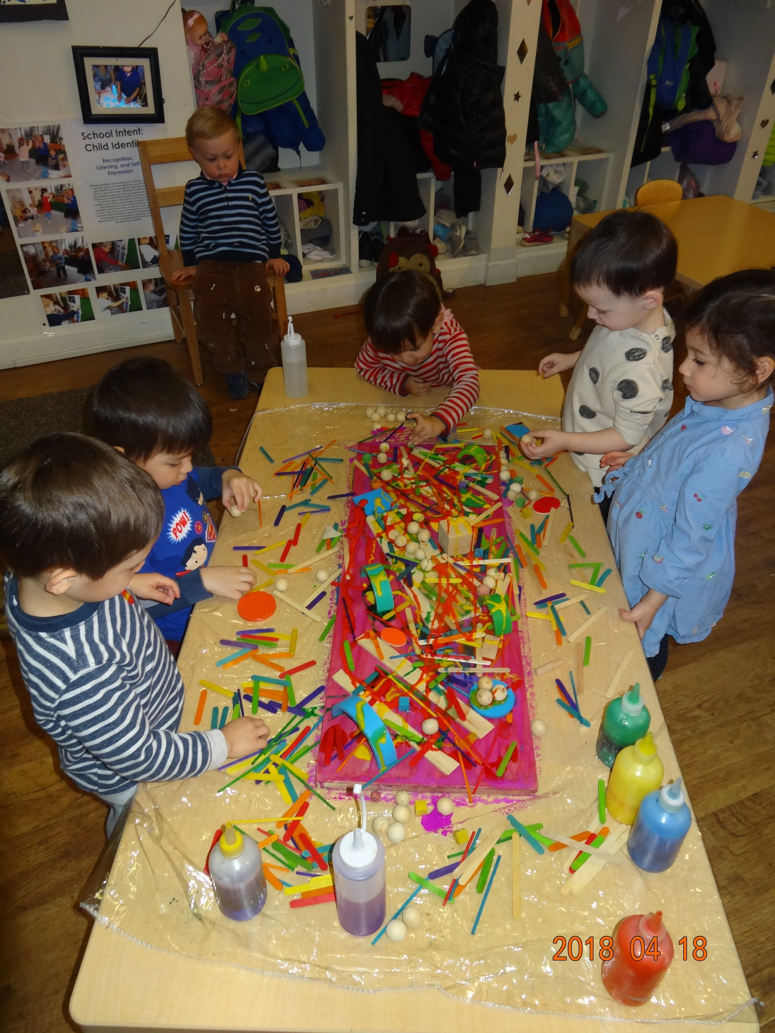 For our third day of Week of the Young Child, we spent our time building and creating together. We made a multimedia painting with blocks, colored glue, and other mixed materials. “We are building on a painting?” asked Jude. “Yes, and we will sell it in the Spring Art Market.” said Debbie.