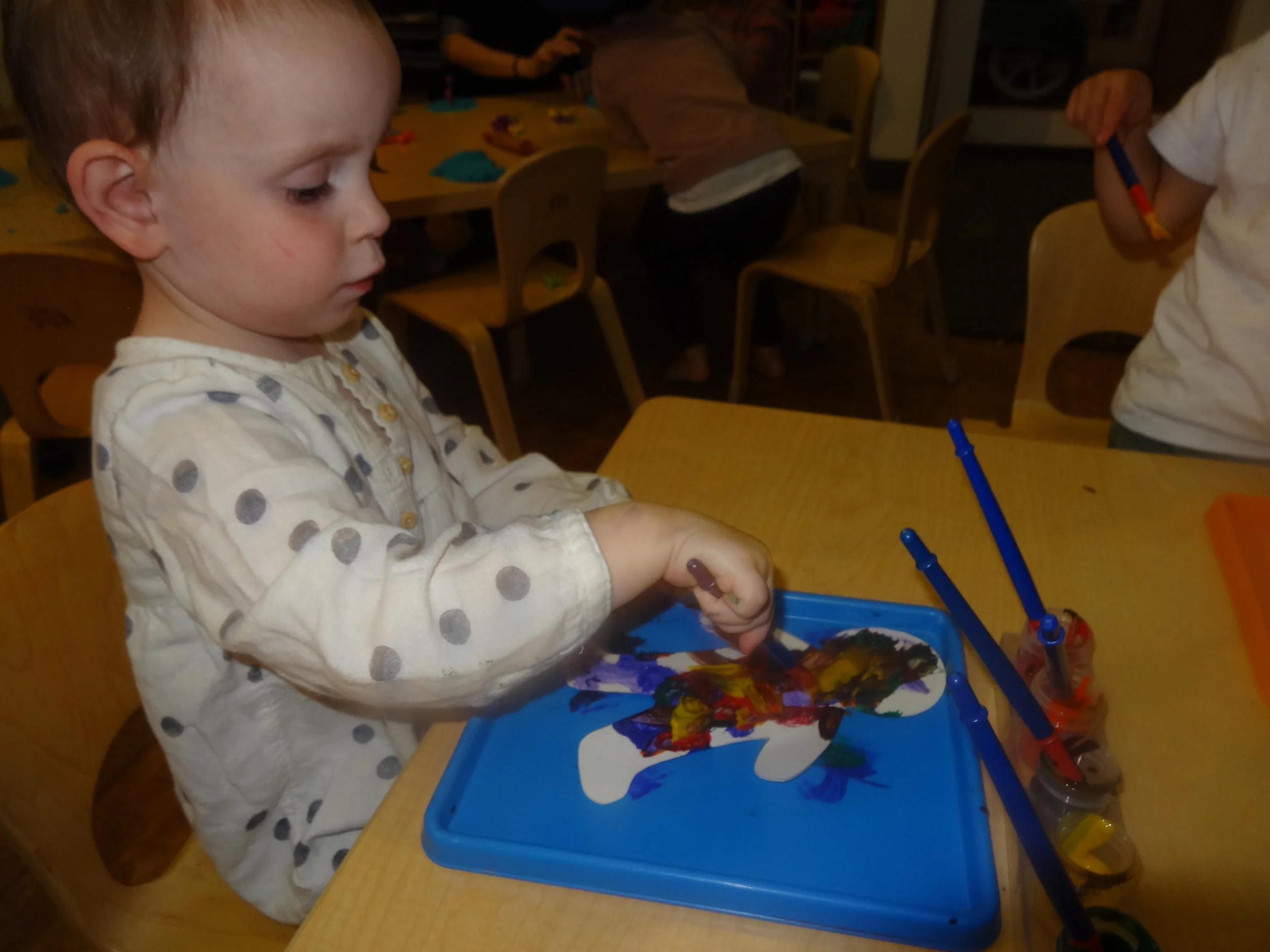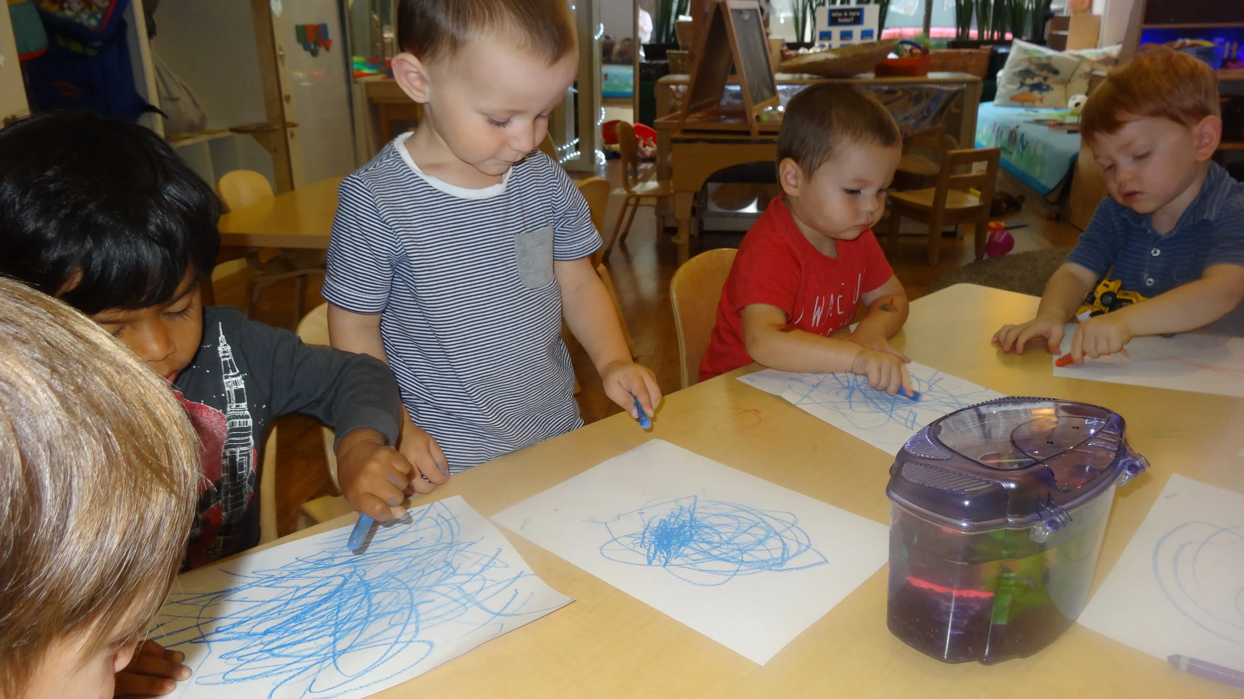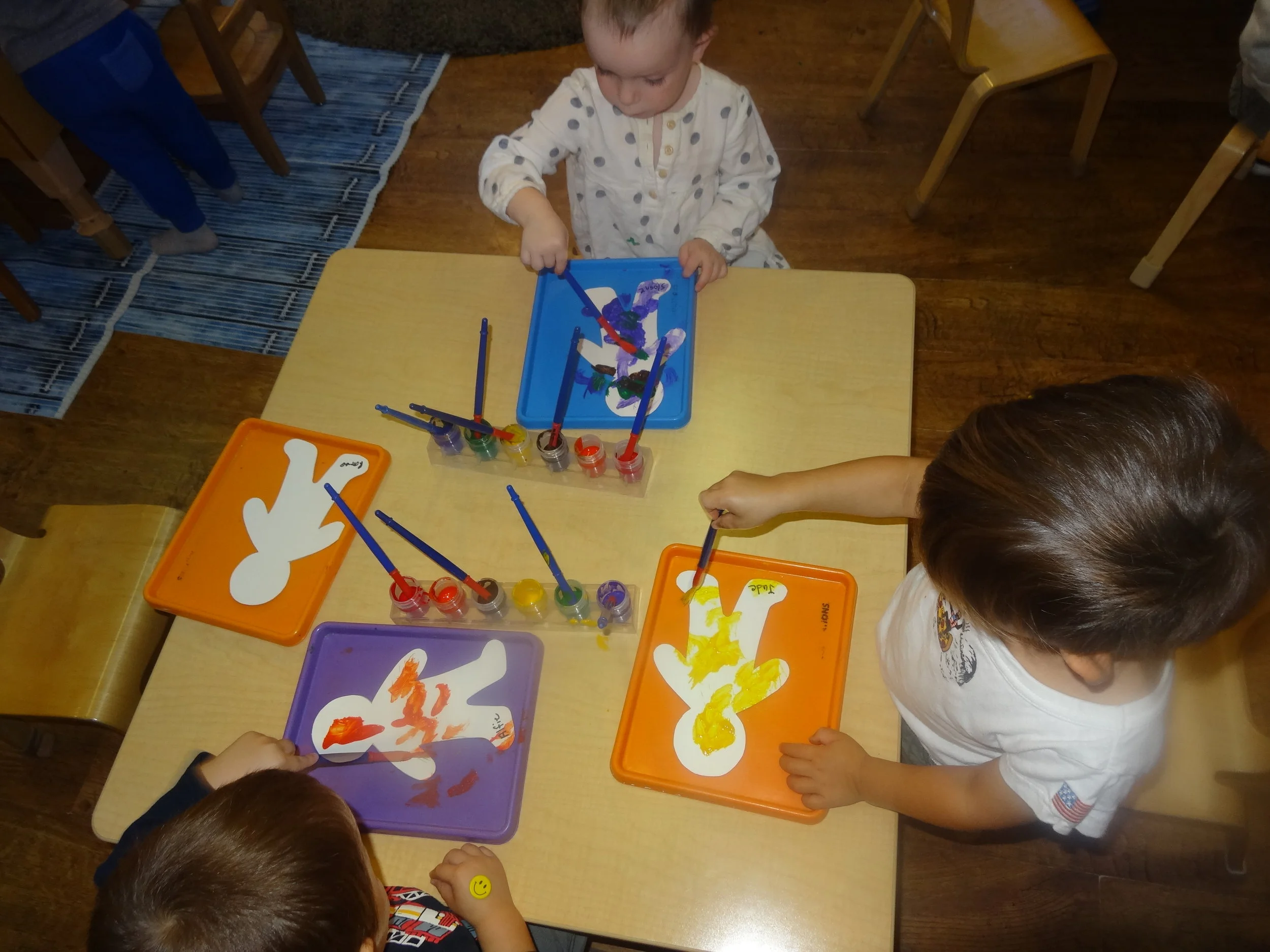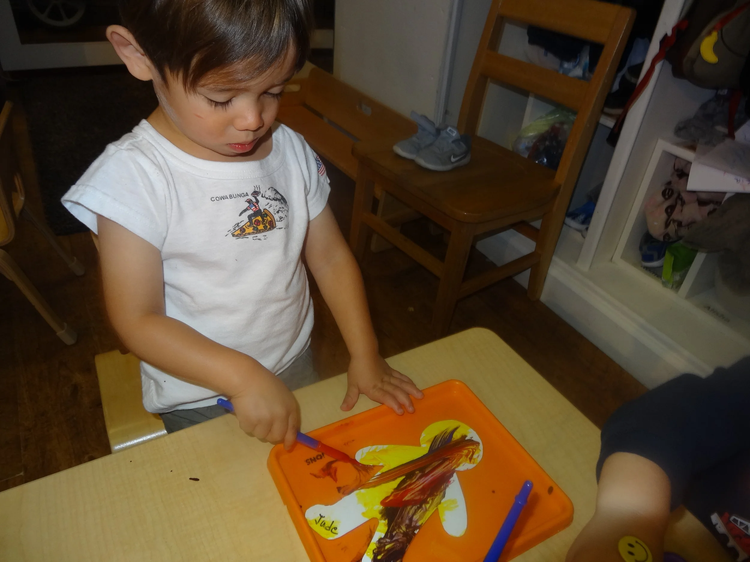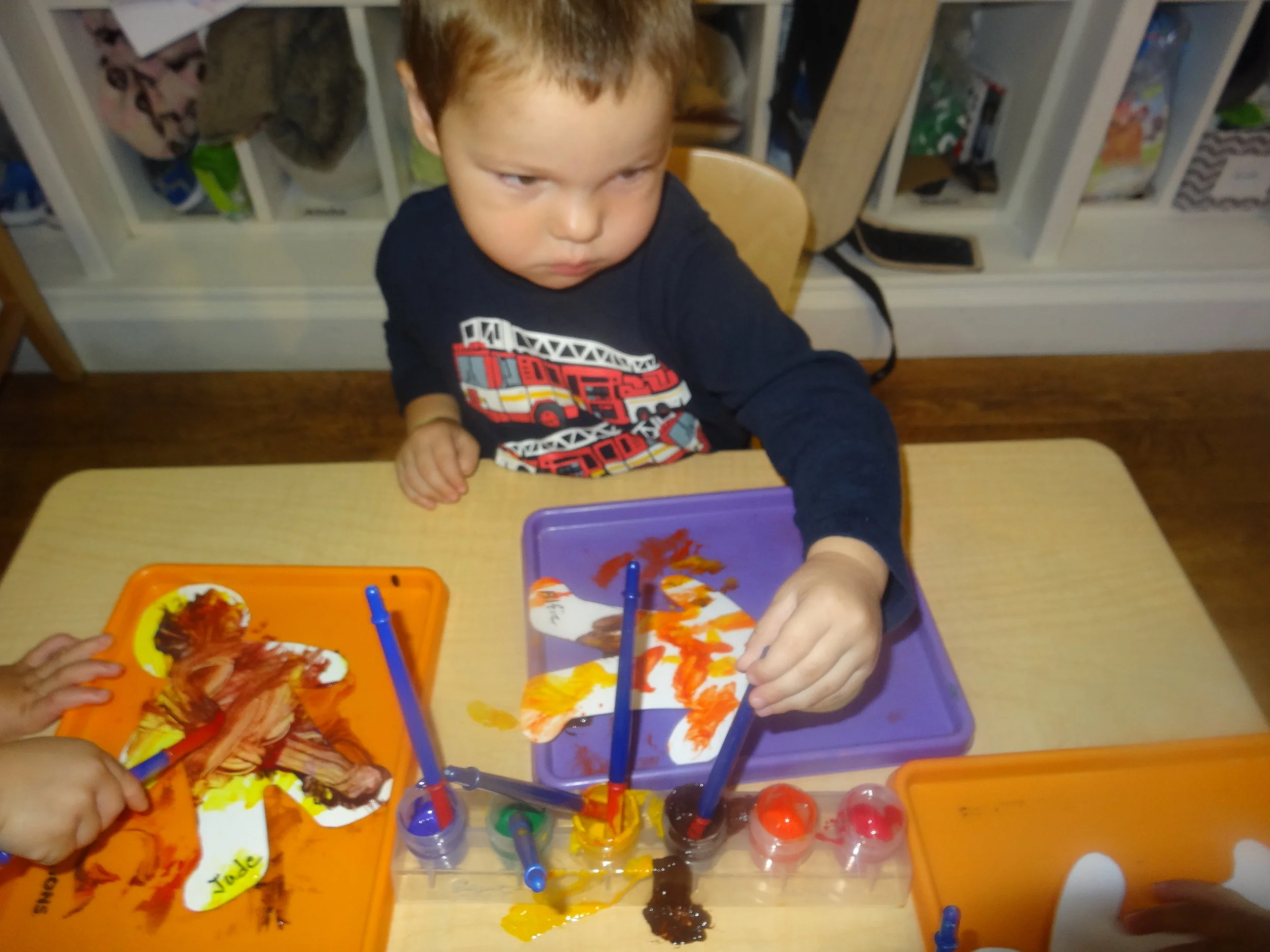 We recognized friends from last year, and the parents of our friends. Lauren found her brother through the kitchen window and realized she isn't alone. Jude loves to say hello to Romeo's dad. We have found our belly buttons every time Debbie reads Pete the Cat's Four Groovy Buttons. We also named our class pet, Blue Olly, the fish and drew a portrait of him and painted portraits of people for a morning activity.