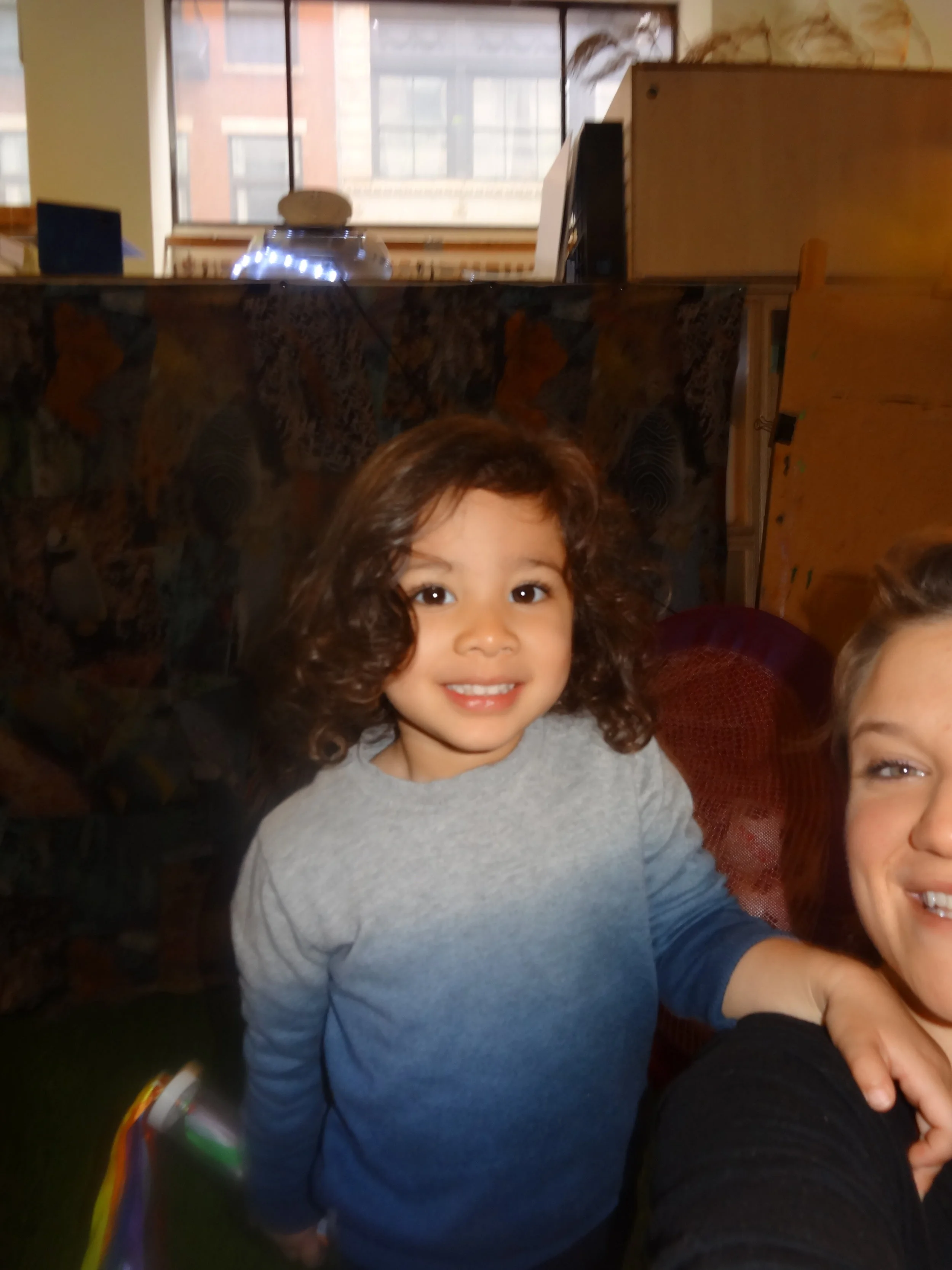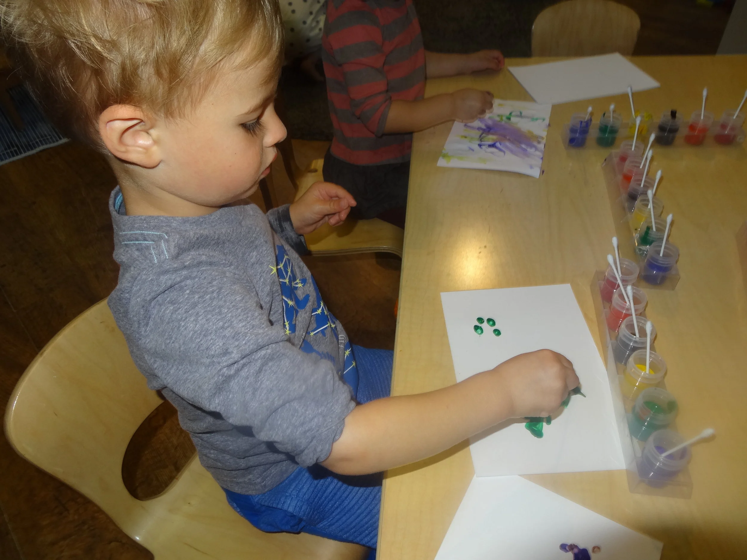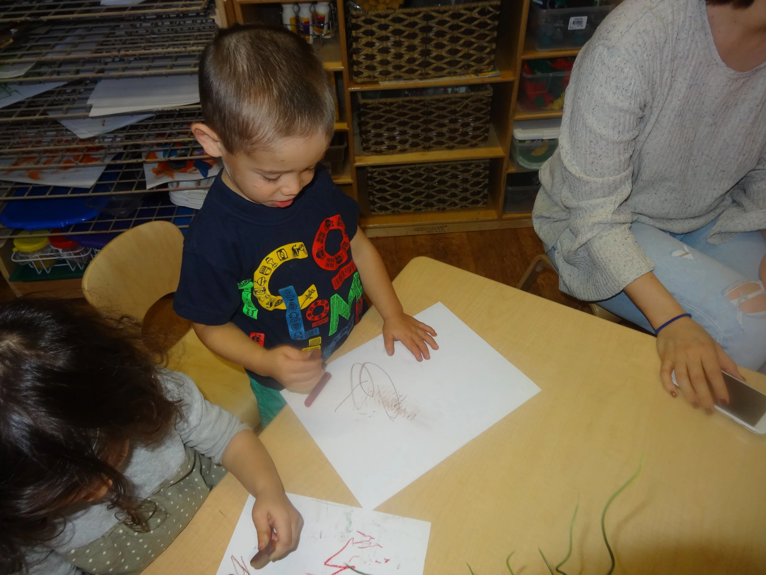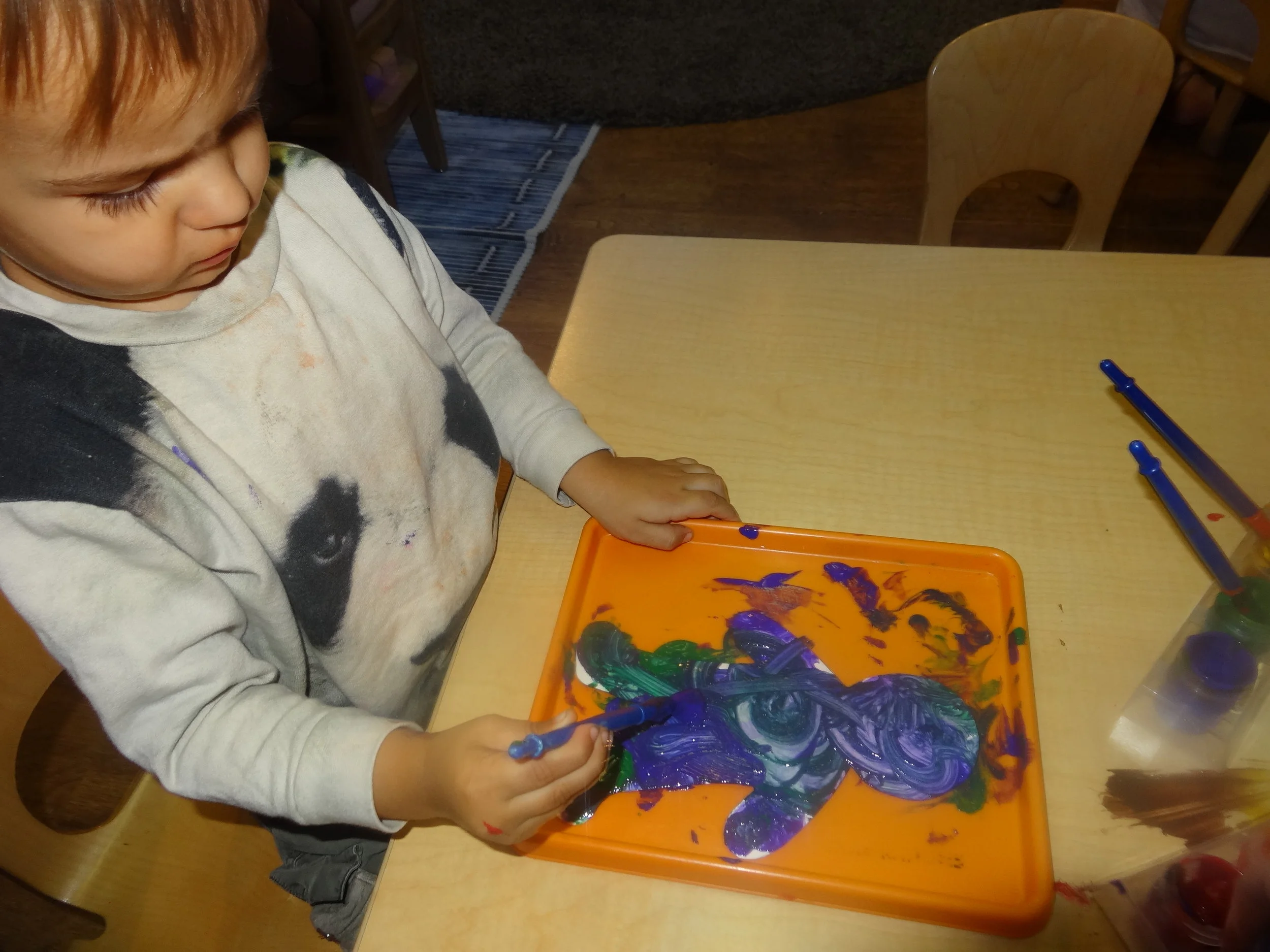We recognized friends from last year, and the parents of our friends. Lauren found her brother through the kitchen window and realized she isn't alone. Jude loves to say hello to Romeo's dad. We have found our belly buttons every time Debbie reads Pete the Cat's Four Groovy Buttons. We also named our class pet, Blue Olly, the fish and drew a portrait of him and painted portraits of people for a morning activity.