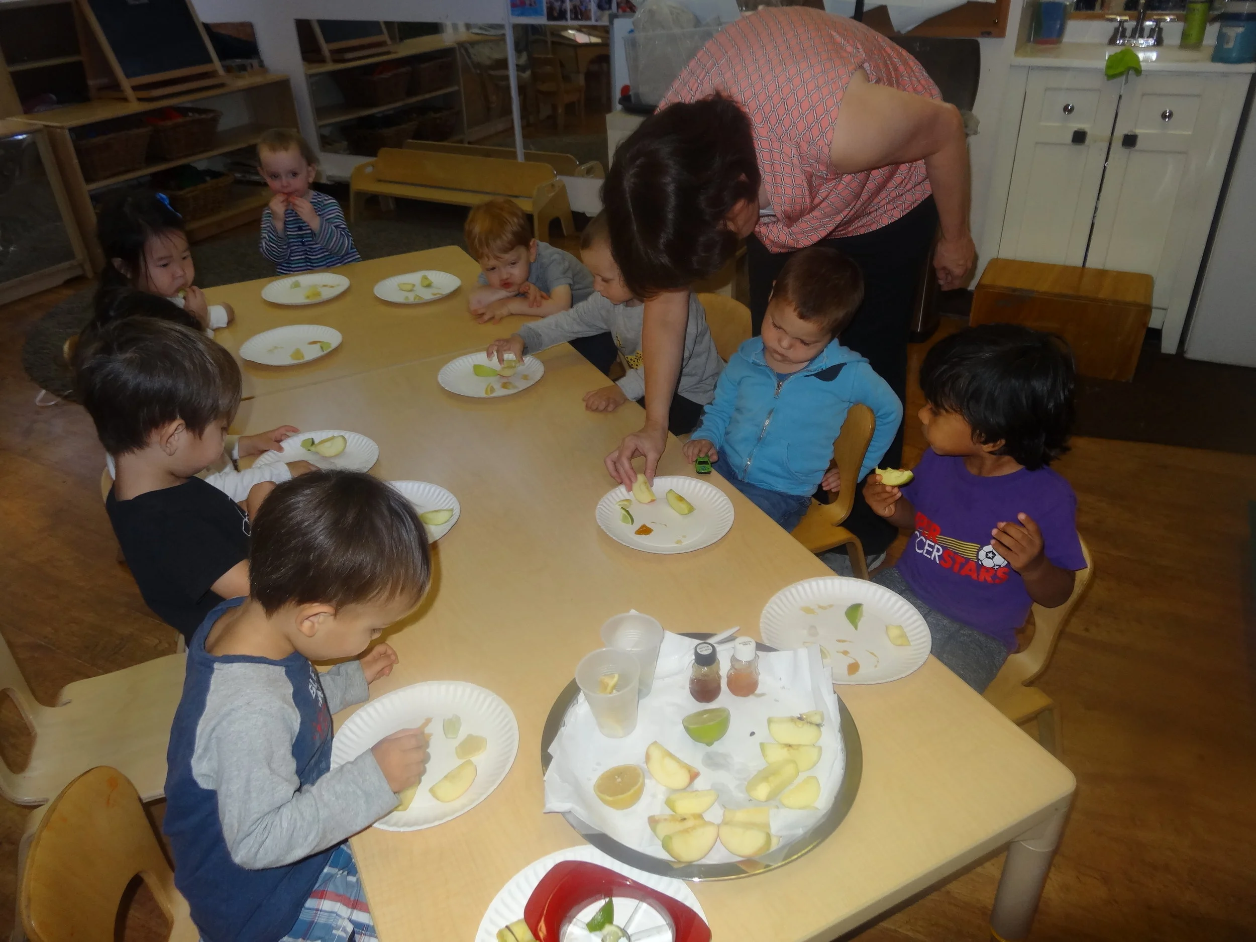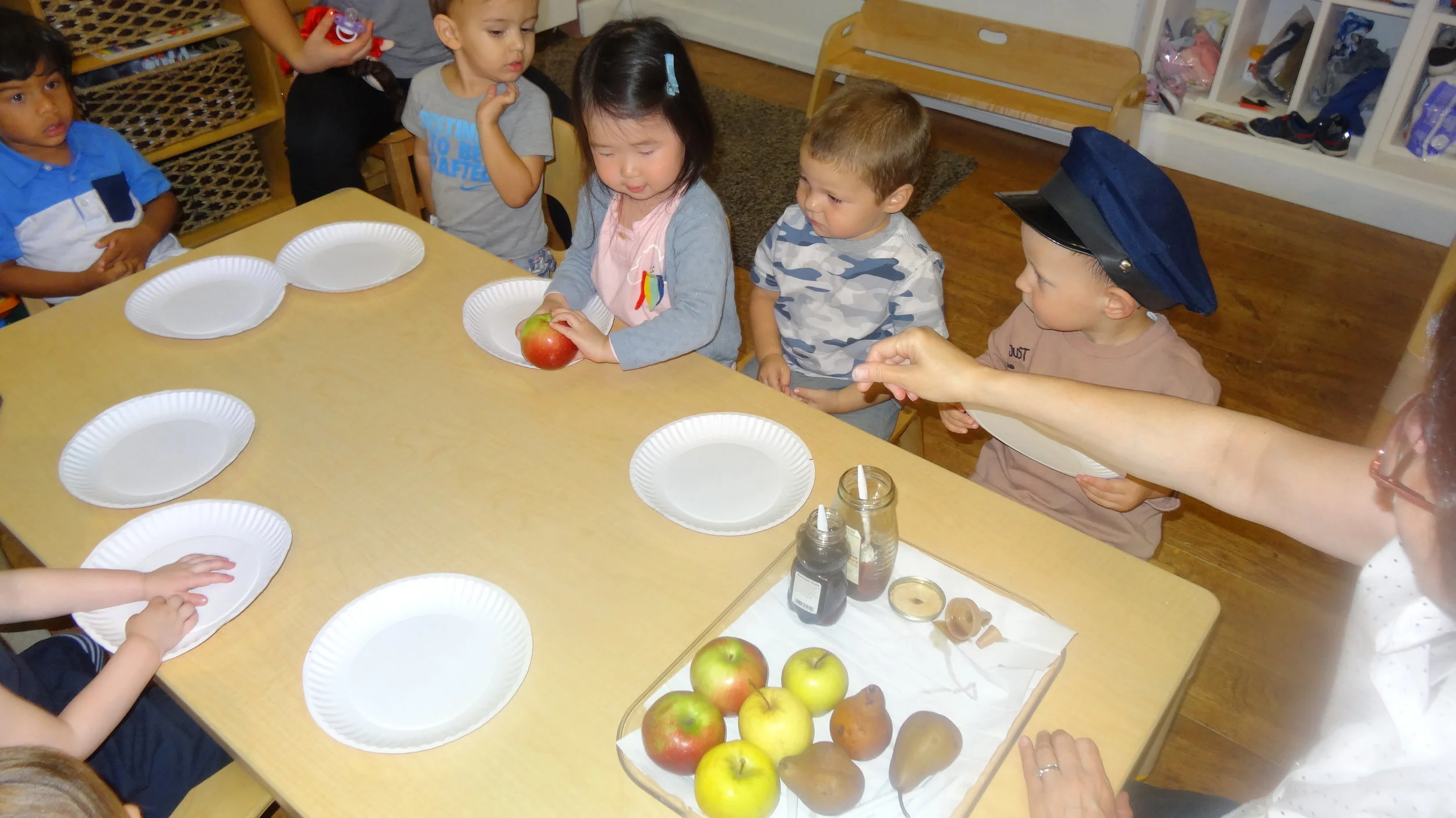 As our short second week comes to a close, we have been practicing our transitions and building new routines. Many of us are still struggling with separation from our parents, and each of us will take the time we need with our grown up until we get the hang of things. In building new routines, we started going to the gym this week! We had so much fun playing there. Eventually, we will transition again to the upstairs gym when we are ready. Also, one of our specialists, Diane, came in this week for cooking. We learned about apples and pears, seeds and stems, and different colors and flavors. In the future, we will have more fun specialists join us with new and interesting activities. Things in our world and environment are changing, just as we are changing, we now even have boxes in our classroom now for fun with our new friends! Let's see if we find a rhythm of fun in the upcoming weeks!