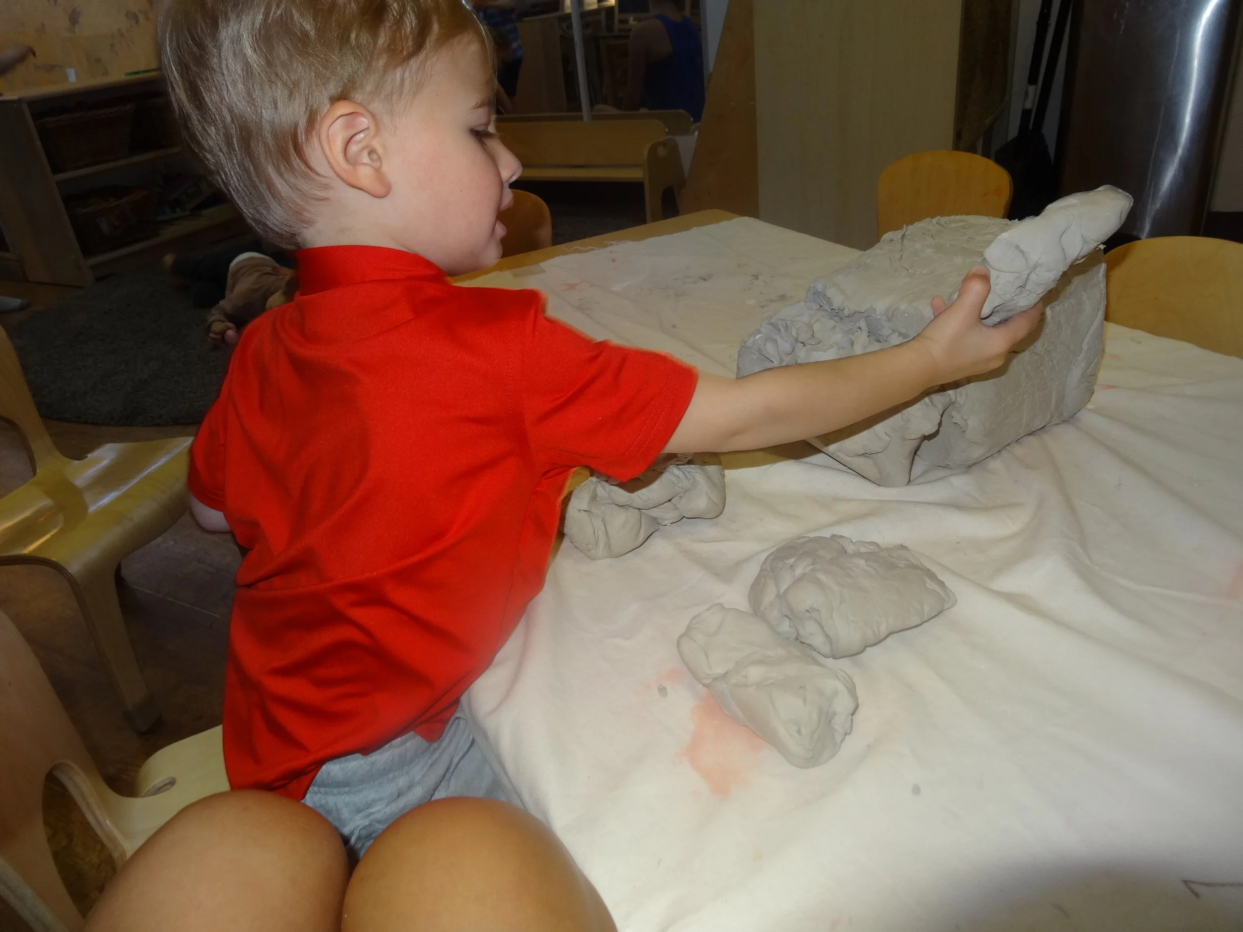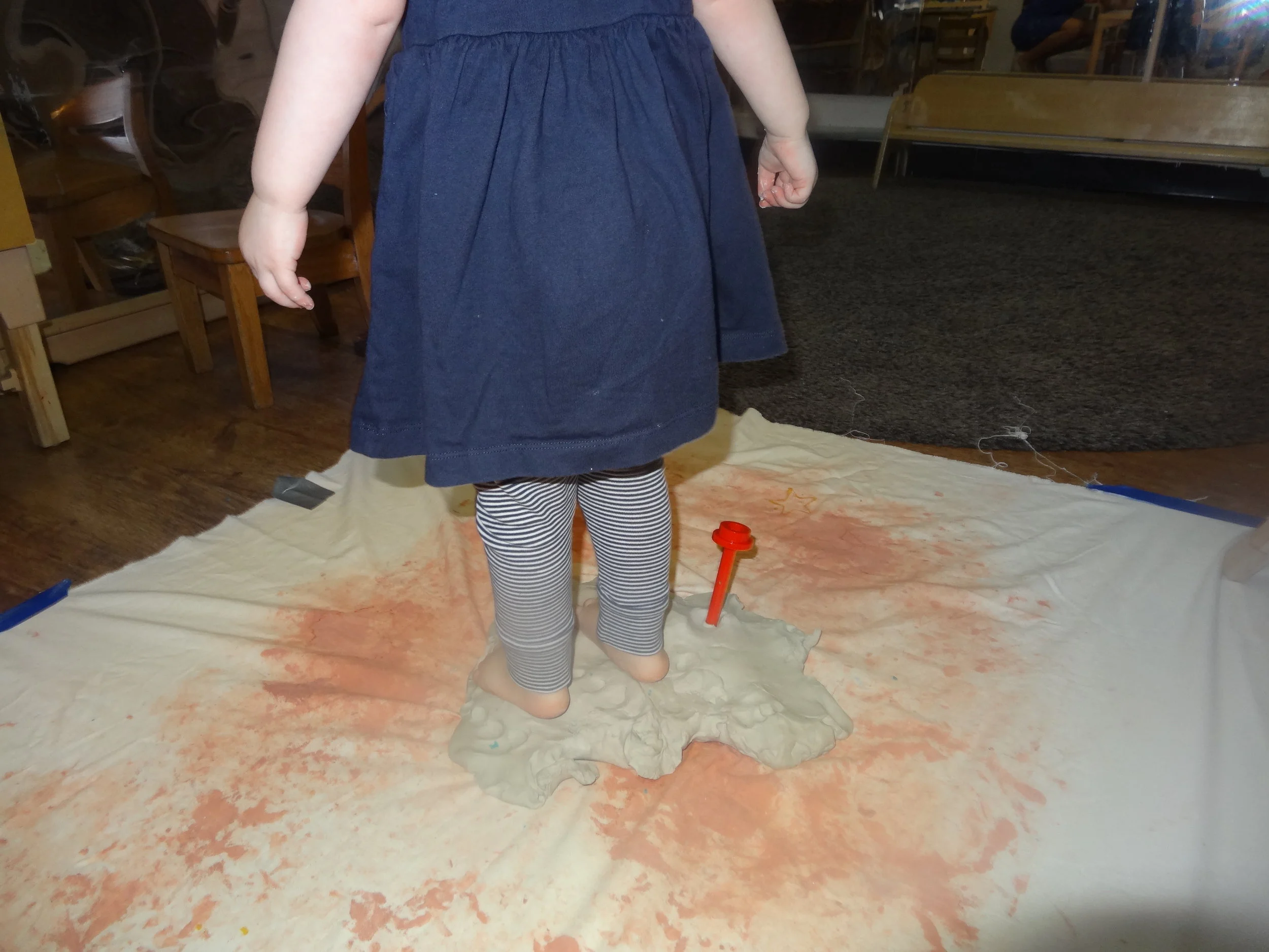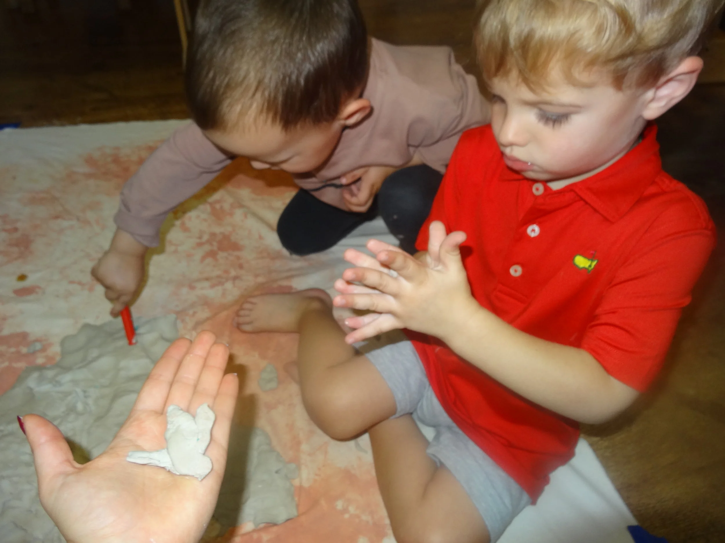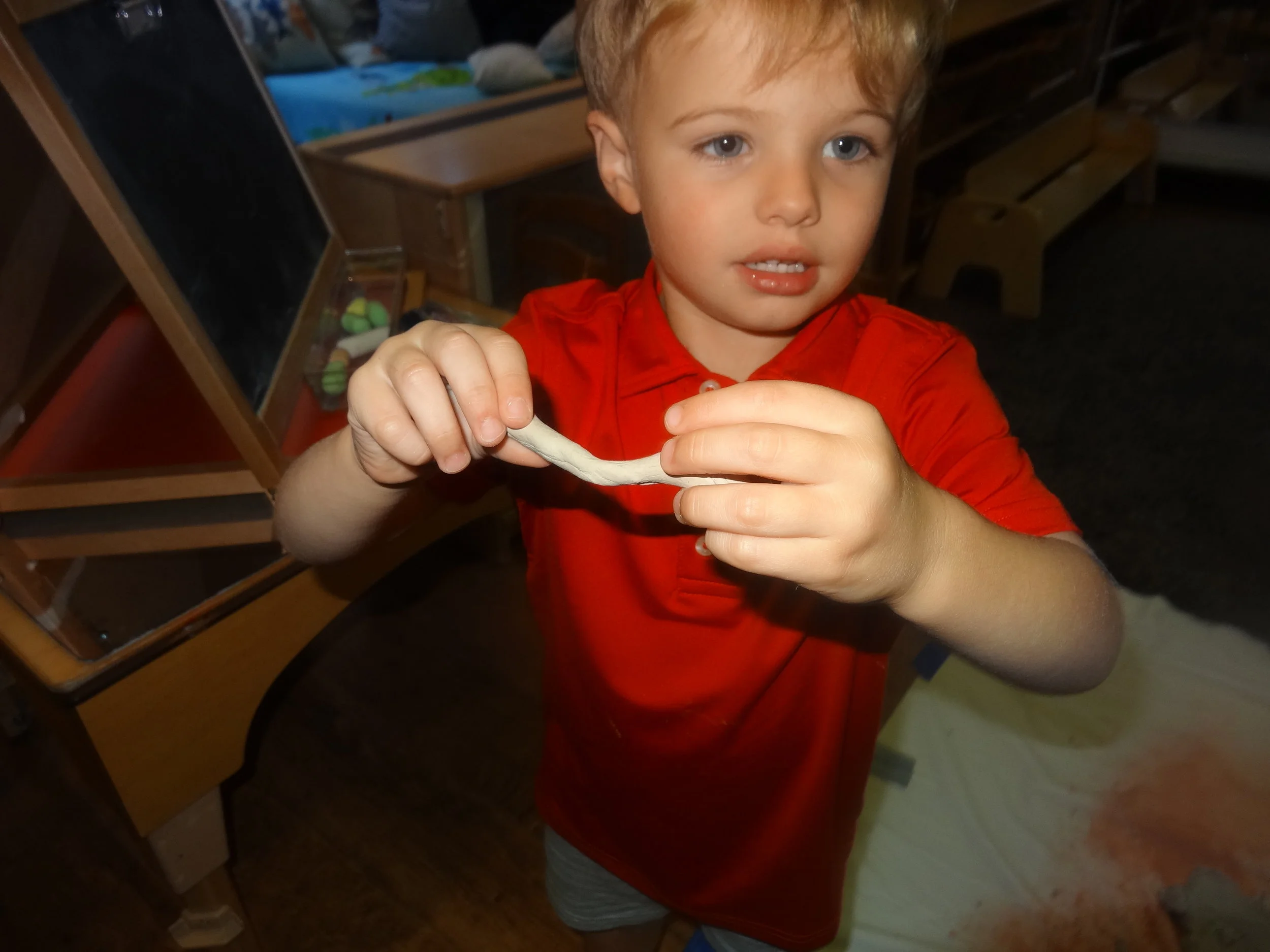 We are also working on learning cues, mirroring, and helping each other. Today, Oliver asked Hillary how to make a snake with the clay. George was able to make his own snake, so Hillary told Oliver to ask George for help. After a couple tries, George showed Oliver what to do! "It's a small snake!" said George. "Oh no!!! It split it's broken!" said Oliver. Later, when Oliver was rolling around on the floor some friends joined him in the fun. Hillary saw this free play and turned the focus into an opportunity to do yoga together. We did downward dog, happy baby, butterfly, strong plank, tree, and big sun. It was so fun and everyone liked to call out what Hillary should do with them next.