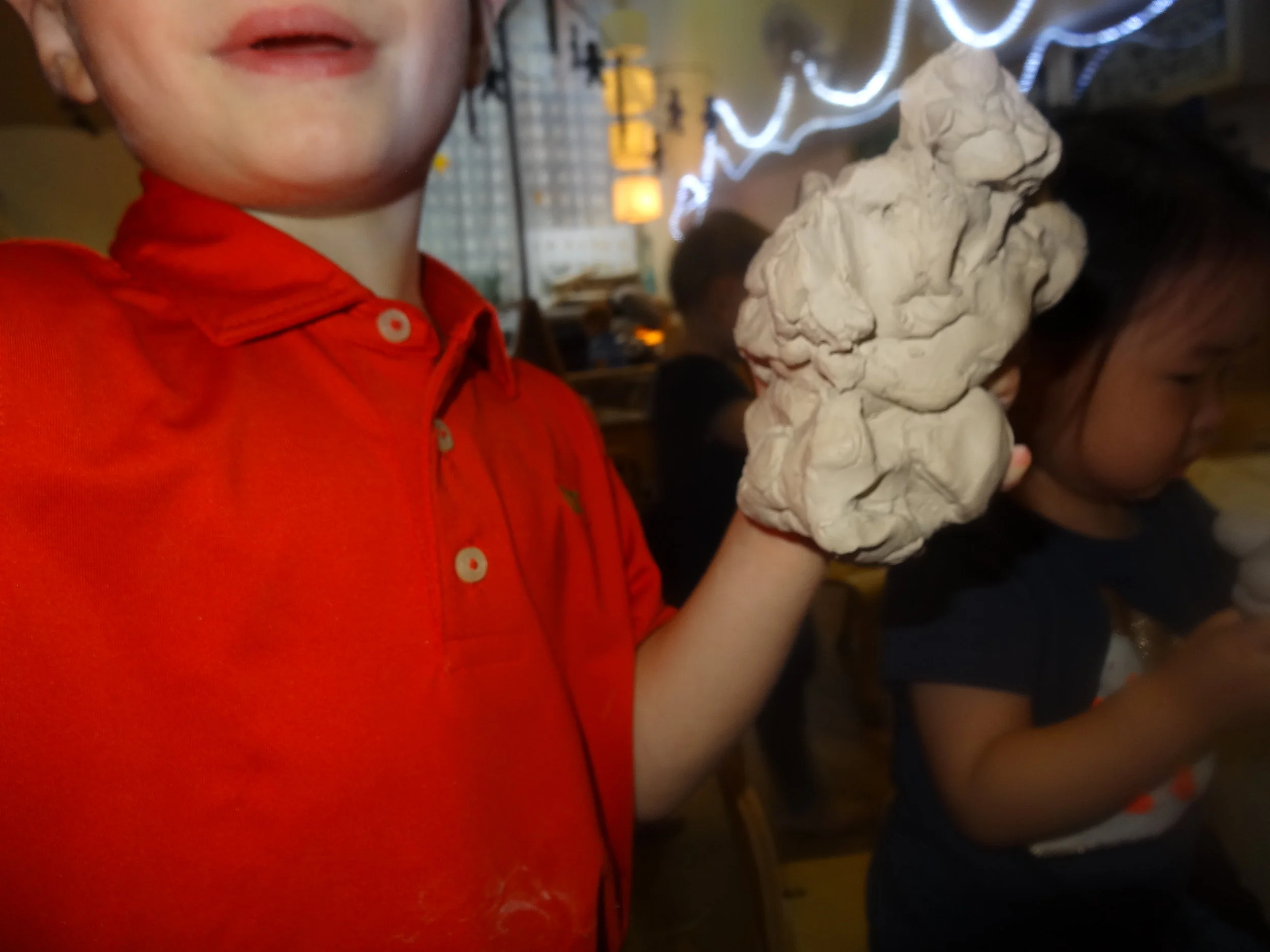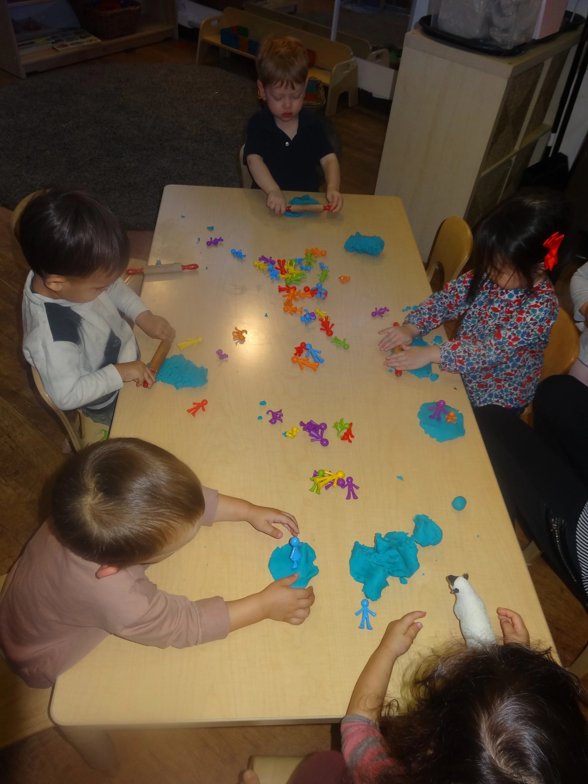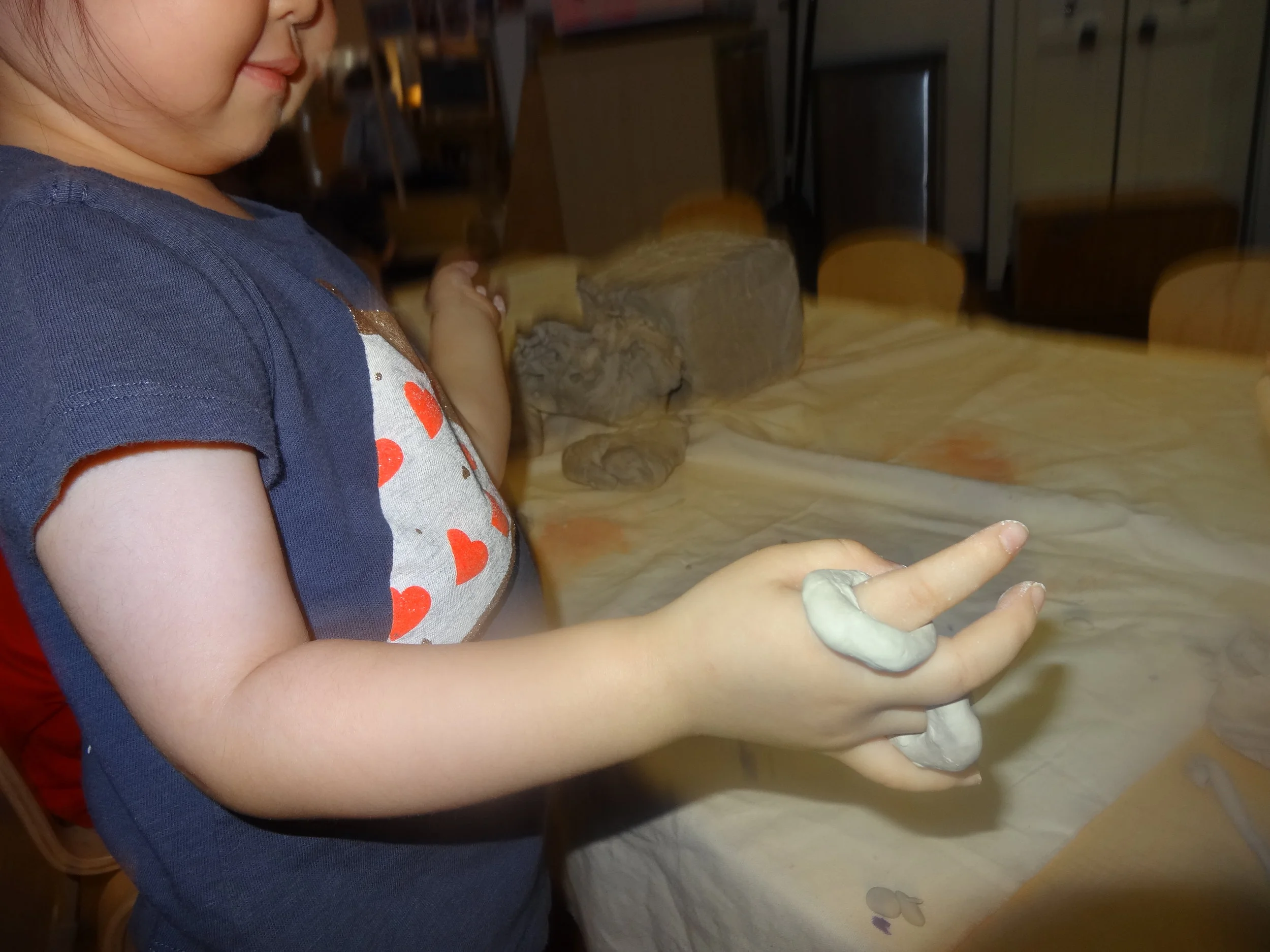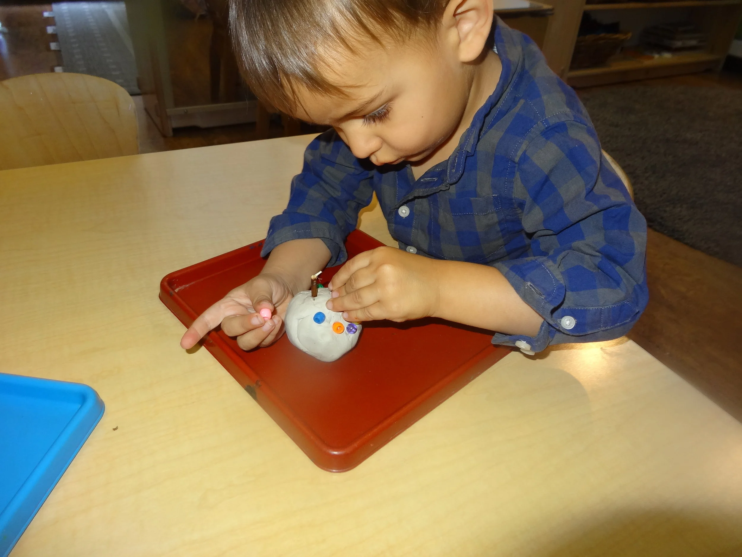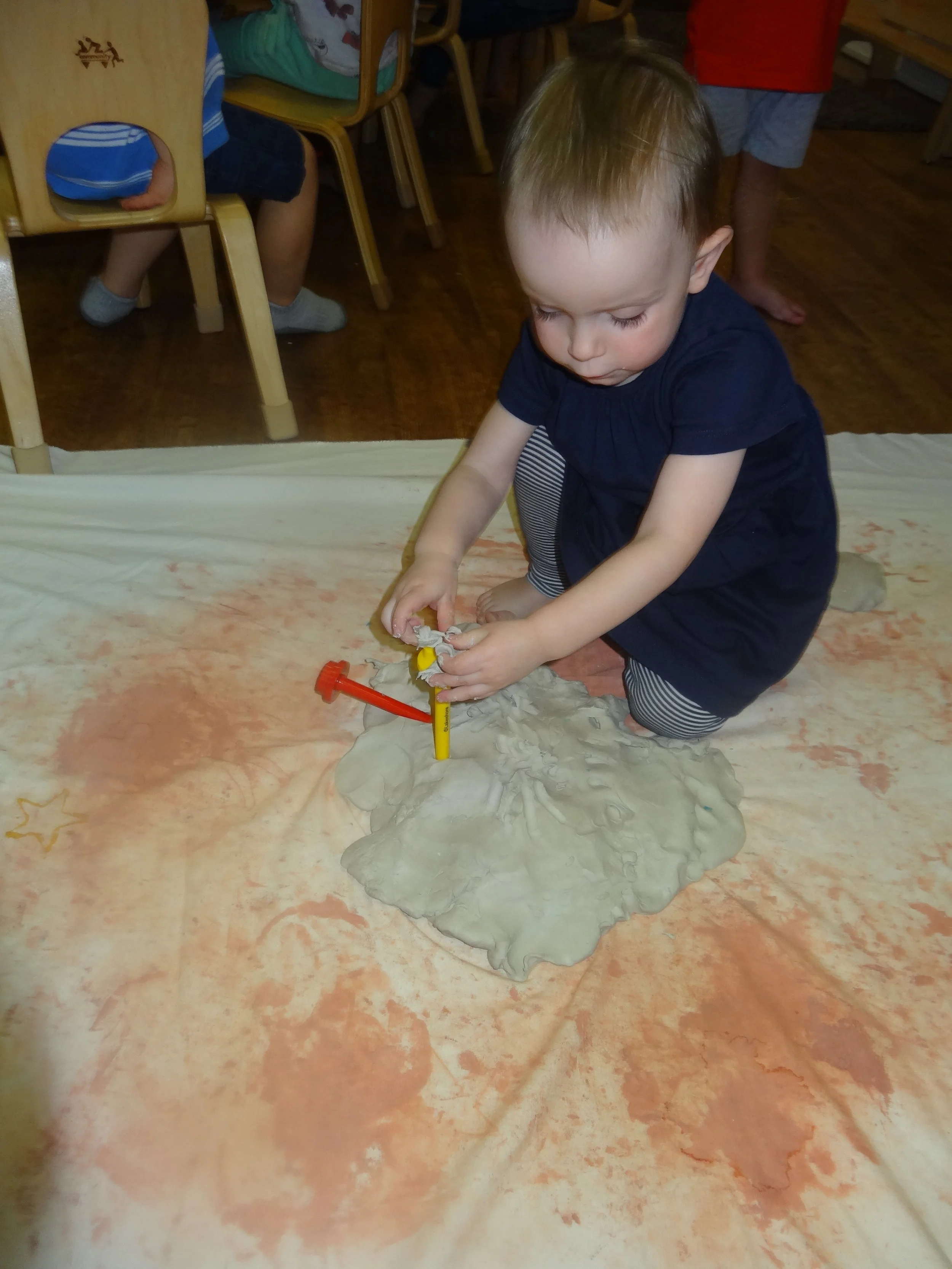 We are also working on learning cues, mirroring, and helping each other. Today, Oliver asked Hillary how to make a snake with the clay. George was able to make his own snake, so Hillary told Oliver to ask George for help. After a couple tries, George showed Oliver what to do! "It's a small snake!" said George. "Oh no!!! It split it's broken!" said Oliver. Later, when Oliver was rolling around on the floor some friends joined him in the fun. Hillary saw this free play and turned the focus into an opportunity to do yoga together. We did downward dog, happy baby, butterfly, strong plank, tree, and big sun. It was so fun and everyone liked to call out what Hillary should do with them next.