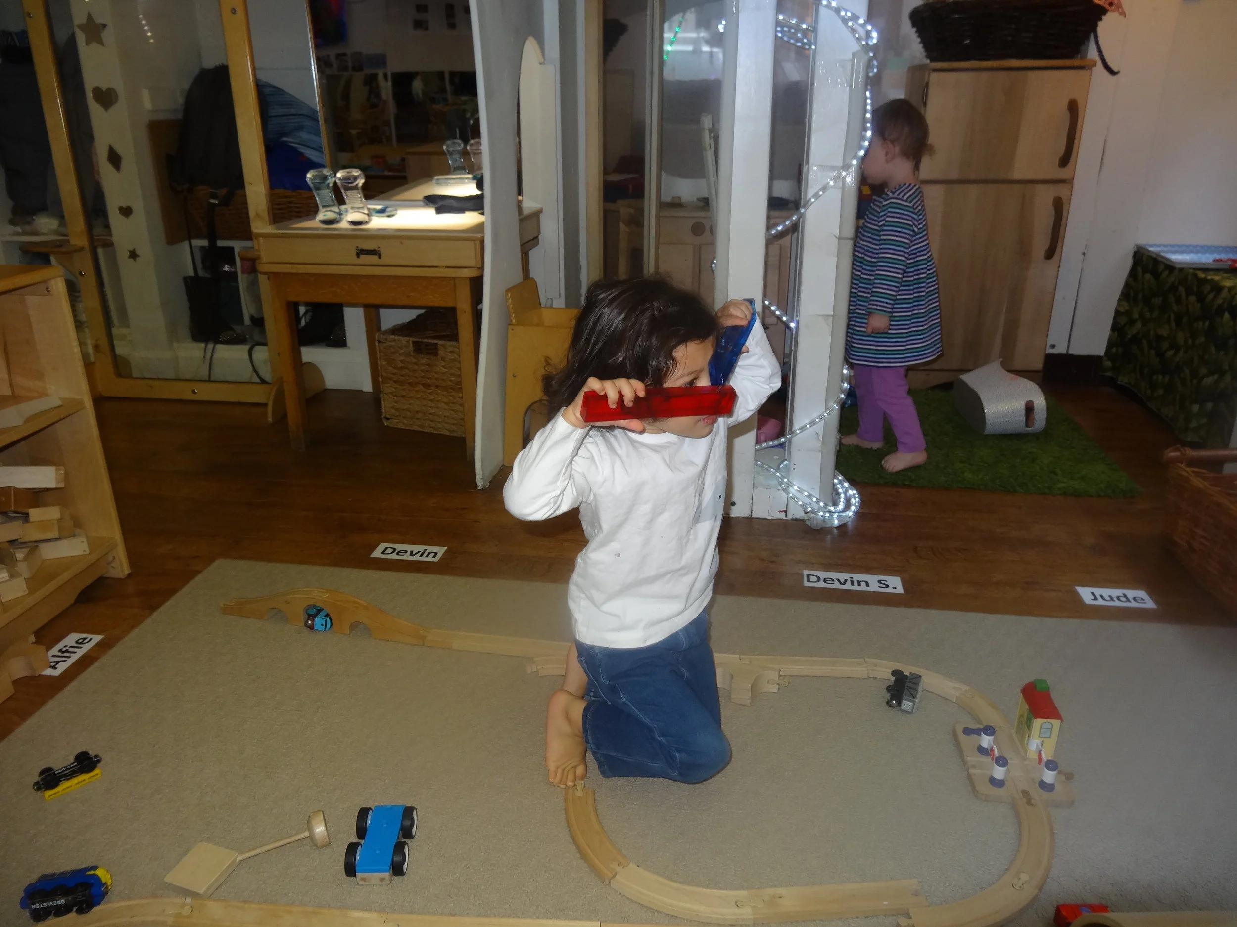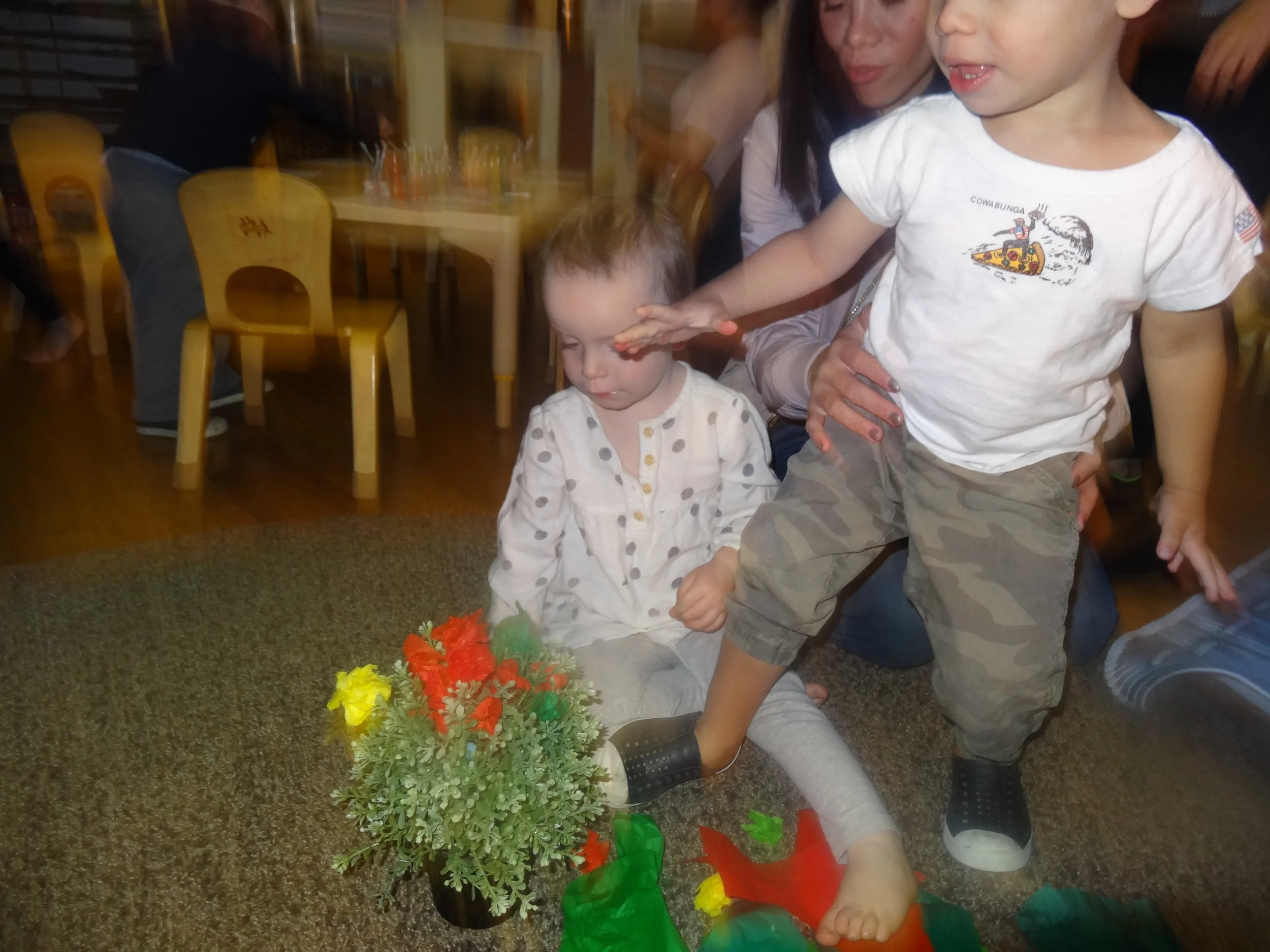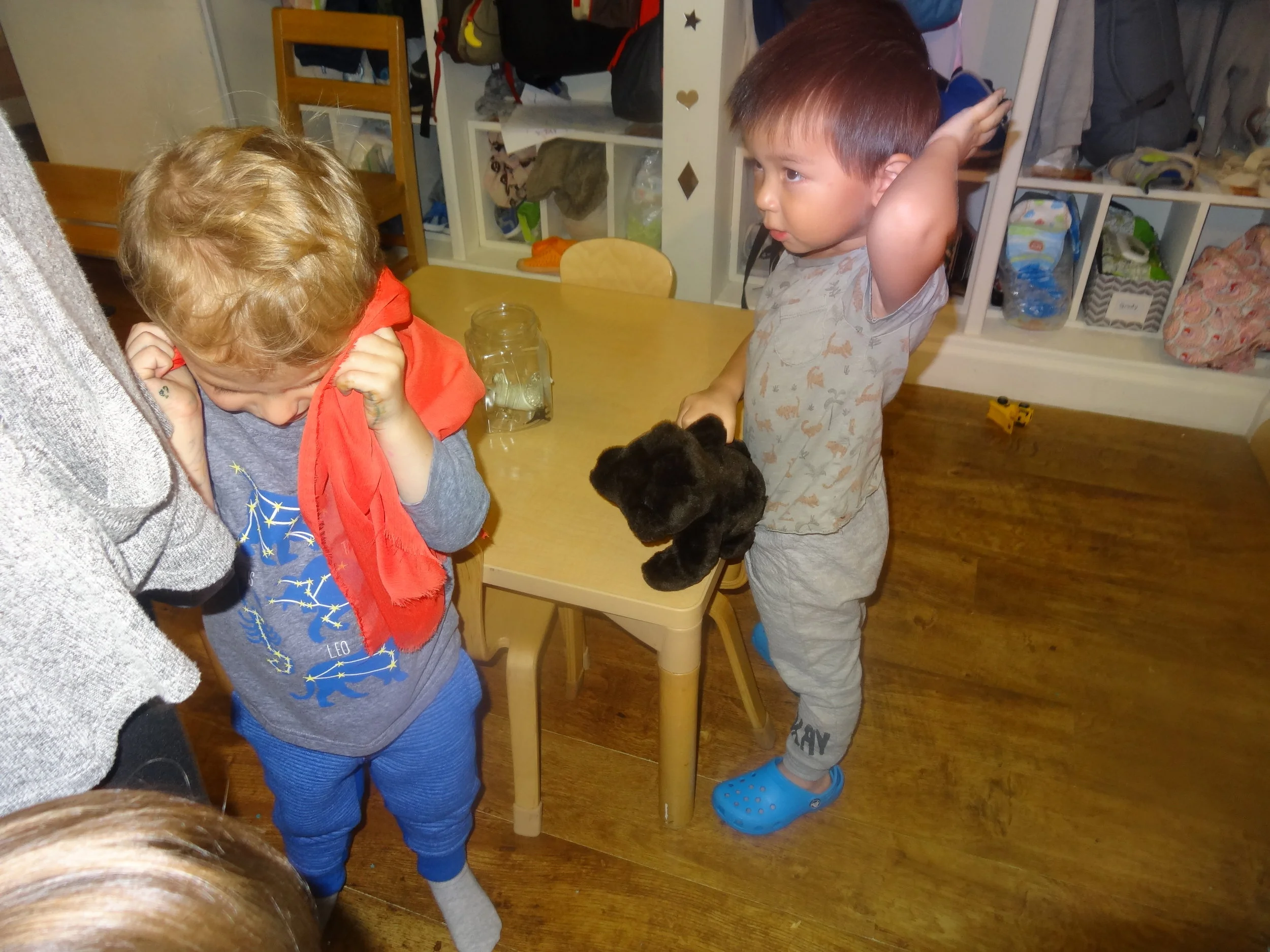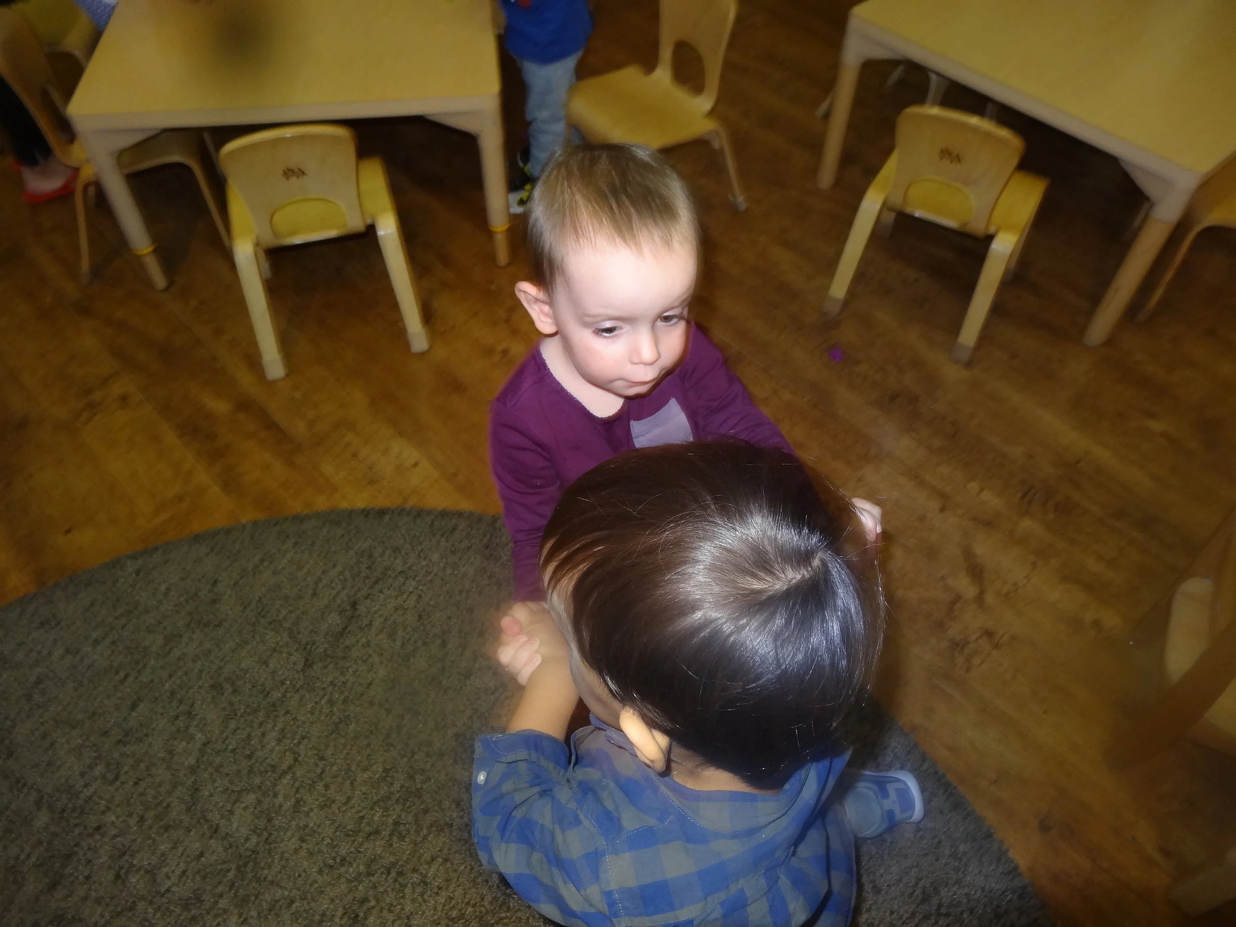 This week there has been a lot of observing and following in our class. We are looking at Debbie, Hillary, our parents, and friends for ideas, rules, emotions and behaviors. We see our classmates sit down to eat and we know that its time for snack. Oliver saw Devin put on a firefighter hat, so he put on a police hat, then Alisha and Grady put on hats too. Devin S. saw Debbie and Jude cleaning and wanted to be a helper, too. Cole loves to watch his friends do fun activities like drawing on the easel and playing with play dough before trying them out himself. Romeo never forgets to say no to Debbie and Hillary when he wants to do something all by himself!