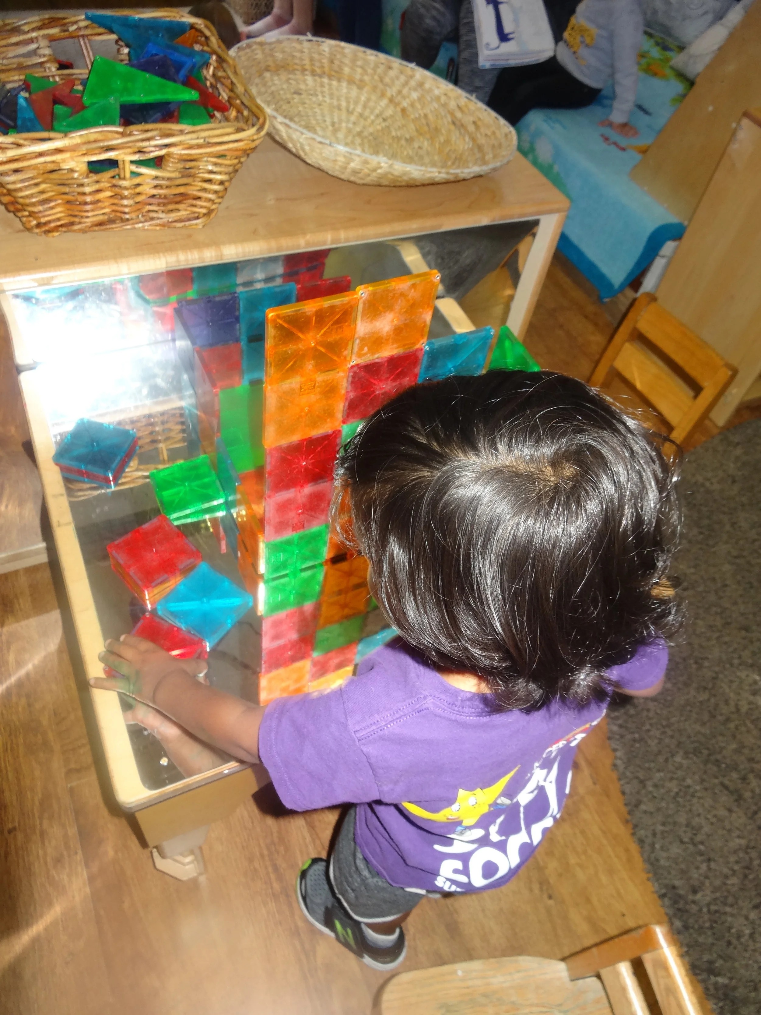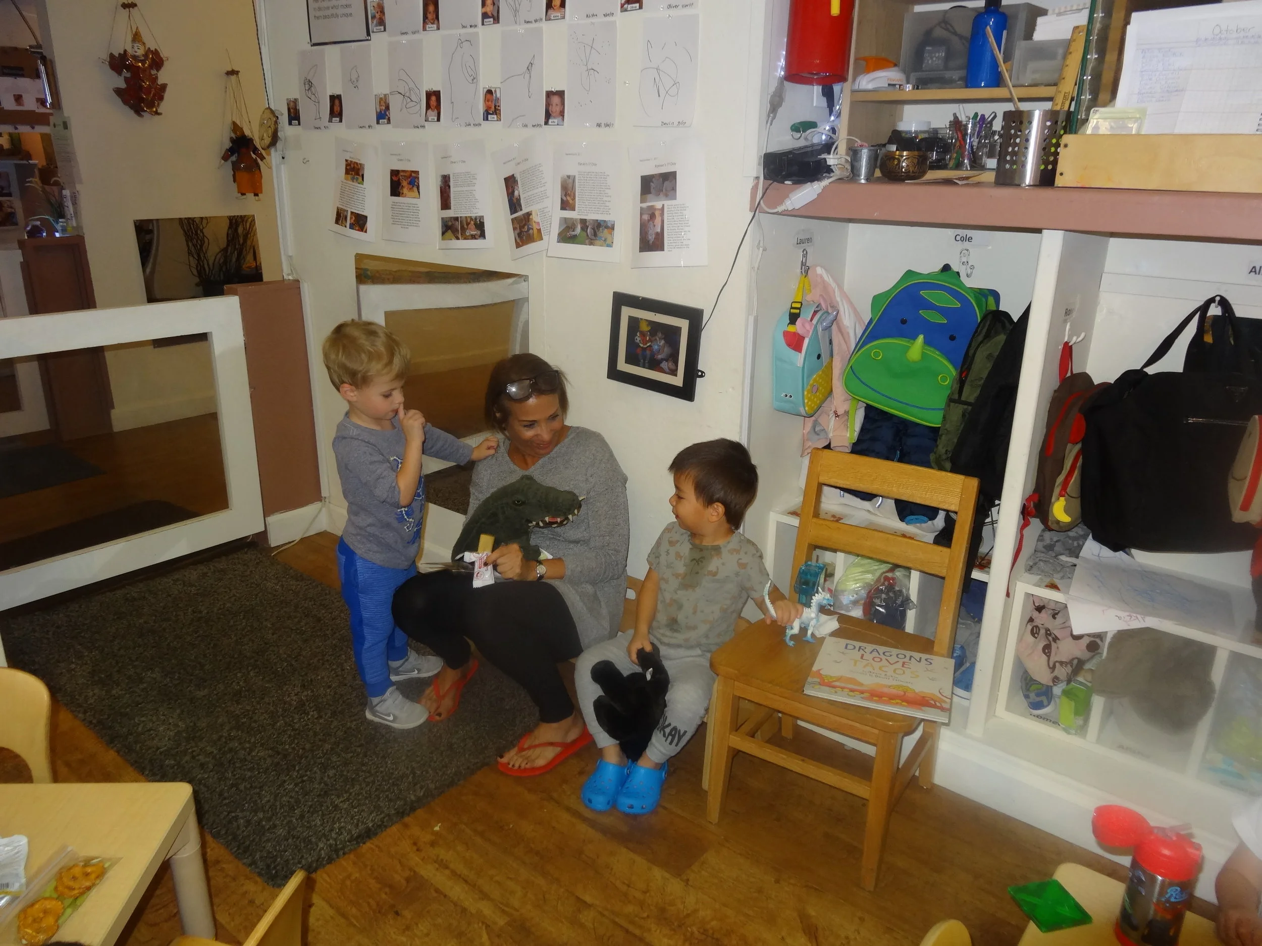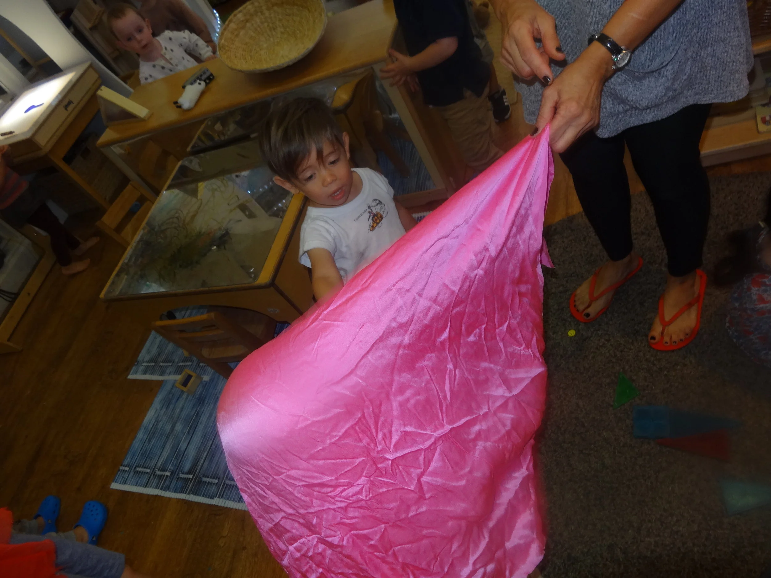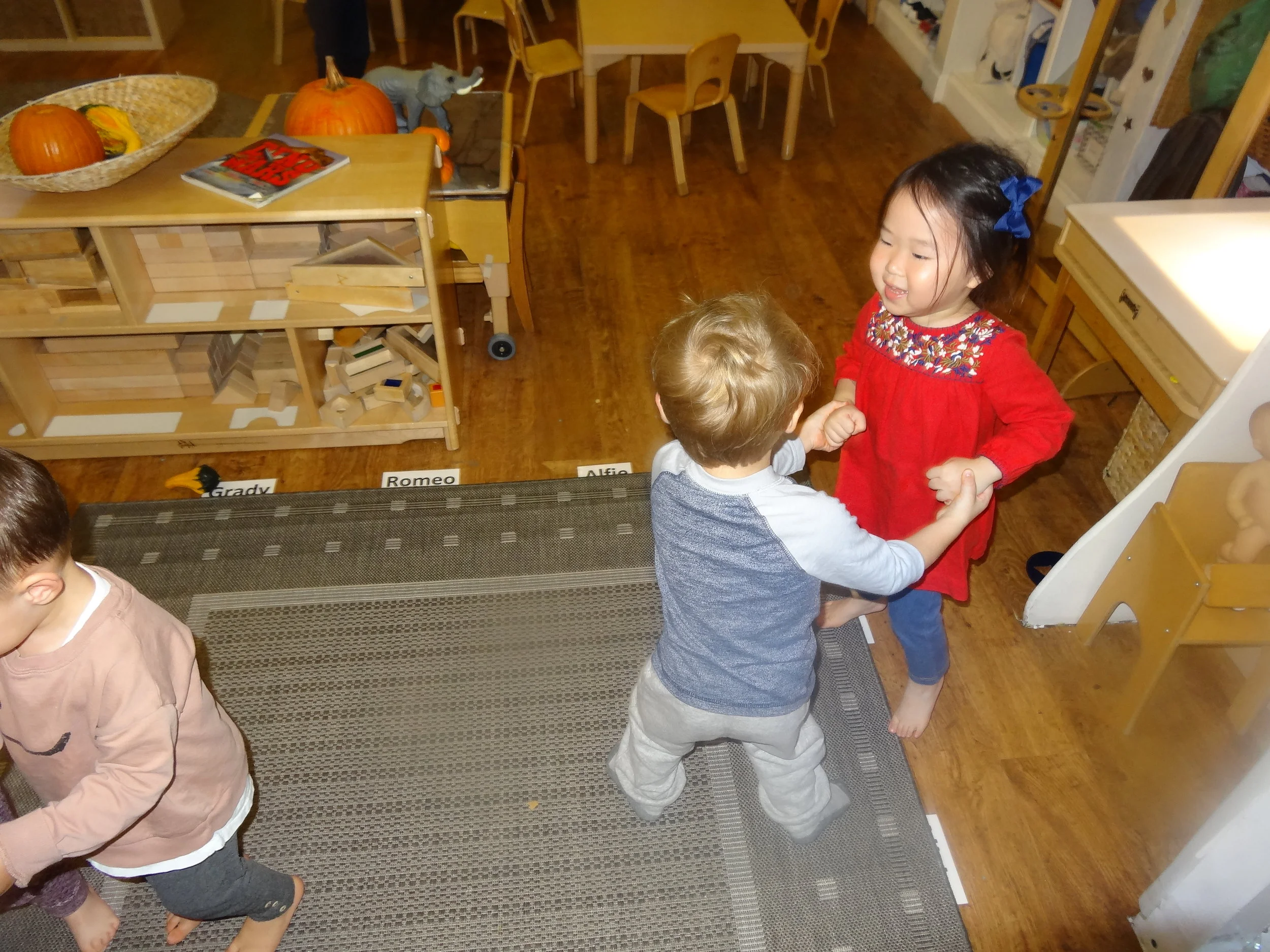 Taking a deeper look, we are still practicing transitions and separation, learning each other's names, and taking turns. Our parents are spending less and less time with us and we are spending more time playing alone and with our teachers and each other. Clapping and singing songs while lining up has been helpful in getting us organized from the classroom to the gym. We put our photos in our slots on the attendance poster to learn names and faces during morning meeting. This week, Oliver said, "He is my friend!" "Who is your friend, Oliver?" "Devin!," he said with a big smile. "Devin are you friends with Oliver?" He nodded his head with a quiet "yes" and a big smile, too. As a team, we are cleaning up together, building blocks and putting together puzzles, and helping our teachers with tasks. Devi likes to help clean up, especially washing the tables. Cole was a team player when he helped Debbie pass out the cookies and lemonade at the Bake Sale yesterday. Today, Lauren, Sloane, Alisha, and Jude took turns trying on and playing in the pink and green skirt. Romeo shared a car with Alfie when Alfie was feeling sad, and George and Grady played together in the water table. Everyone has loved saying the phrases, "No," "No way, Jose!," "See you later," and "I want .... " along with naming colors, counting, and singing "5 Speckled Frogs" and "Two Little Blackbirds." The next weeks will get easier and easier as we continue to find a groove and become more comfortable at school and with each other.