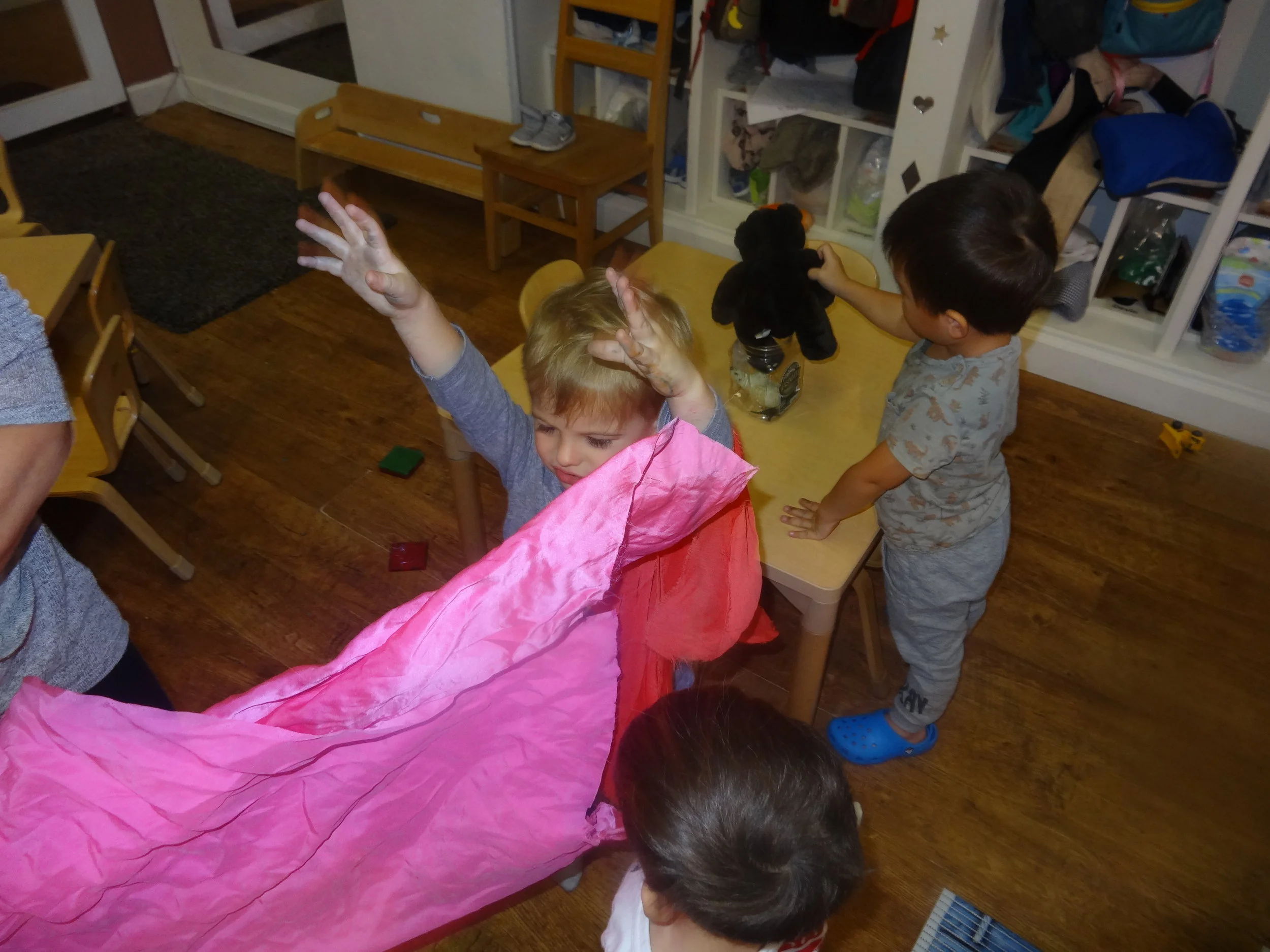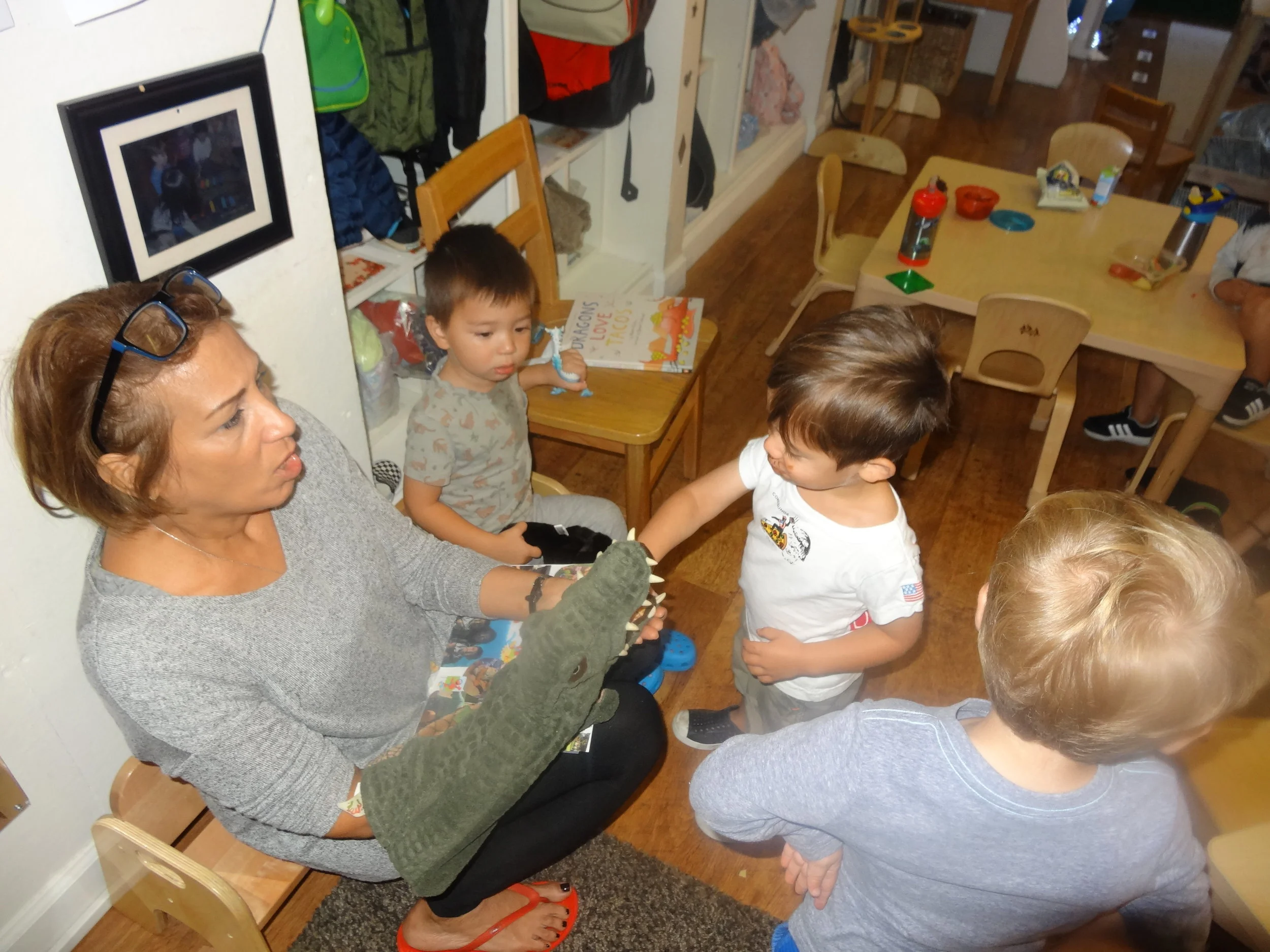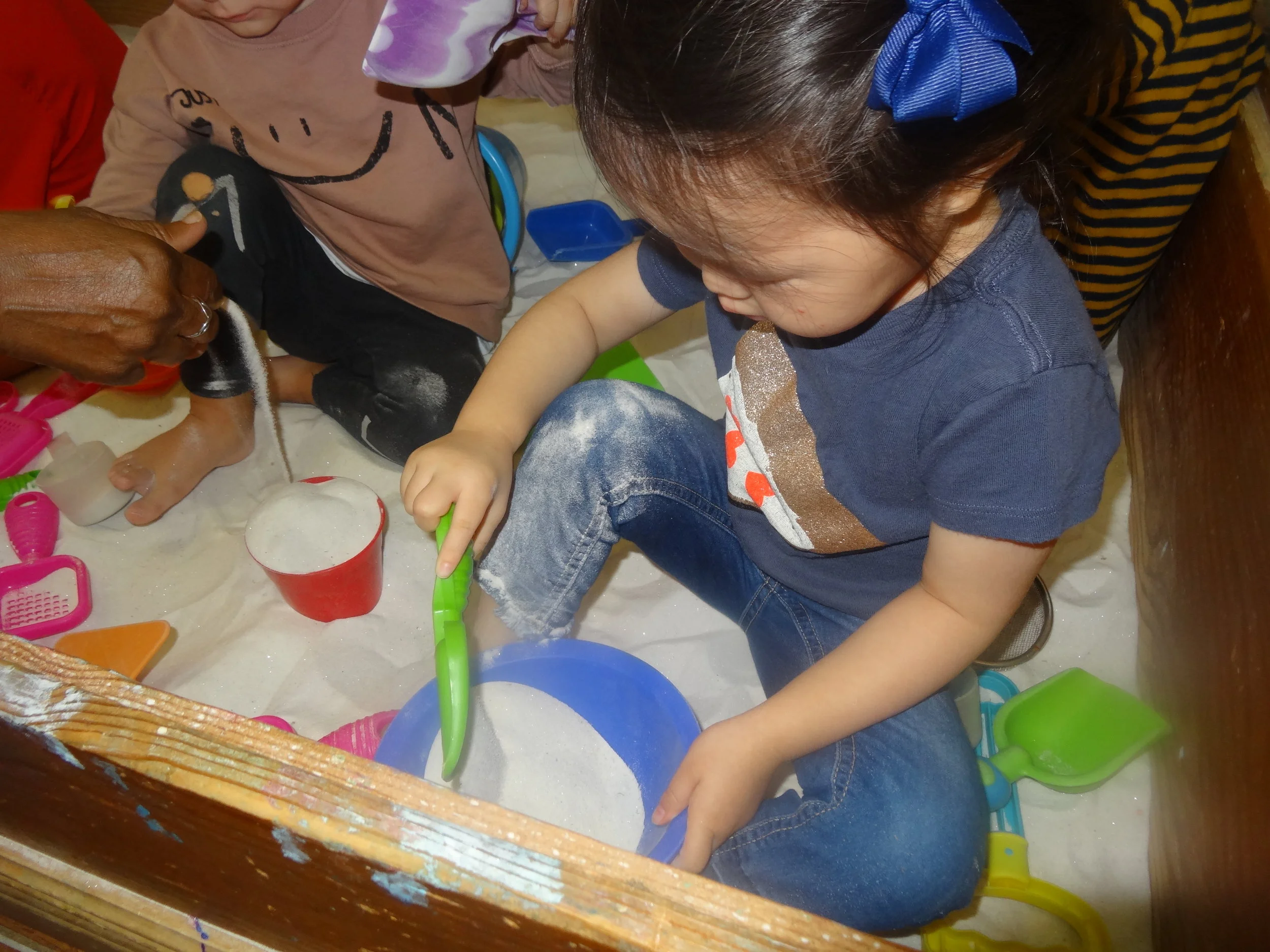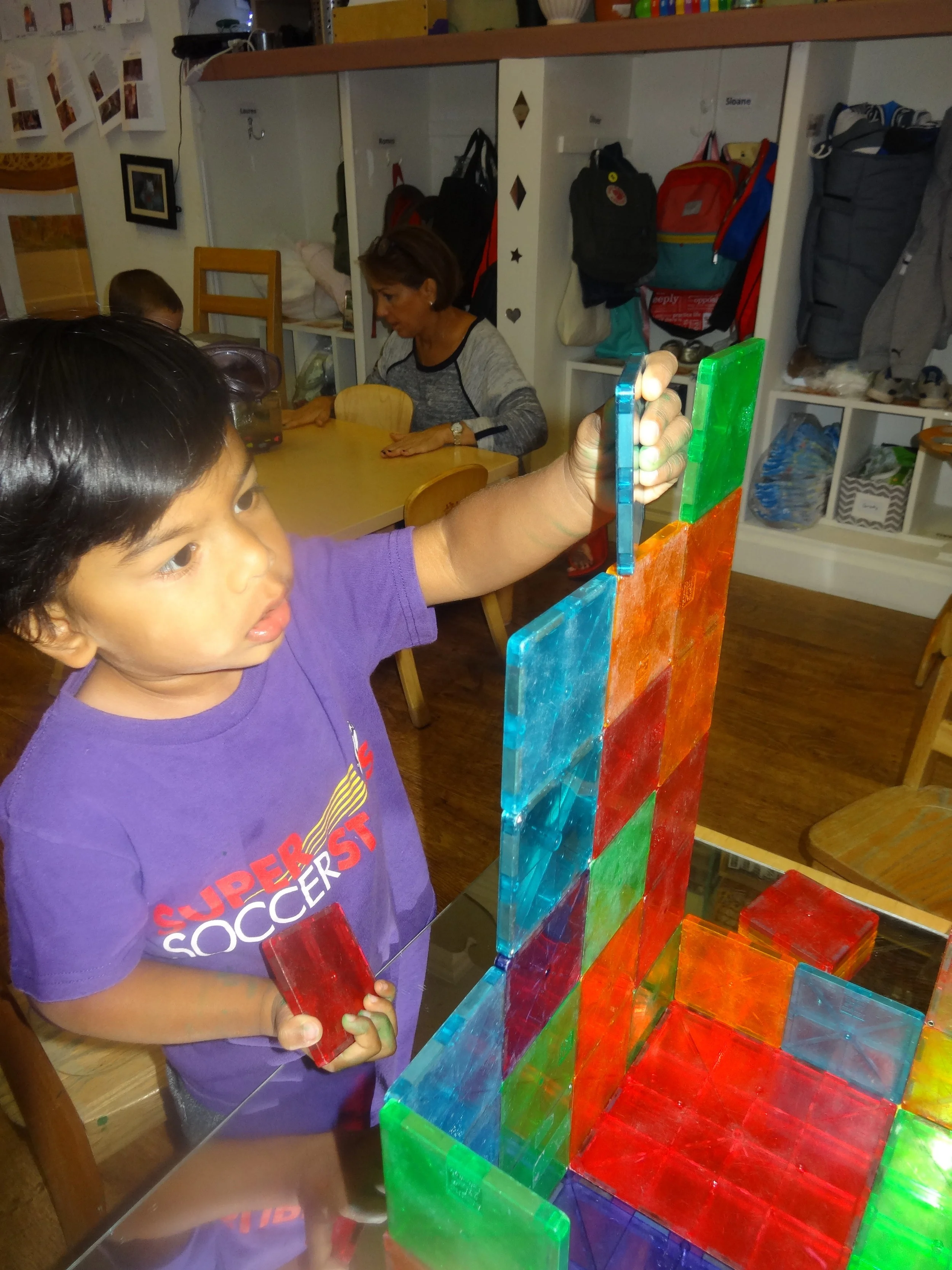 Taking a deeper look, we are still practicing transitions and separation, learning each other's names, and taking turns. Our parents are spending less and less time with us and we are spending more time playing alone and with our teachers and each other. Clapping and singing songs while lining up has been helpful in getting us organized from the classroom to the gym. We put our photos in our slots on the attendance poster to learn names and faces during morning meeting. This week, Oliver said, "He is my friend!" "Who is your friend, Oliver?" "Devin!," he said with a big smile. "Devin are you friends with Oliver?" He nodded his head with a quiet "yes" and a big smile, too. As a team, we are cleaning up together, building blocks and putting together puzzles, and helping our teachers with tasks. Devi likes to help clean up, especially washing the tables. Cole was a team player when he helped Debbie pass out the cookies and lemonade at the Bake Sale yesterday. Today, Lauren, Sloane, Alisha, and Jude took turns trying on and playing in the pink and green skirt. Romeo shared a car with Alfie when Alfie was feeling sad, and George and Grady played together in the water table. Everyone has loved saying the phrases, "No," "No way, Jose!," "See you later," and "I want .... " along with naming colors, counting, and singing "5 Speckled Frogs" and "Two Little Blackbirds." The next weeks will get easier and easier as we continue to find a groove and become more comfortable at school and with each other.