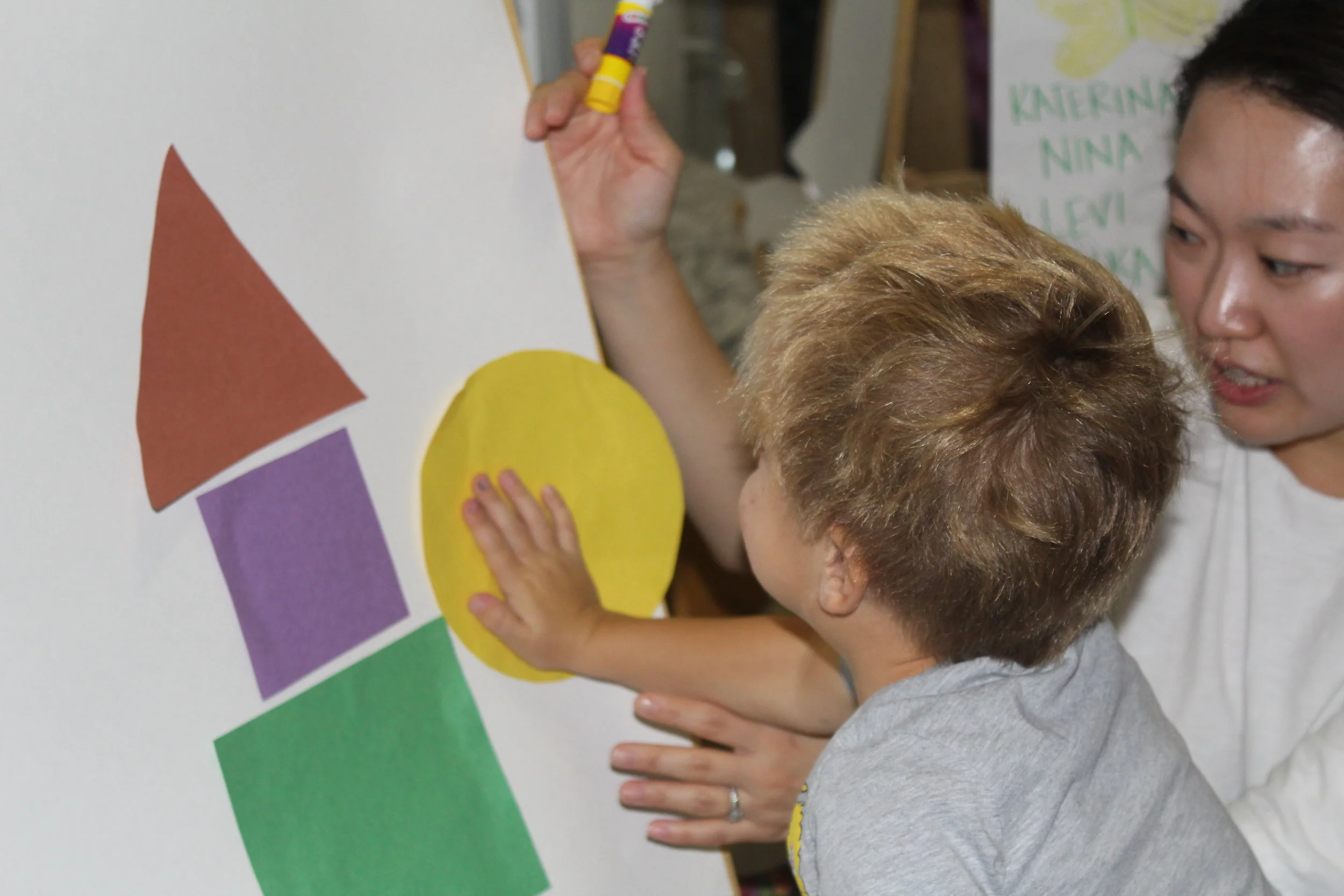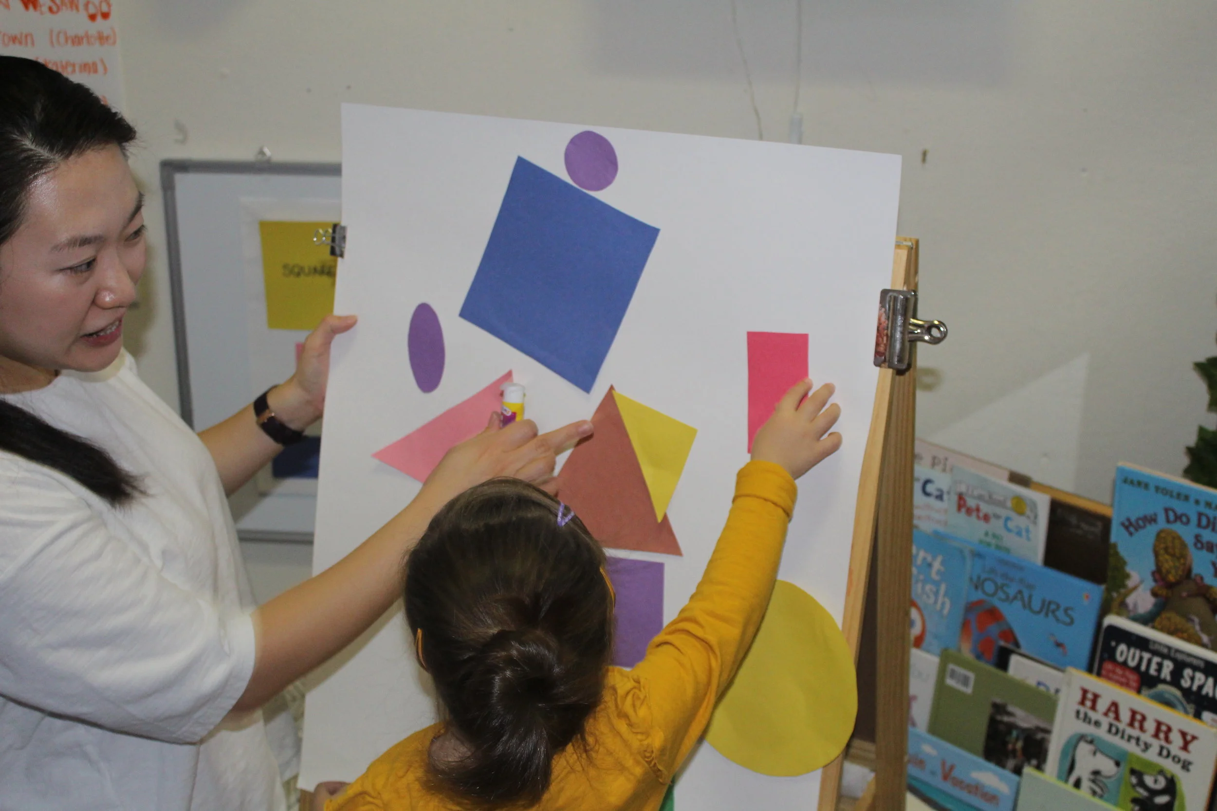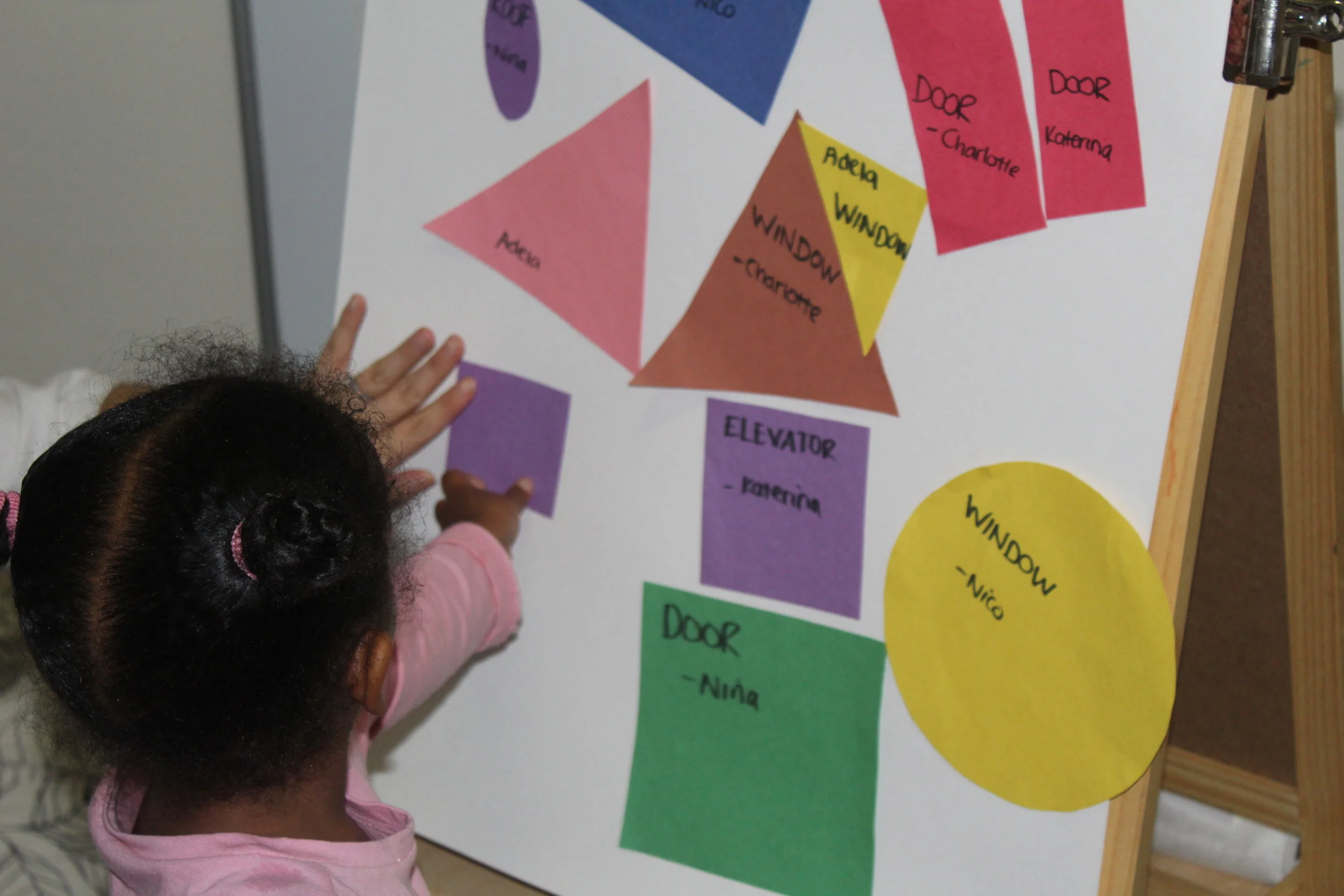 Then on Friday, we made our class house by using different shapes. Each shape represented different parts of our house. Our friends thought of squares, circles, and triangles as our windows, doors, kitchen, elevator etc.