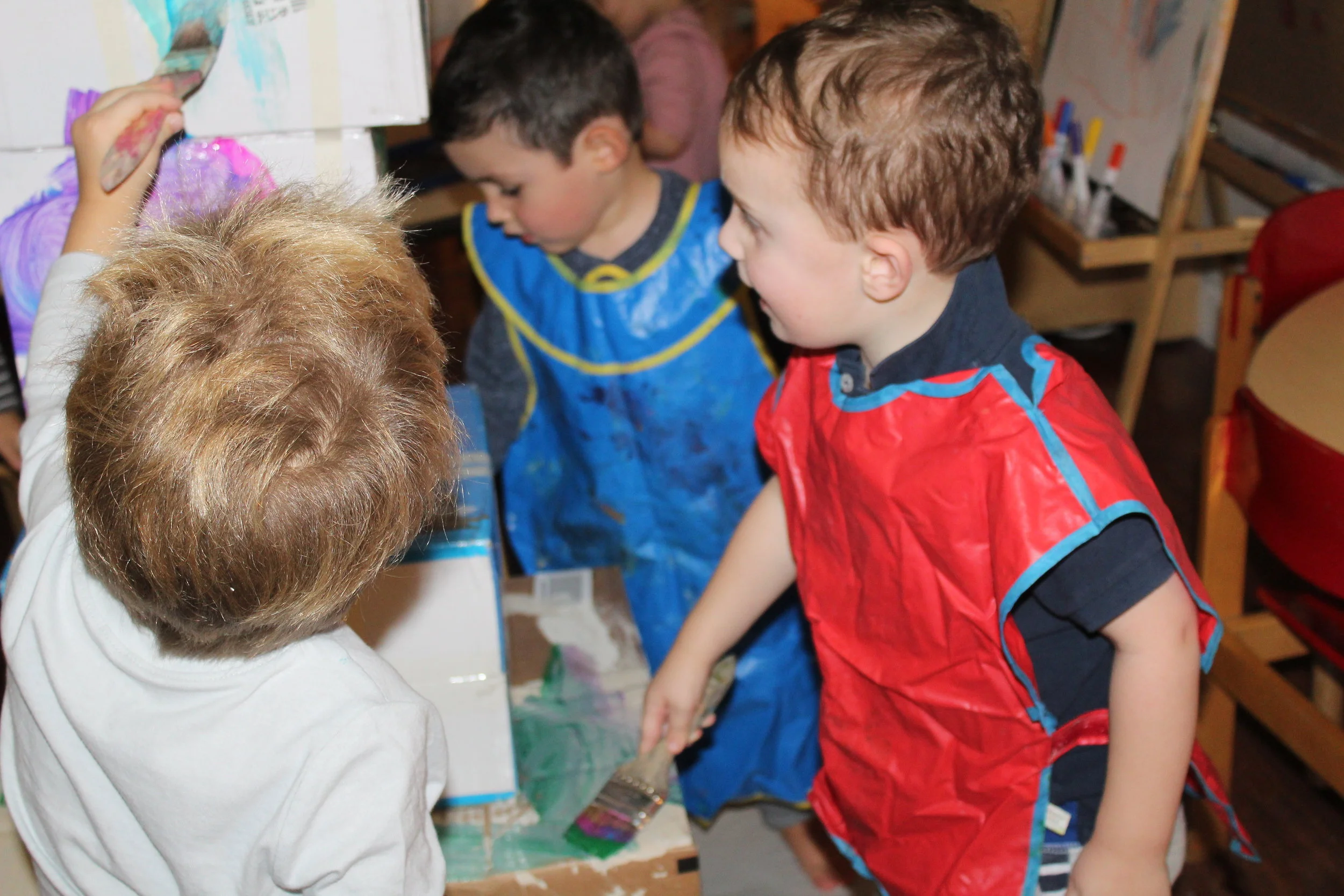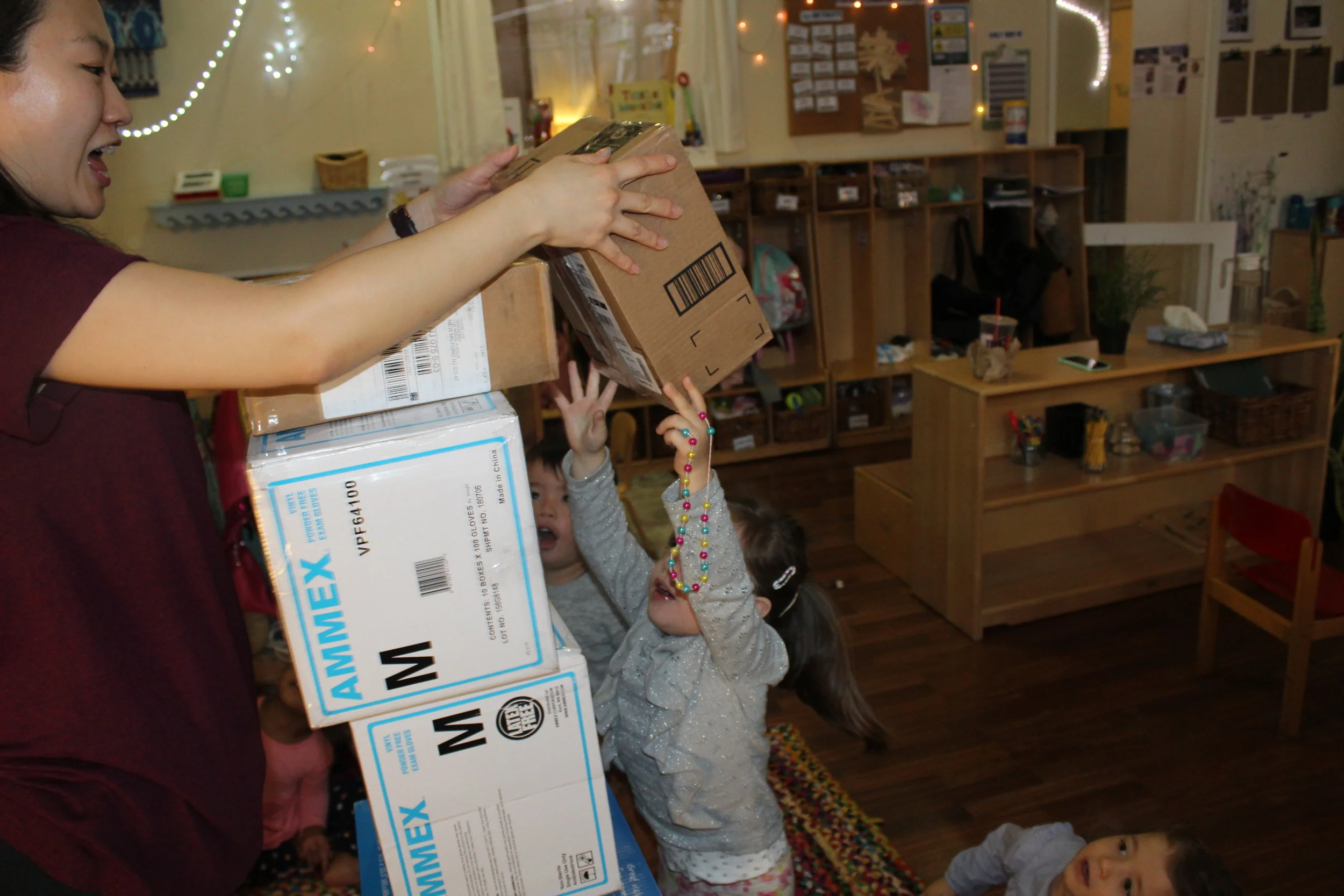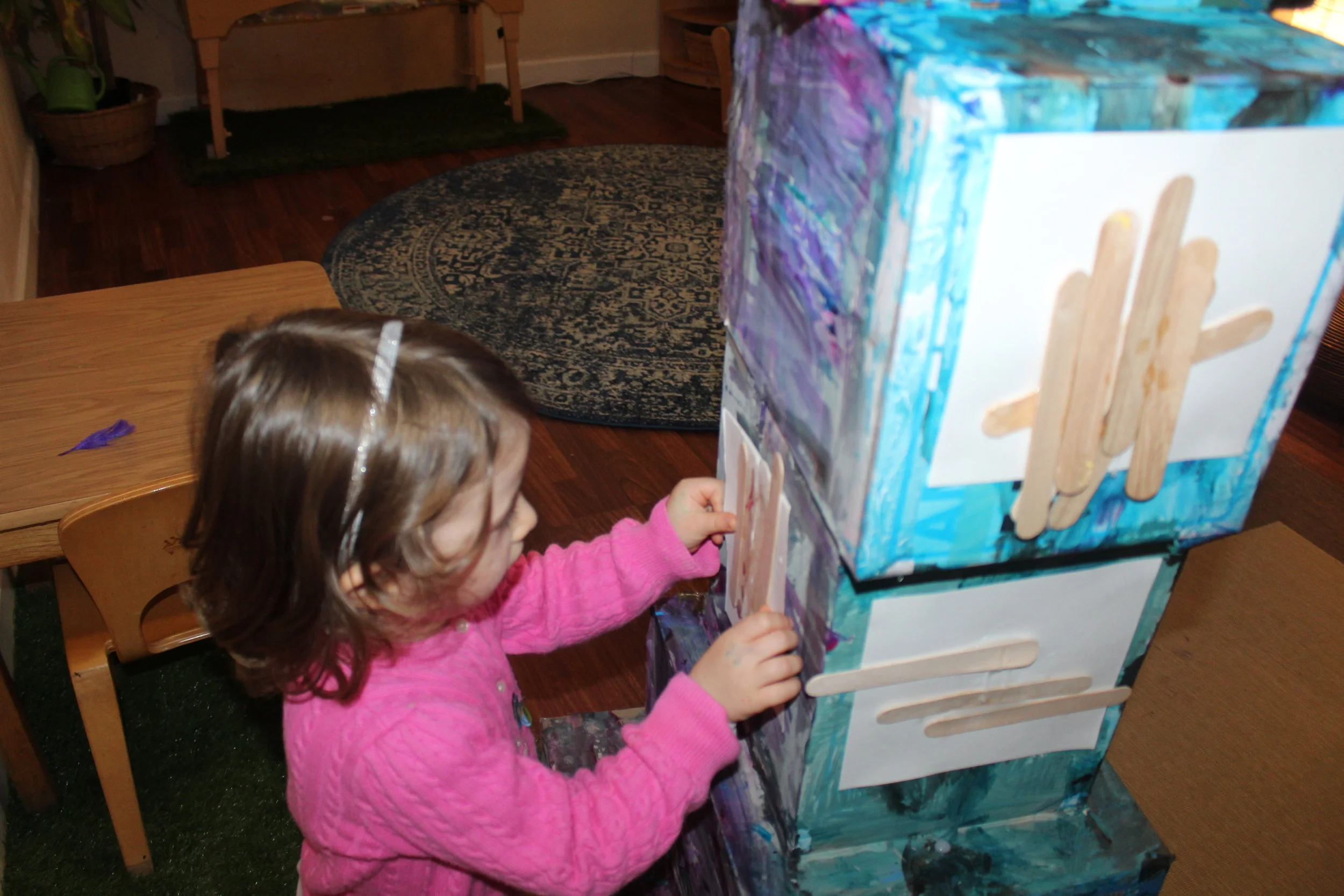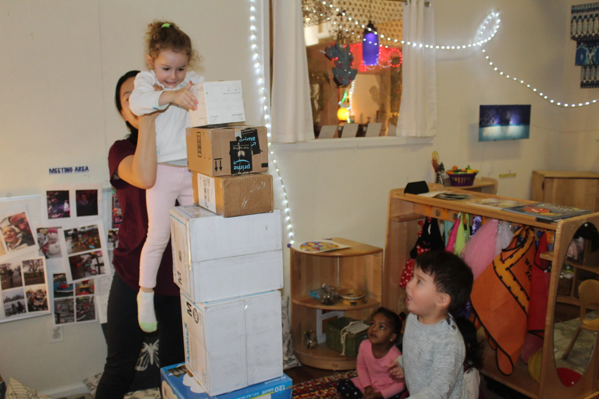 During one morning meeting last week, Clare brought a bunch of different sized cardboard boxes. She began by asking “can you build by using these boxes?” The children each received a box. One by one the children came up and placed the boxes the way they wanted. Once all of the boxes were stacked, some of the friends wanted to call it a ‘house’ while the others called it a ‘building’ and the rest said it was a ‘castle’. Then Clare and Erika helped tape and glue the boxes together so that the structure would not fall apart.