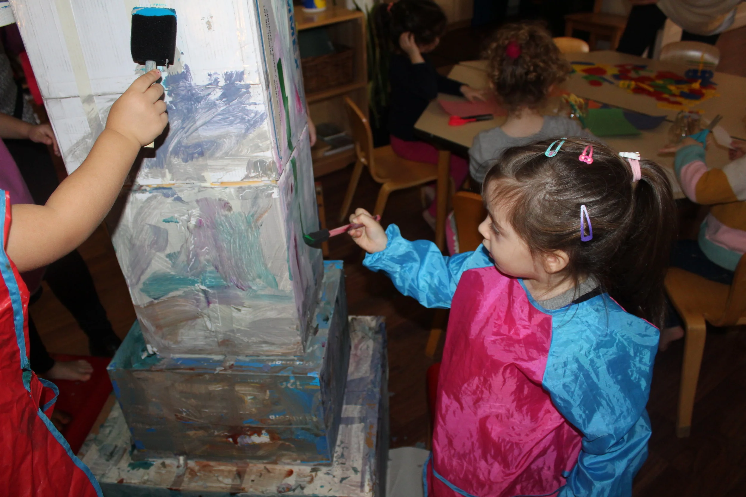 On Monday, we decided to give our structure a name. The majority of the 3A friends said it would be called the ‘Freedom Tower’. We also decided to paint the building. The children chose four colors: pink, blue, green, and white, and then they painted our ‘Freedom Tower’. They had to stand on chairs to paint the top part of the ‘Freedom Tower’ because it was so tall!