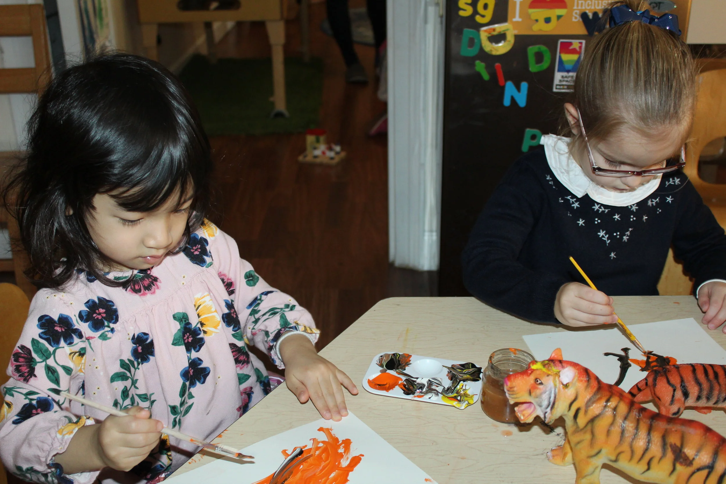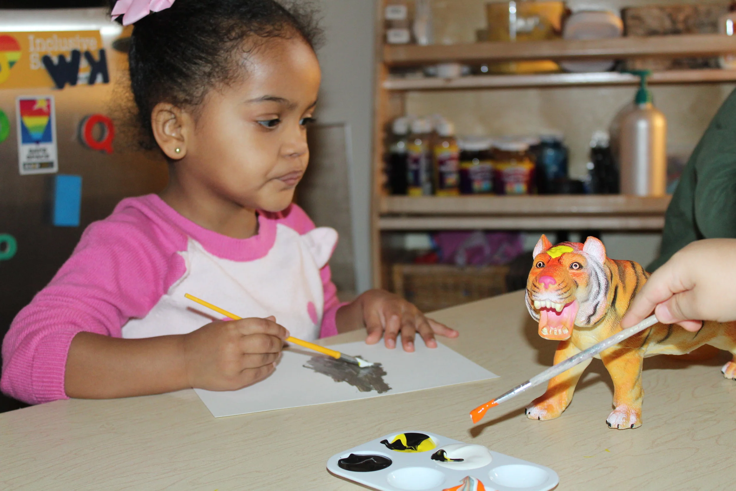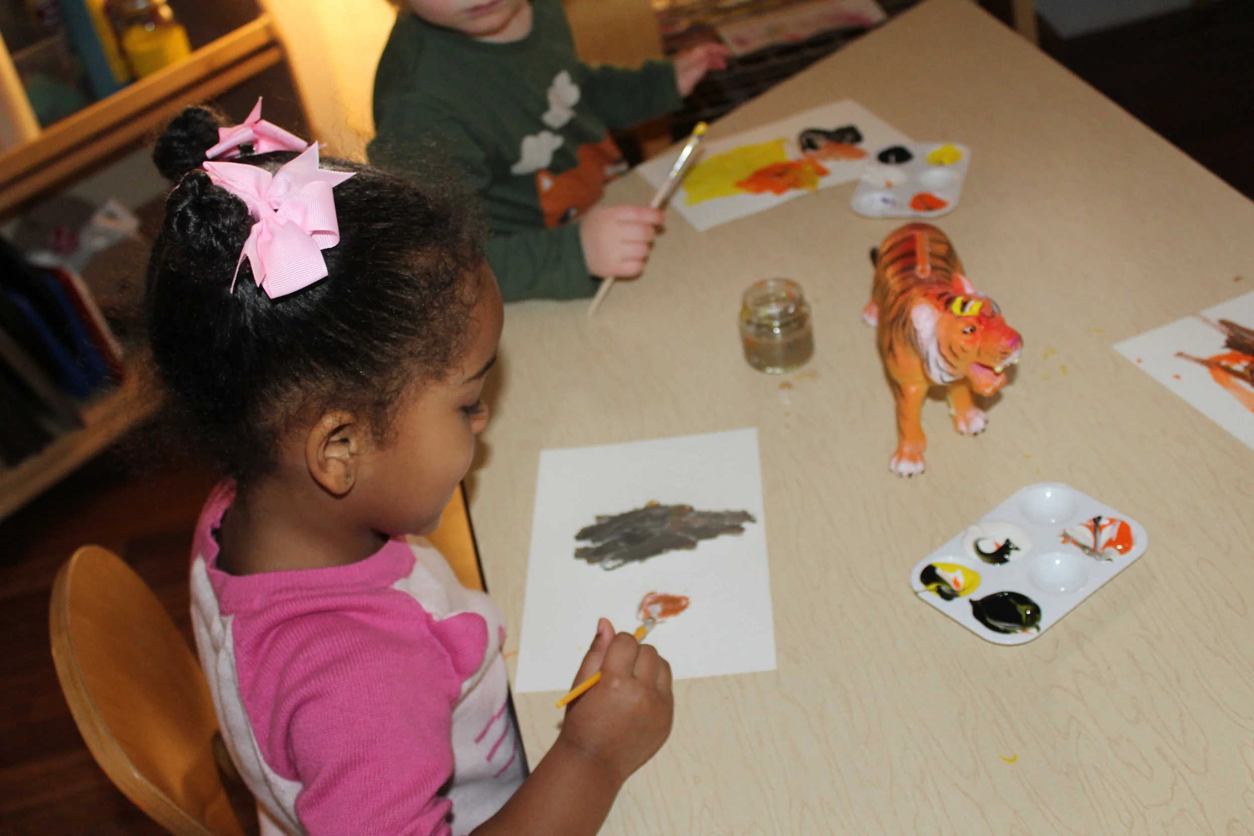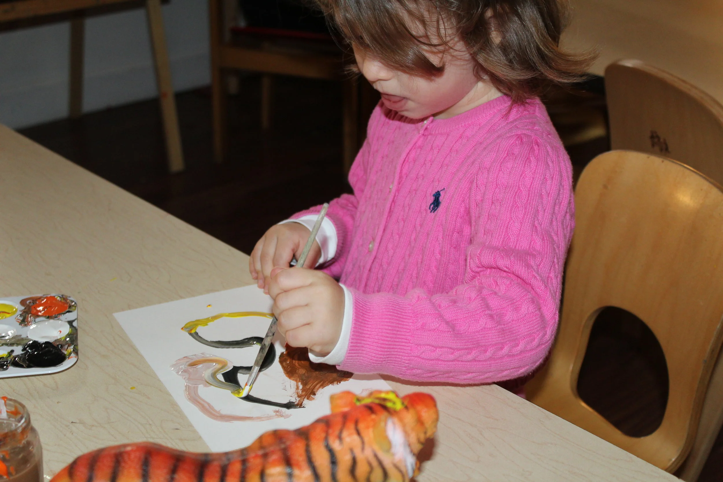 This week, the children continued to study animals by exploring different activities. We used paint and paintbrushes to depict what a tiger looked like in their eyes. Some of the children looked closely at a Tiger's stripes. They showed distinct styles of stripes depending on how they saw the tiger. Other children looked at other parts of the tiger. Mia painted the tiger and said, "Tiger has legs and a mouth." Charlotte said, "I'm doing a tail" as she was painting the tiger. Some other children expressed their own understanding of a tiger in their paintings.