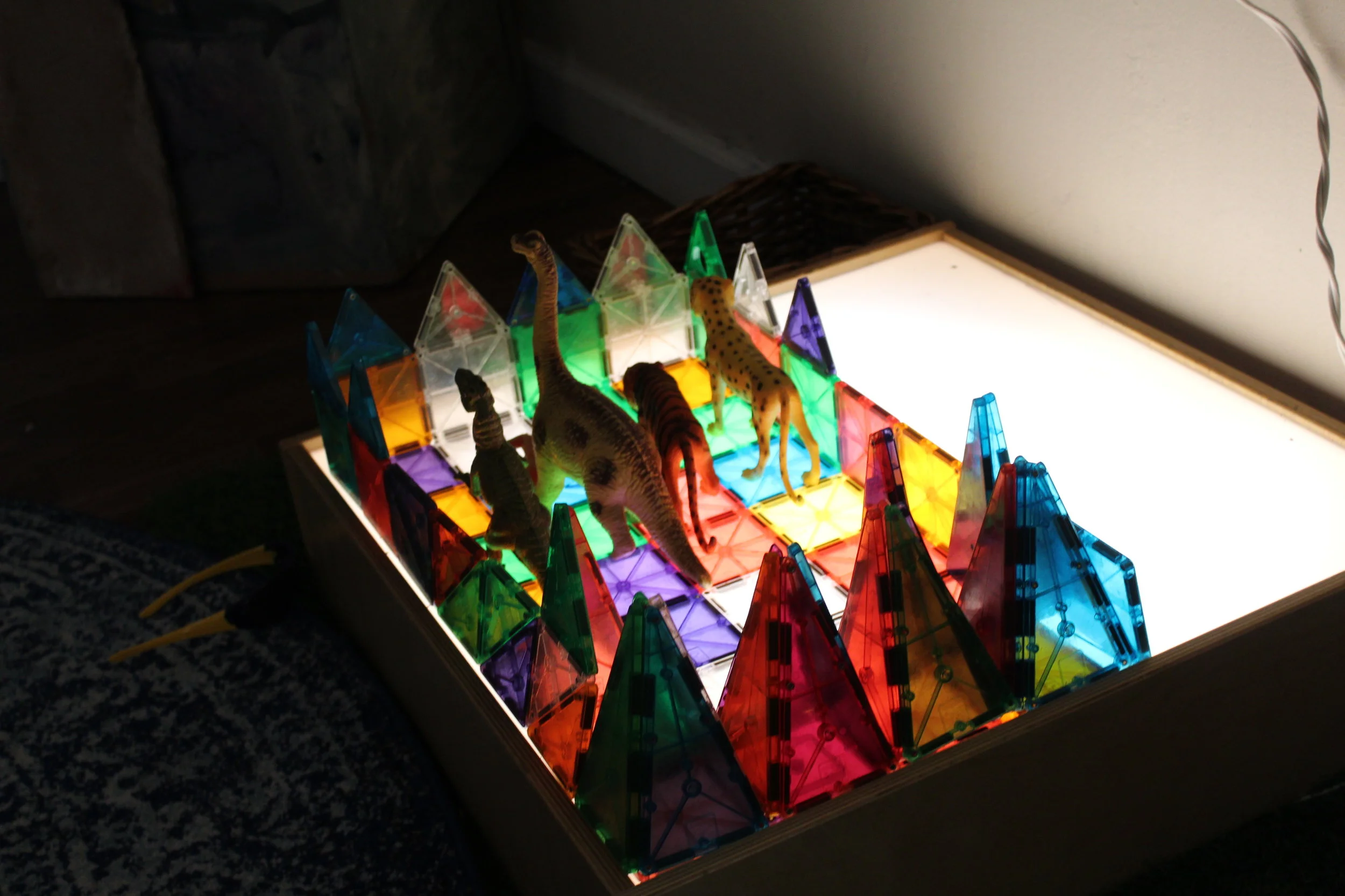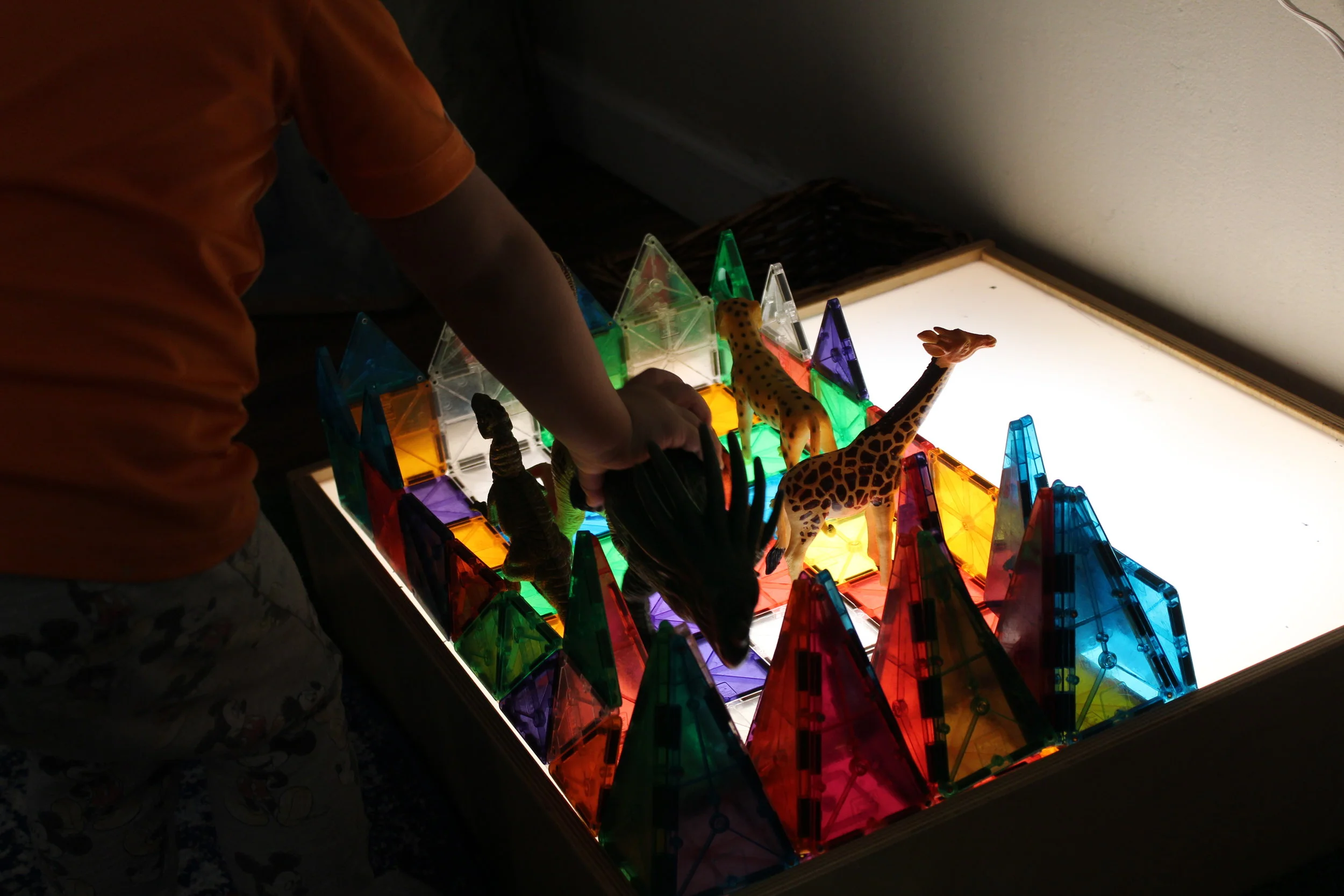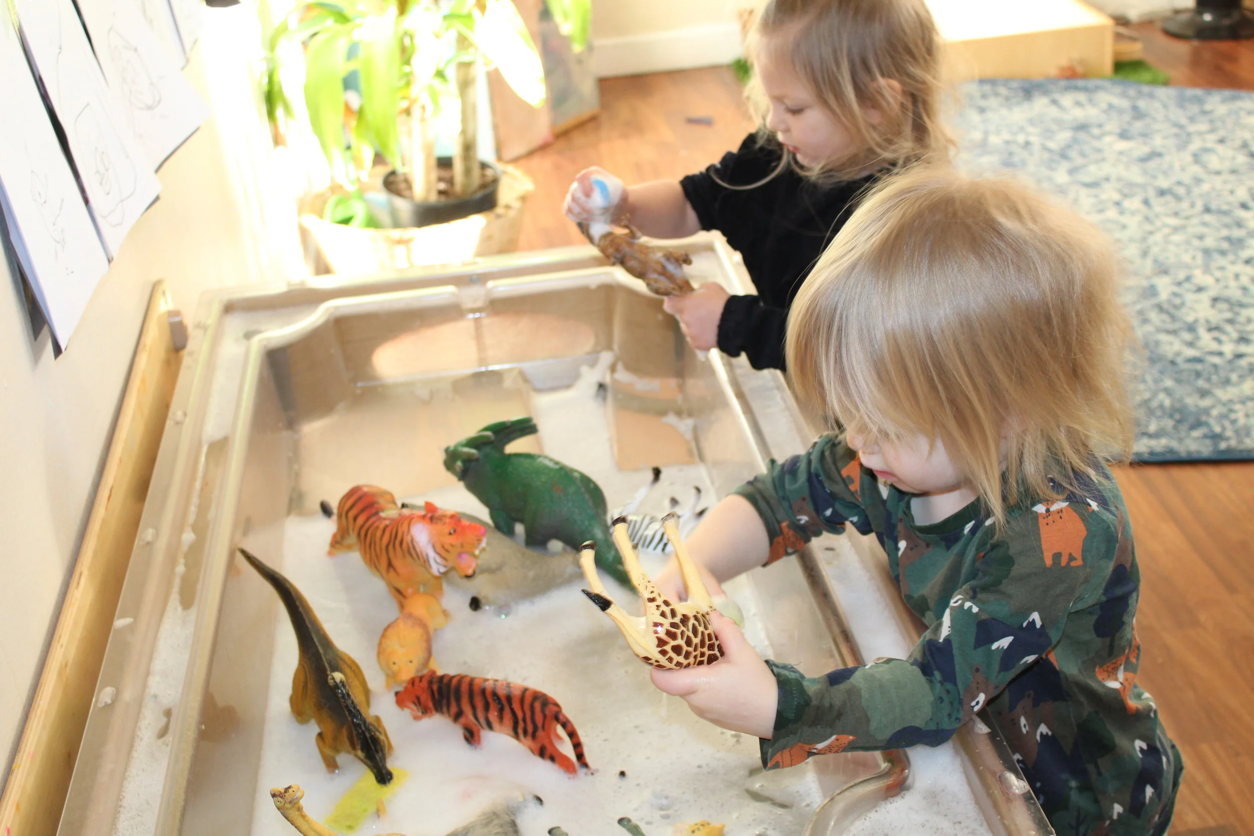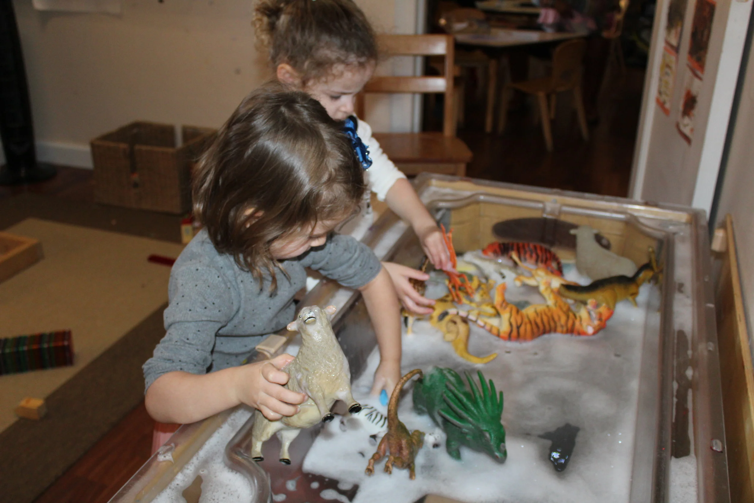 Then we washed the animals with soap and water at the sensory table. The children showed a lot of affection towards the animals by pretending to bathe them. They also built a zoo and houses for the animals with Magnetiles and blocks. We are noticing that the children are using creative ways to build zoos and animal houses and in a collaborative way!