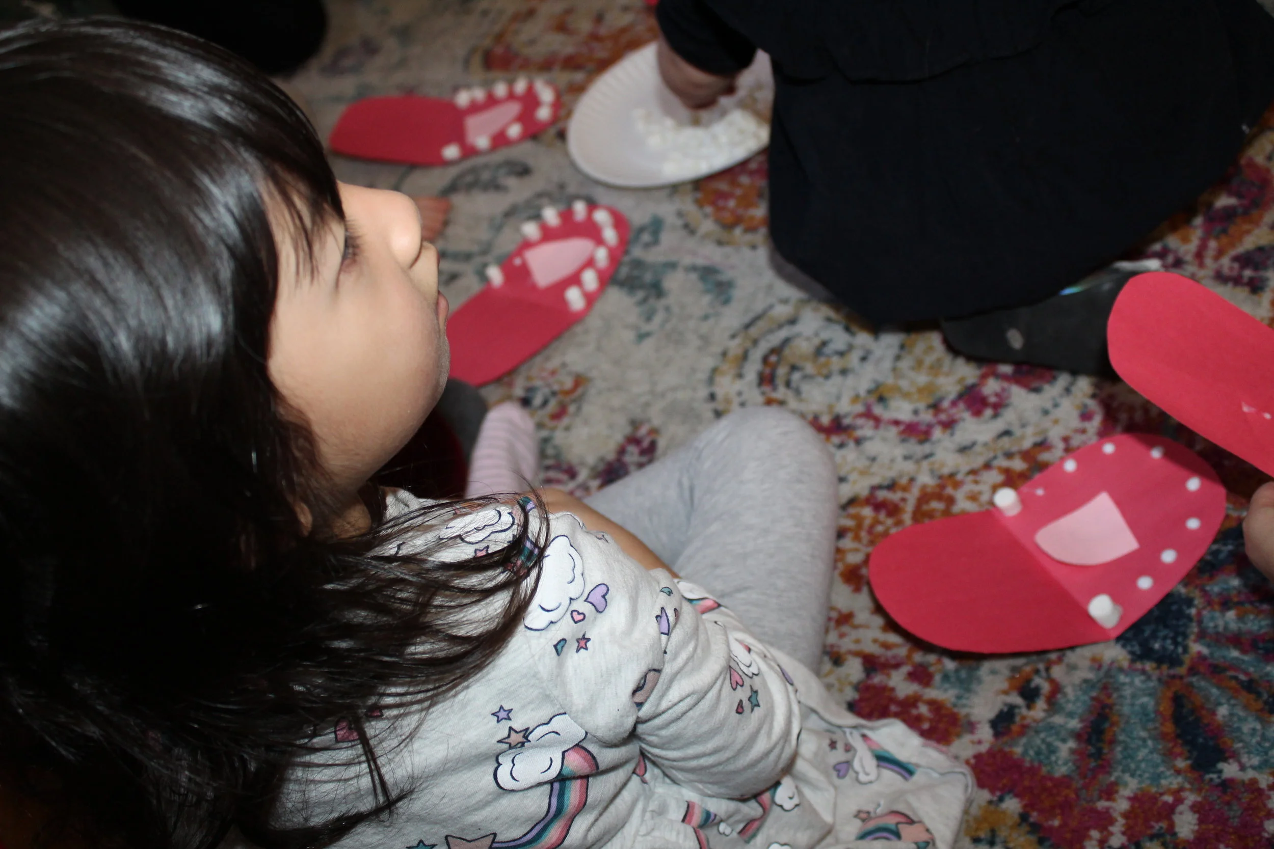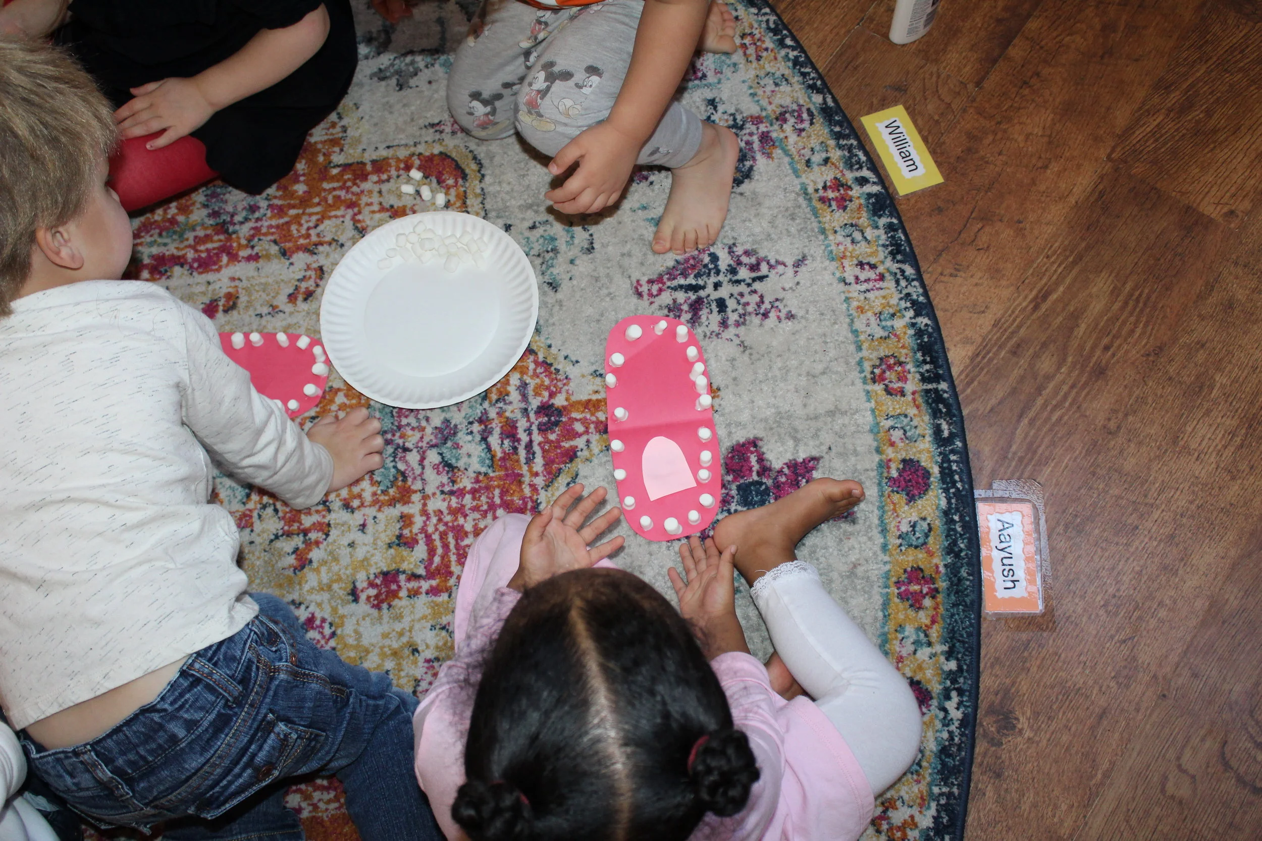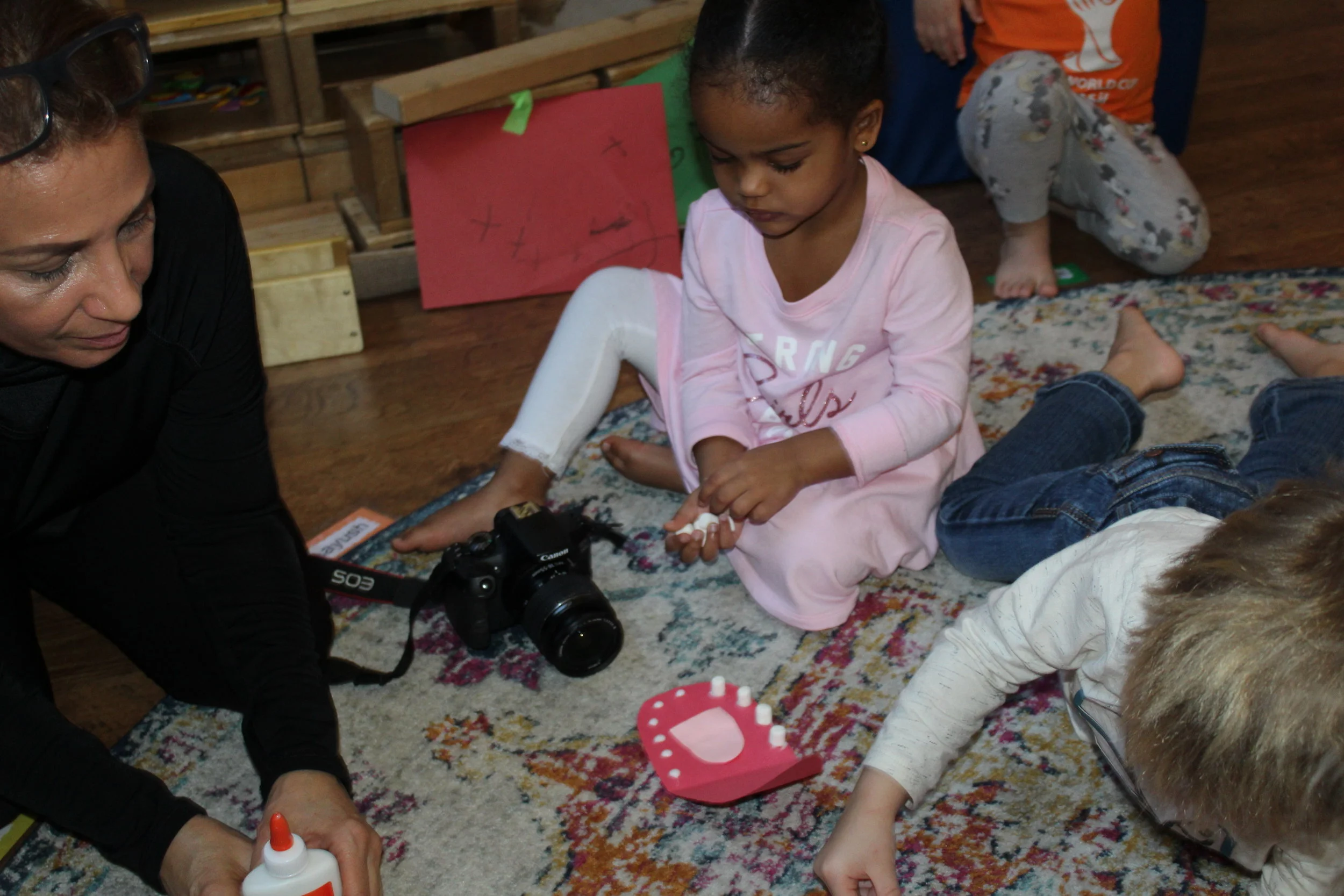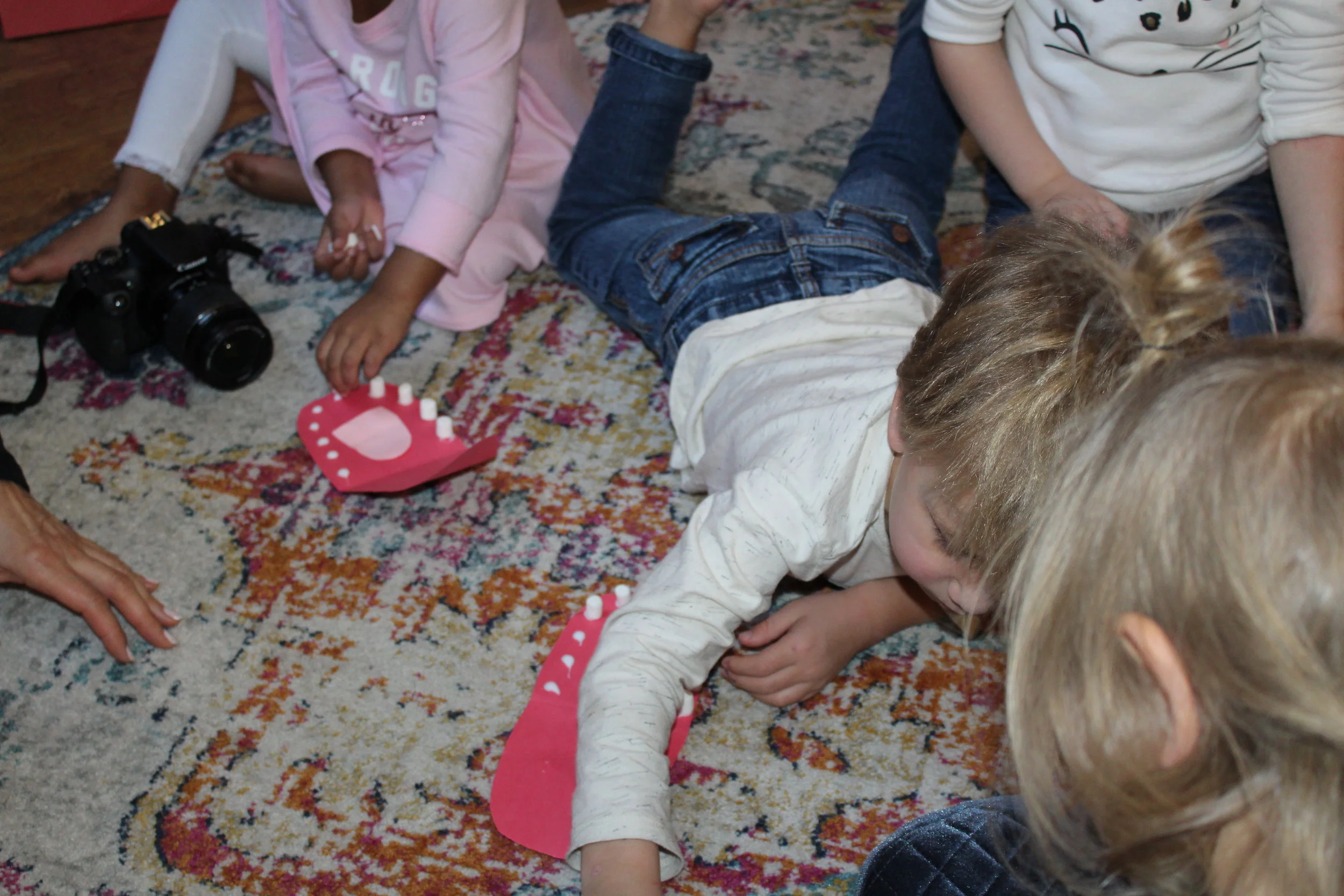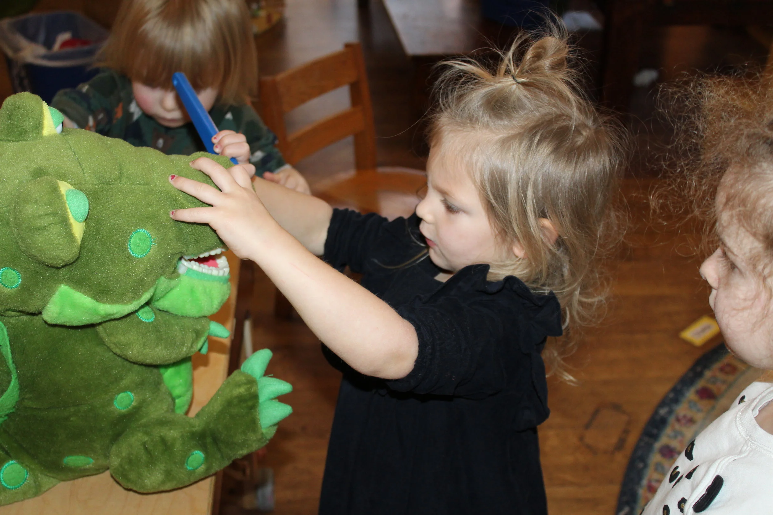 Today a local dentist visited our school and taught us how to brush our teeth by using a toothbrush. Then we made marshmallow teeth! We also practiced brushing teeth on the dinosaur!