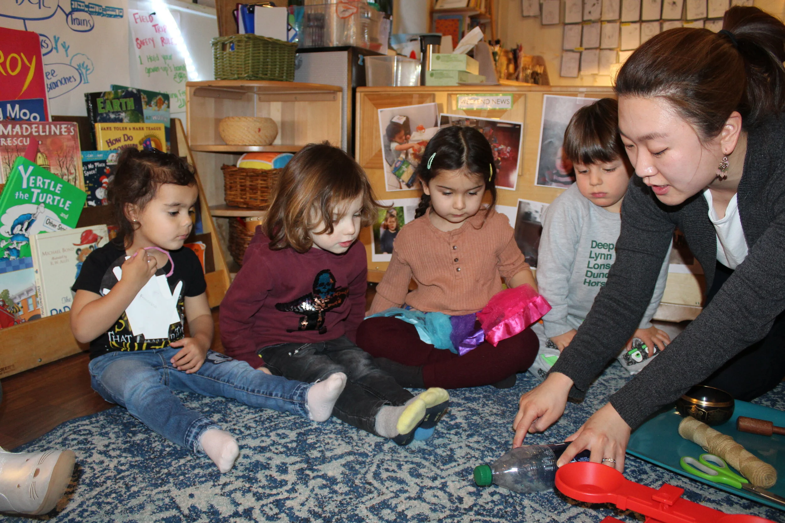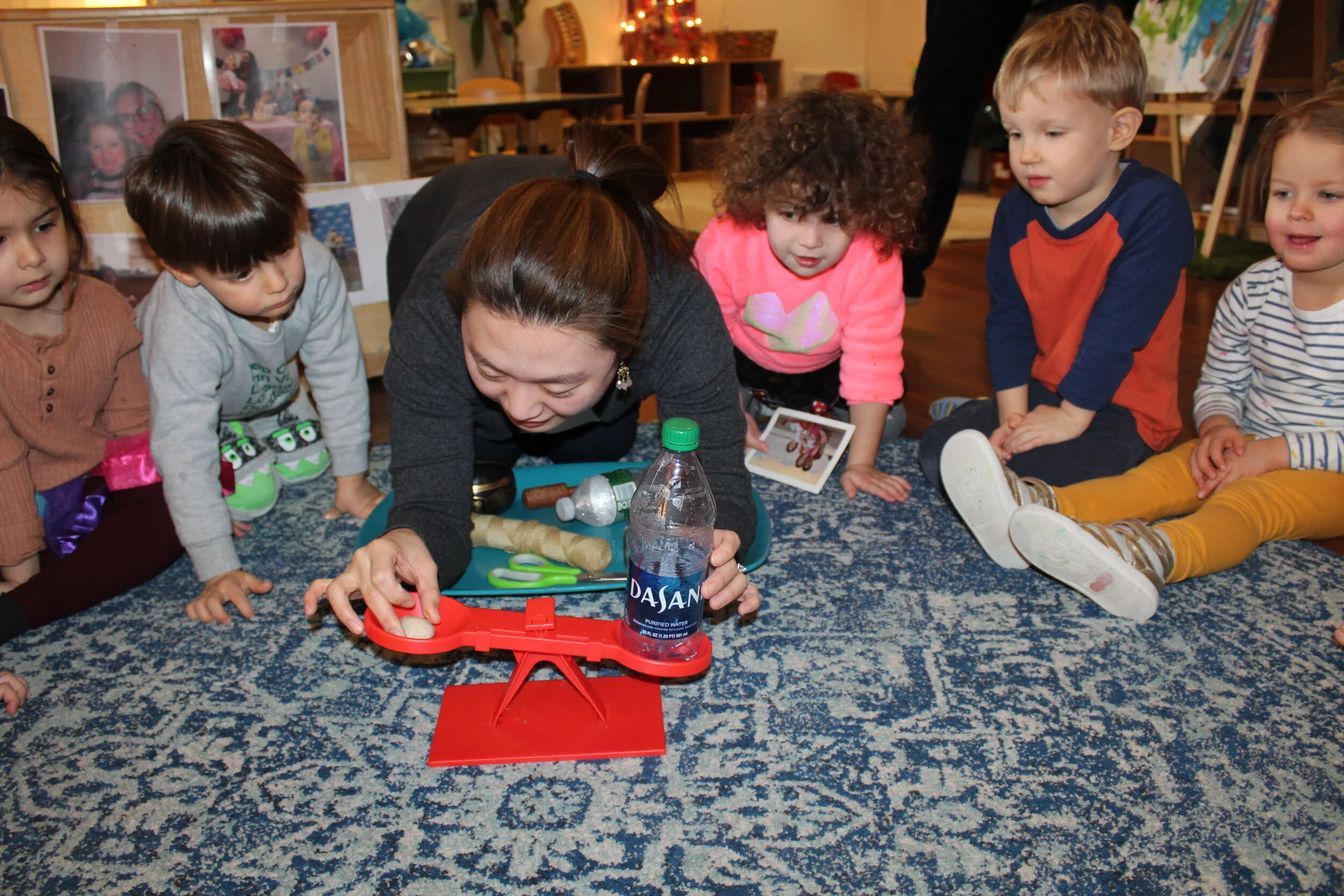 A few weeks ago, we found a seesaw in the gym. The 3A children immediately knew what to do and took turns going on the seesaw. As we were having so much fun bouncing up and down, a question popped in our heads. What makes us go up and down on a seesaw? This investigation helped the 3A educators come up with a topic for the Buckle My Shoe Science Fair. Weight!  After speaking with our science fair mentor, Deborah, (Alexandra's mom in our class) we realized weight = mass x gravity. Since gravity is constant on Earth, we were able to find the mass of objects (how heavy things are)!