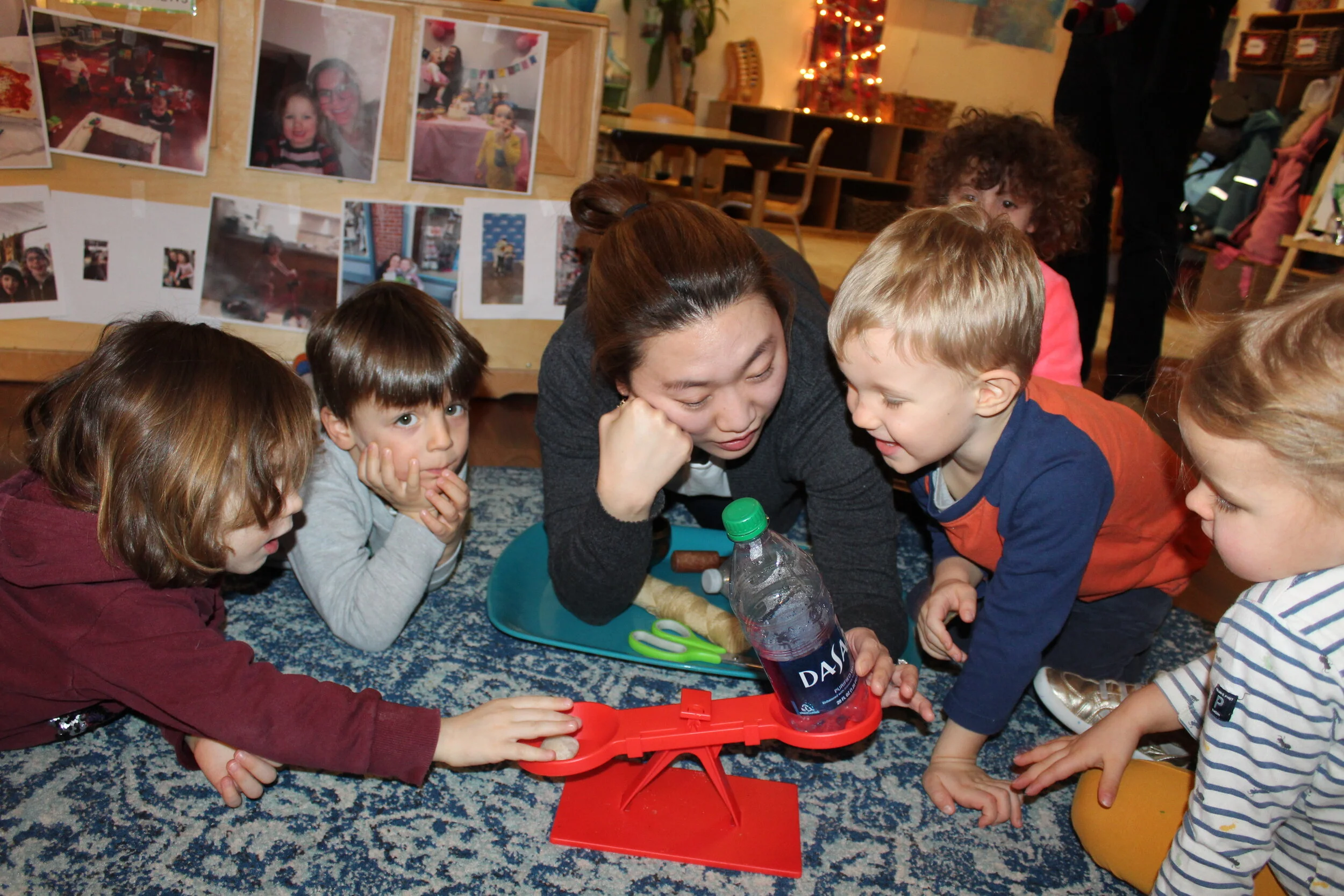 The children are exploring balancing scales by placing different objects on the scale and seeing which side is heavier.