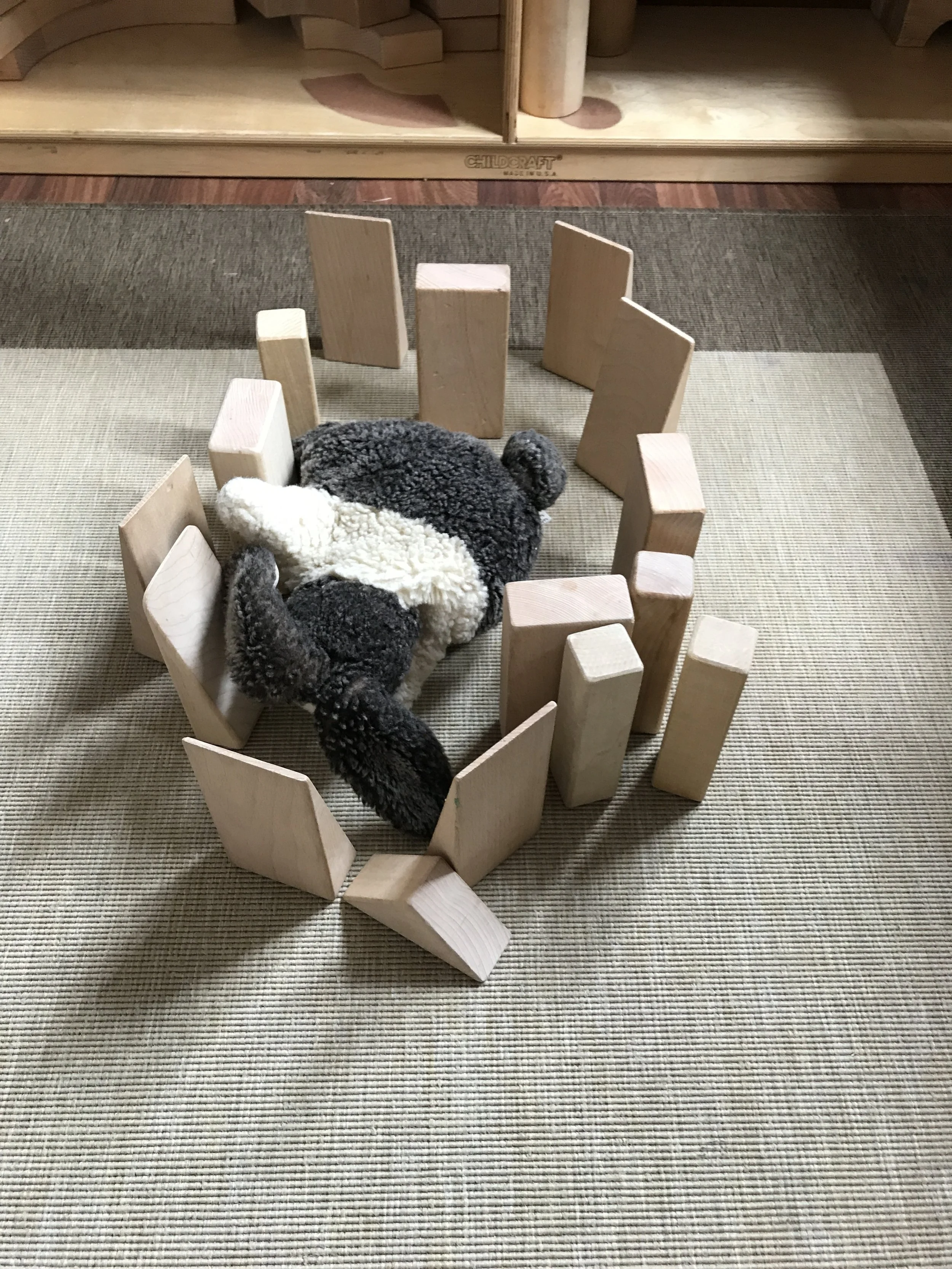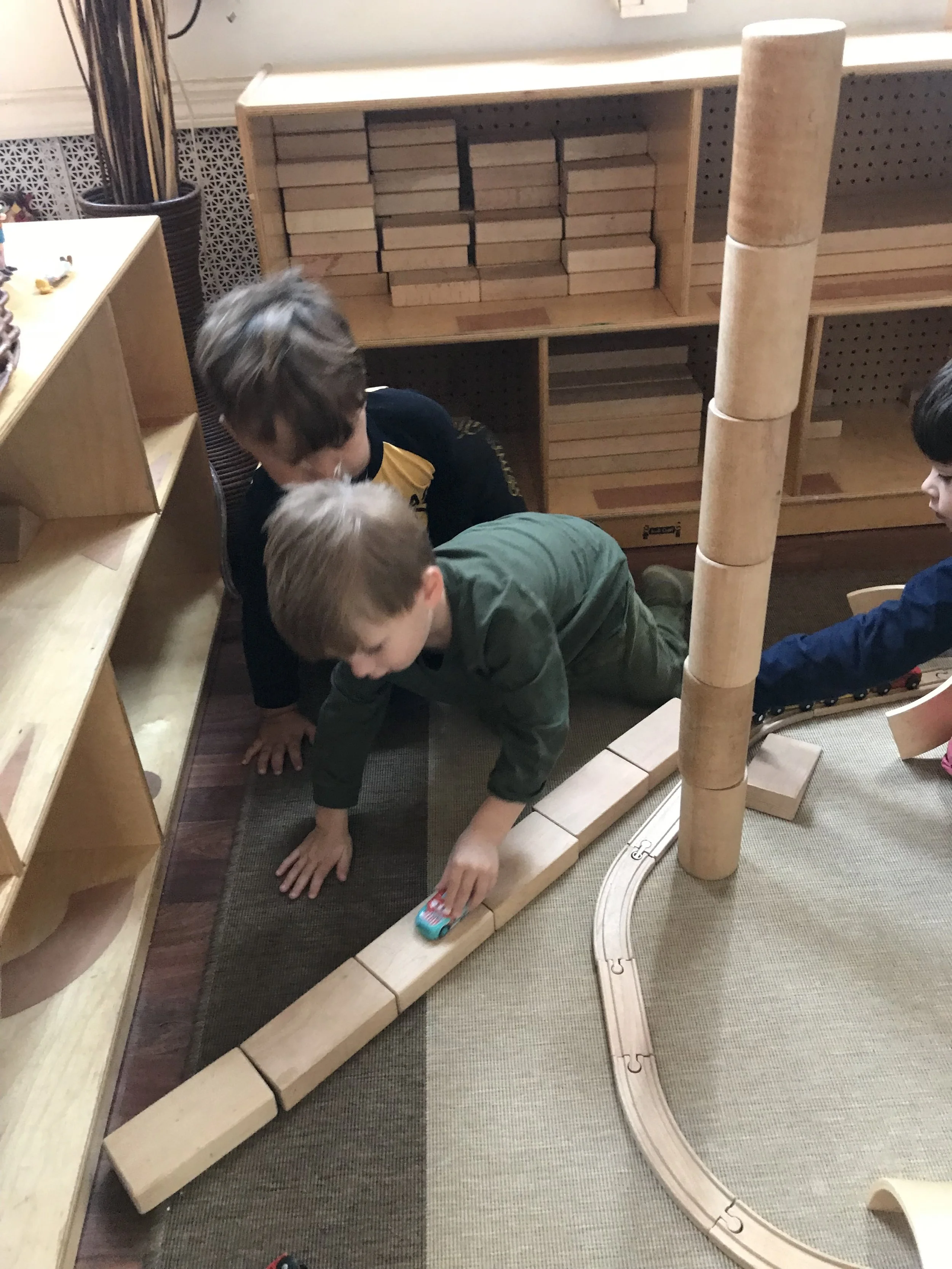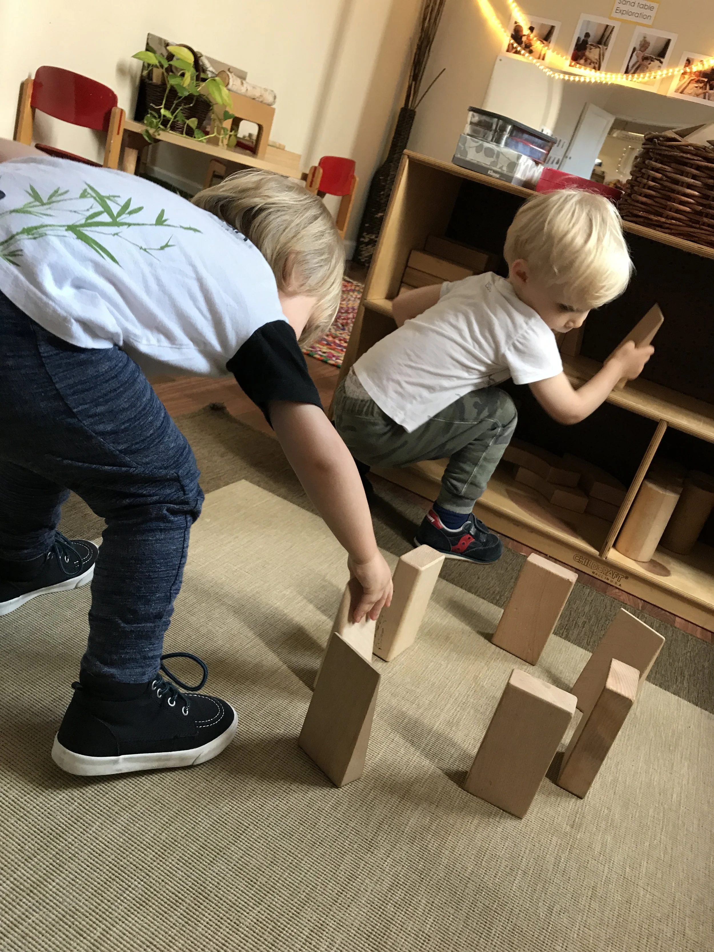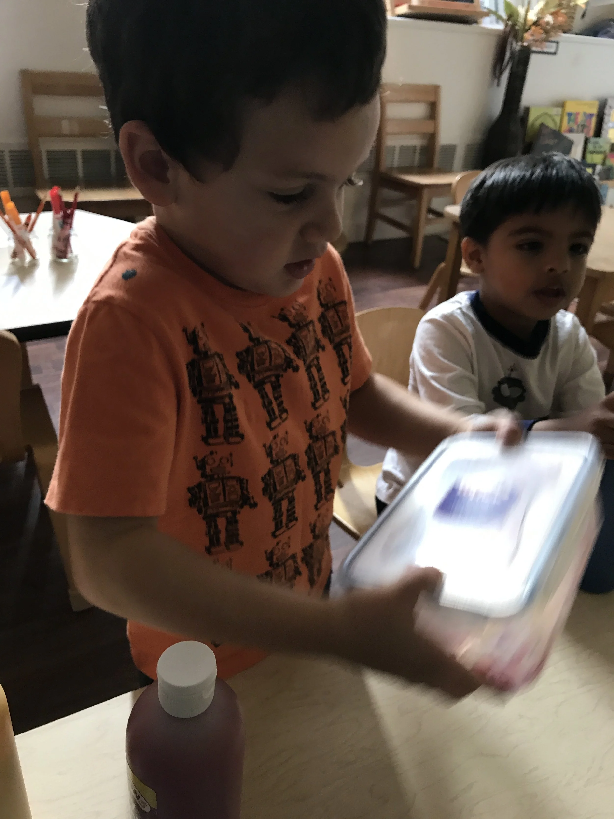 On Friday we started our day with shared snack. Angelo brought in goldfish crackers and apples. Then we set up two activities for the children: marble painting and a drawing prompt (googly eyes glued to a piece of paper). The children loved the activities. We also continued our child identity study where we asked the children what they are great at doing. Something we have noticed developing this week is how the children identify themselves according to the first letter in their name or any of the letters in their name. To foster this interest, we graphed how many children had the letter A in their name. We discovered that two children have two A's, four children have one A in their name, and two children have 0 letters in their names. We will continue graphing and discussing letters as the weeks go on. Lastly, William and Milo worked together to build a house for our stuffed animal bunny. (More pictures will be added on Tuesday from today)
