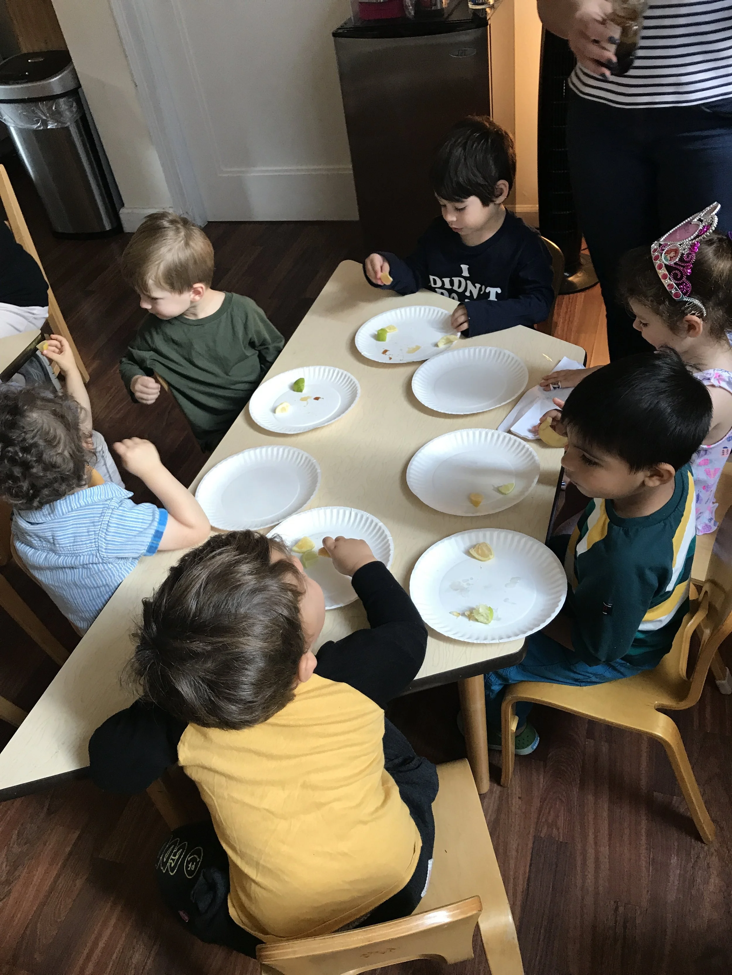 On Wednesday we had our first soccer class with Coach JoJo. The children worked on their kicking skills by kicking balls, tall cones, and short cones into the nets. We also had cooking/science with Diane. She brought in apples from the farmer's market and the children tasted them along with lemons, lime, cinnamon honey, and wildflower honey. Afterward we talked about which flavor we liked the most.