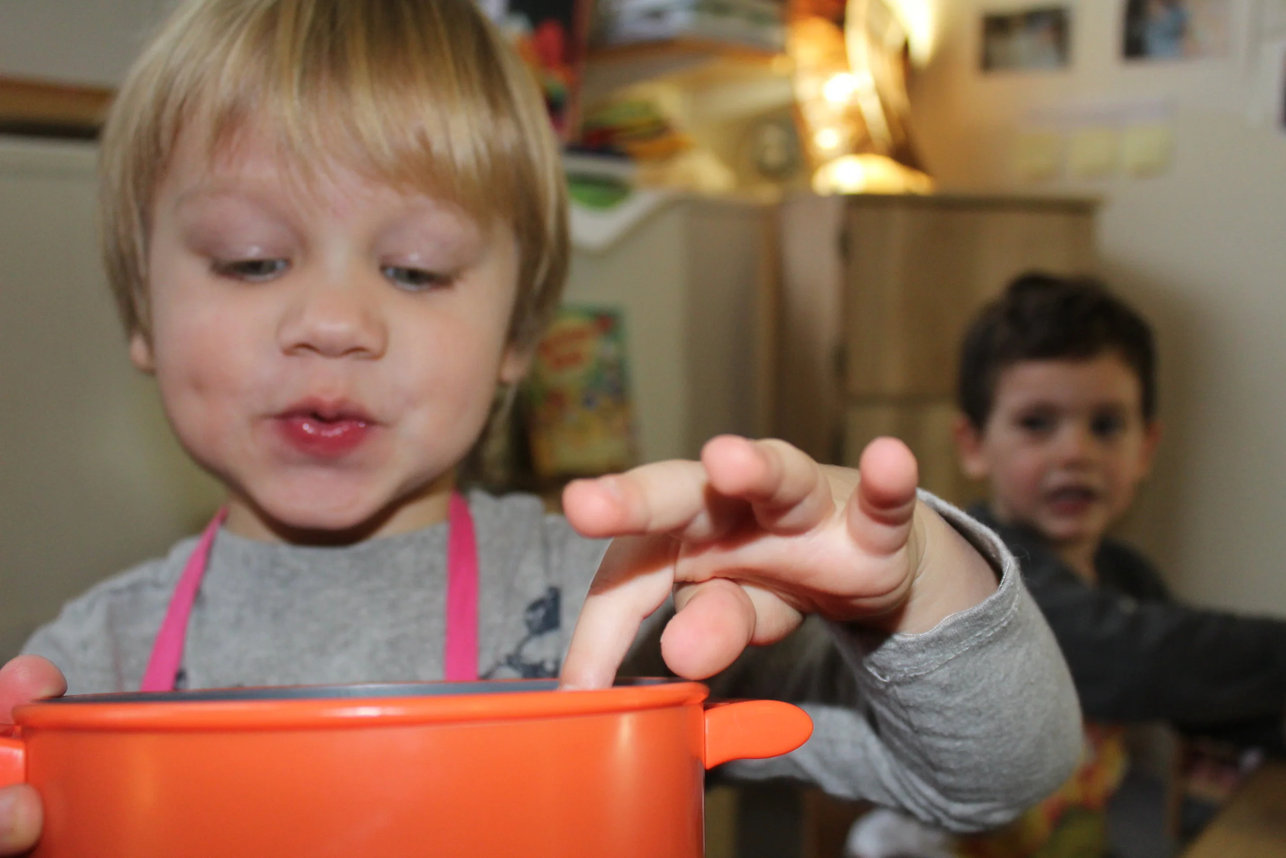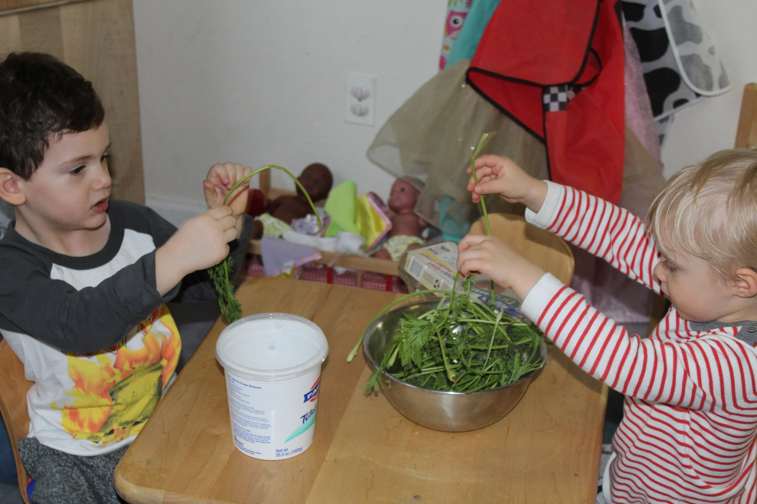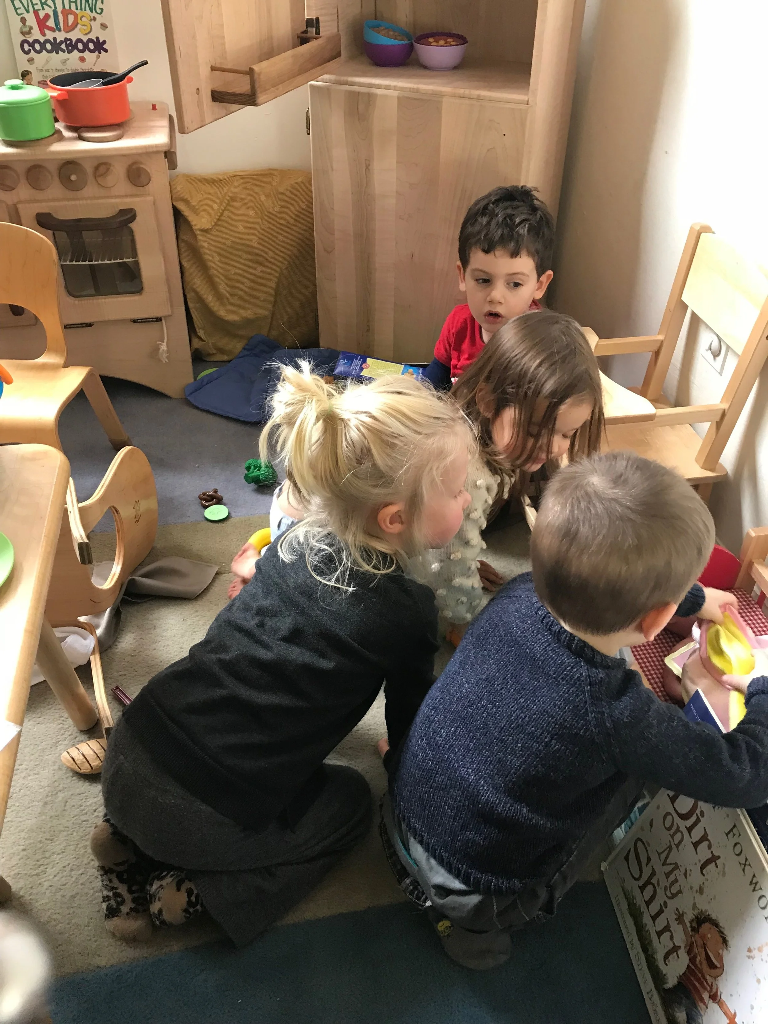 This week we added new materials to the kitchen area (yogurt container, baby food jar, egg carton, and real carrot tops) that have gotten the children cooking up a storm for each other.