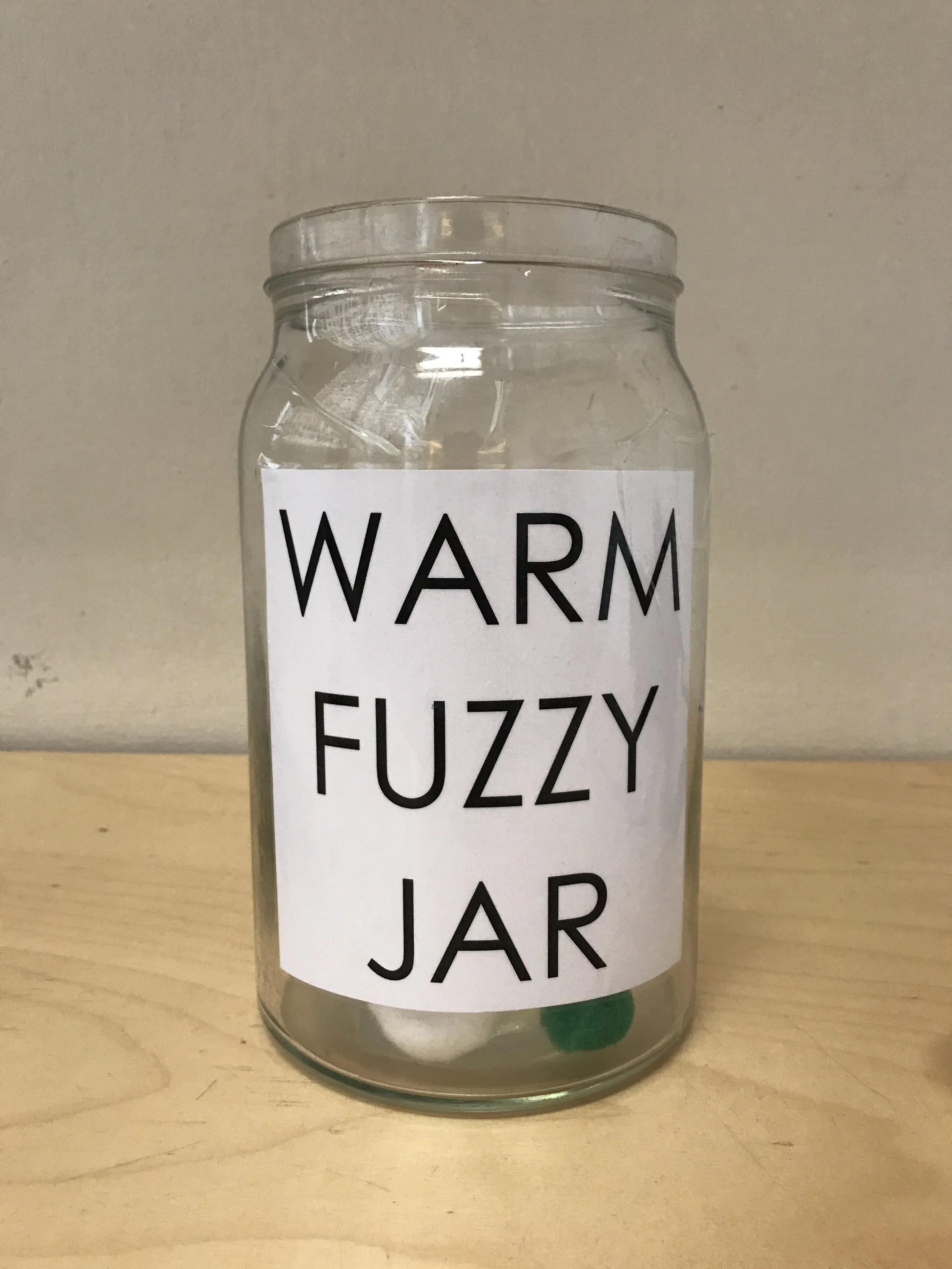 The warm fuzzy jar promotes kindness. When we see the children do something nice for another friend, they get to put a pom-pom in the jar. When the jar is full, they get to have a treat/party. Since introducing it on Thursday, the children have done 3 acts of kindness! Today, Alexander got to put one in because he let Dylan use the car in the gym before his time was up.