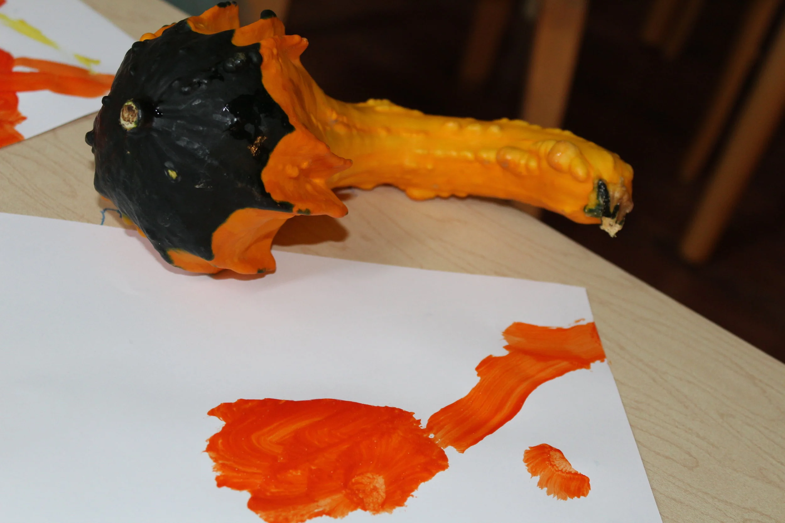On Thursday we started morning meeting by recognizing the first letter of everyone's name. We're hoping to tie their interest in letters to their Halloween costumes. Afterwards we had gym, followed by cooking with Diane. Today we made apple pie. It consisted of pie crust, apples, cinnamon, and honey. We ate it for snack the following day. Throughout the day, the children explored the sensory table (gloves filled with glow sticks), created a car using a box and a few blocks, and worked on observational paintings of pumpkins and gourds.