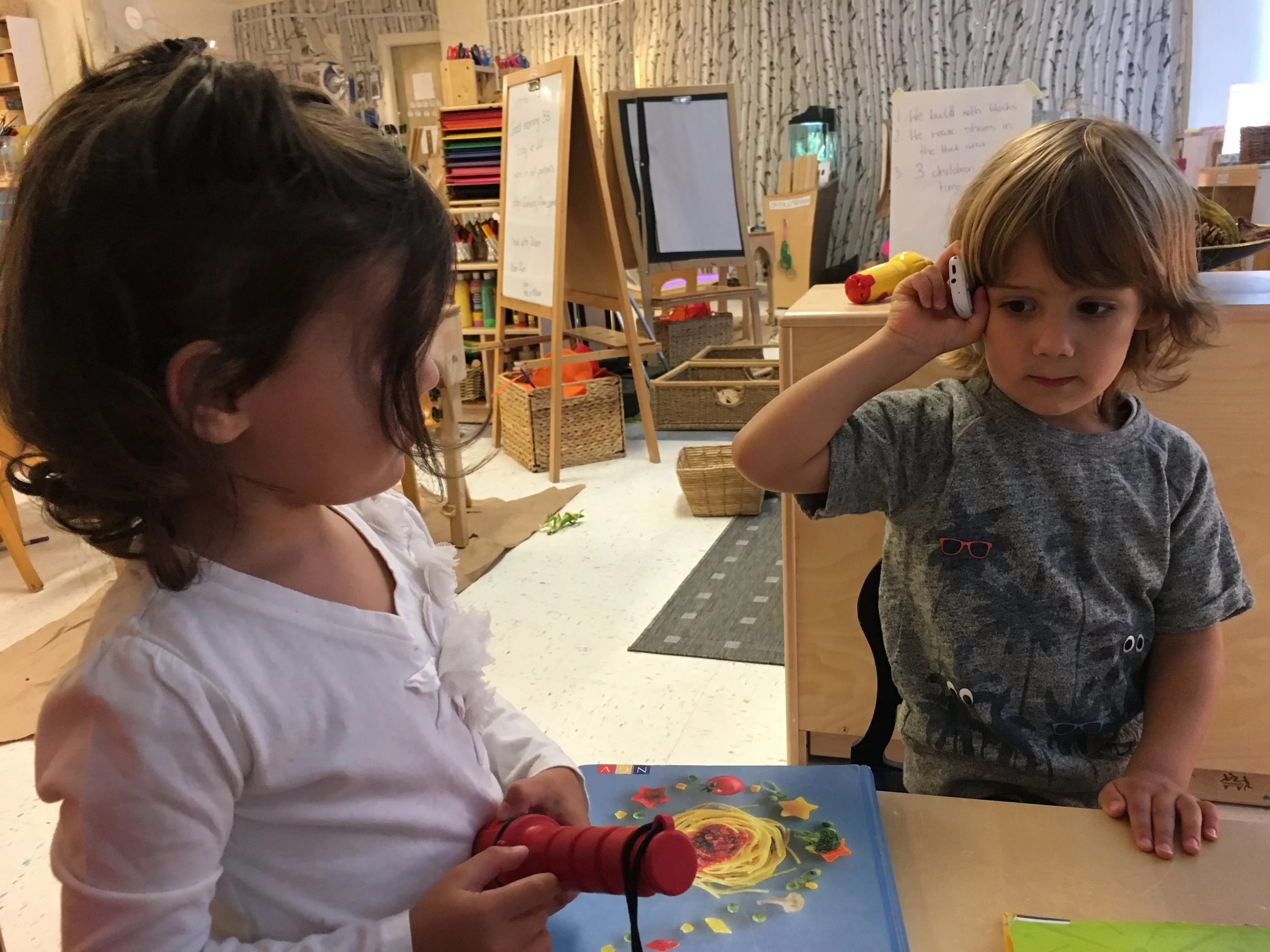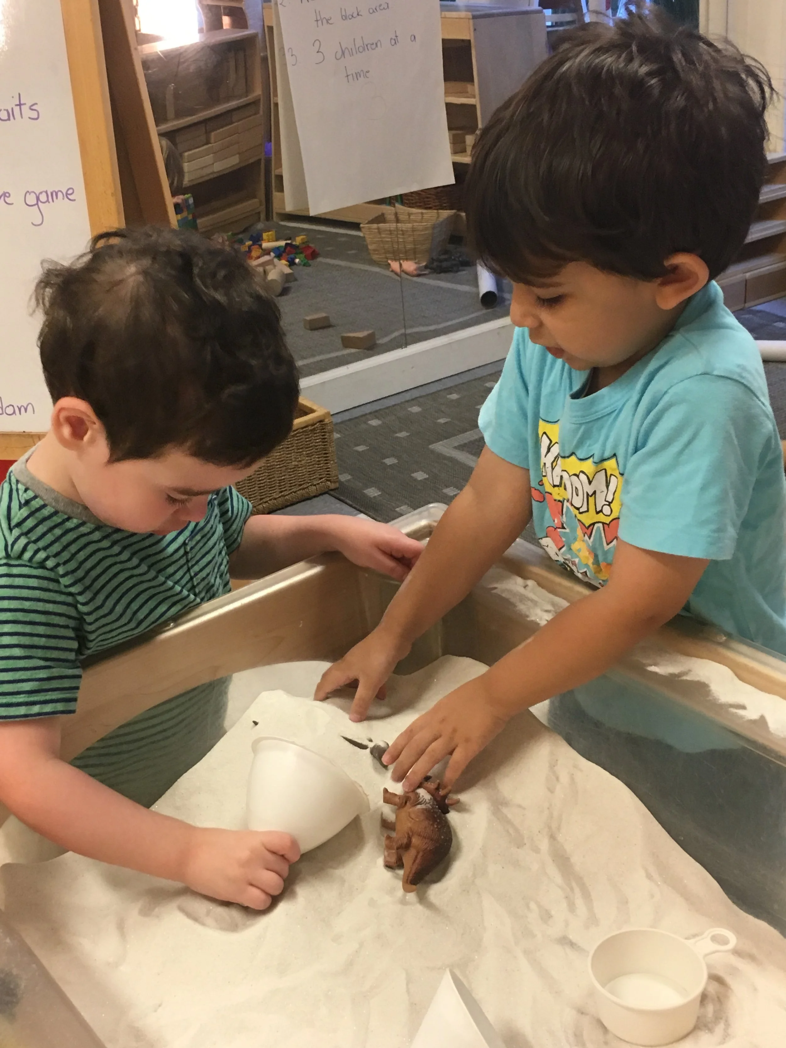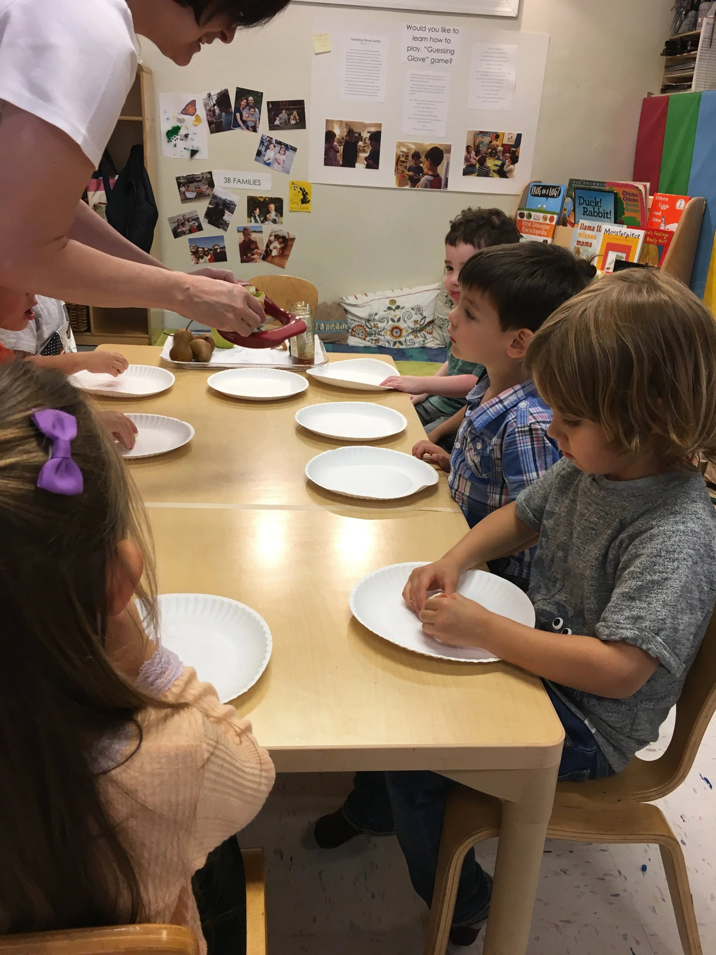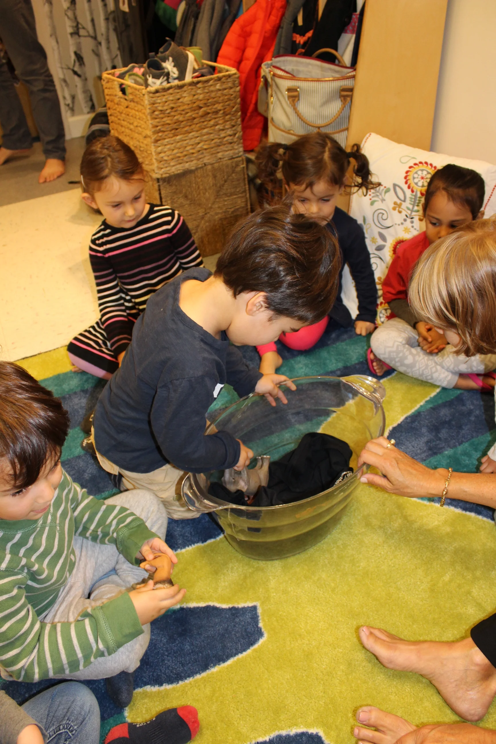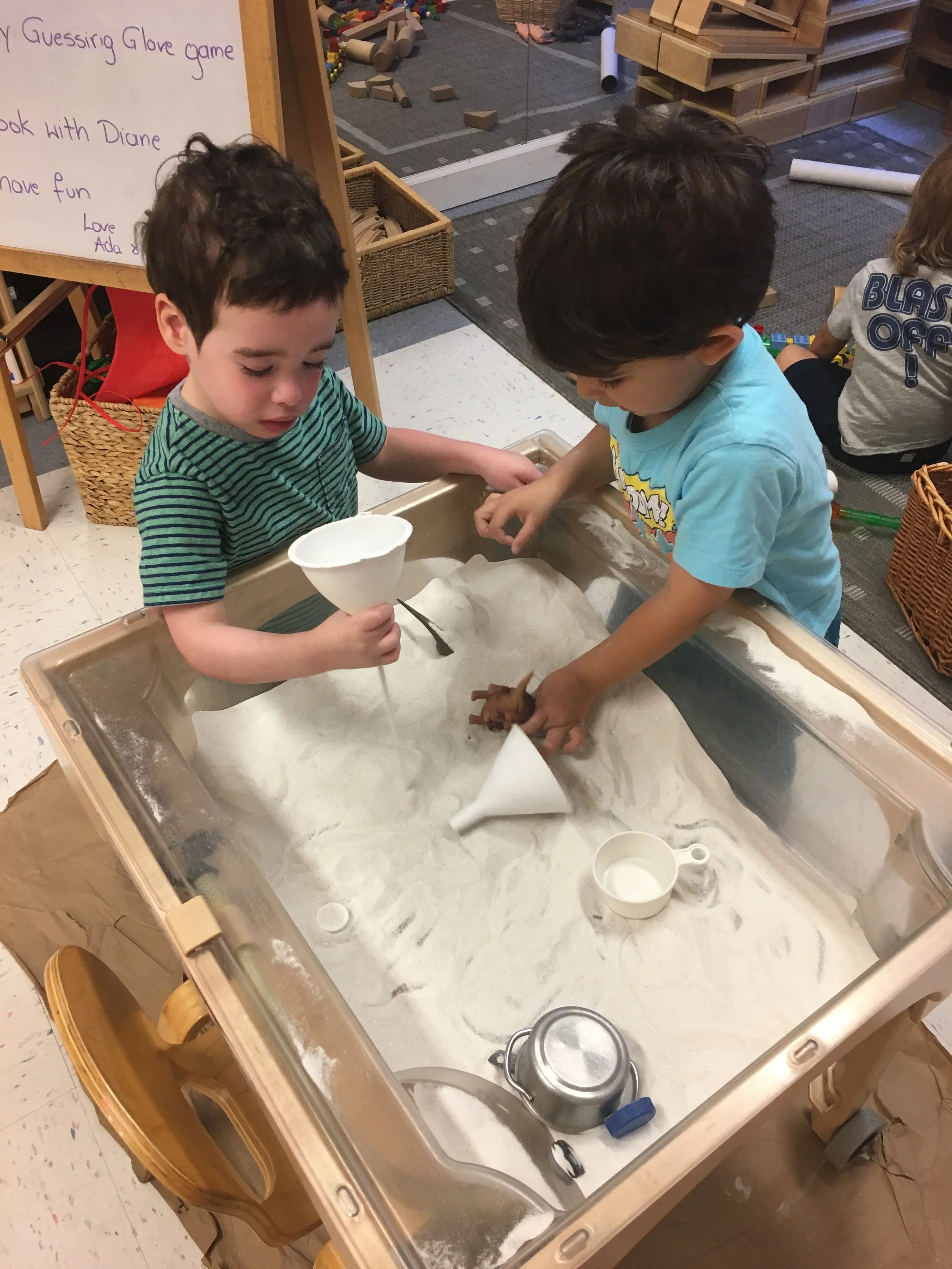 Recently, during open choice time Graydon invented a game. It all started with him hiding kitchen food under his t-shirt and asking one of his teachers to guess what he hid. Soon his friends started to join the game. Graydon would help them guess by providing hints. It seemed that the children were really involved and engaged in this game taking turns and establishing rules. As soon as Kian got involved he modified this game by bringing an oven mitt and placing an item inside of it (instead of under the t-shirt). Instantly he came up with a name for this game, “Guessing Glove.” It seemed that the inventor (Graydon) and participants agreed to that change as they started to use the glove.