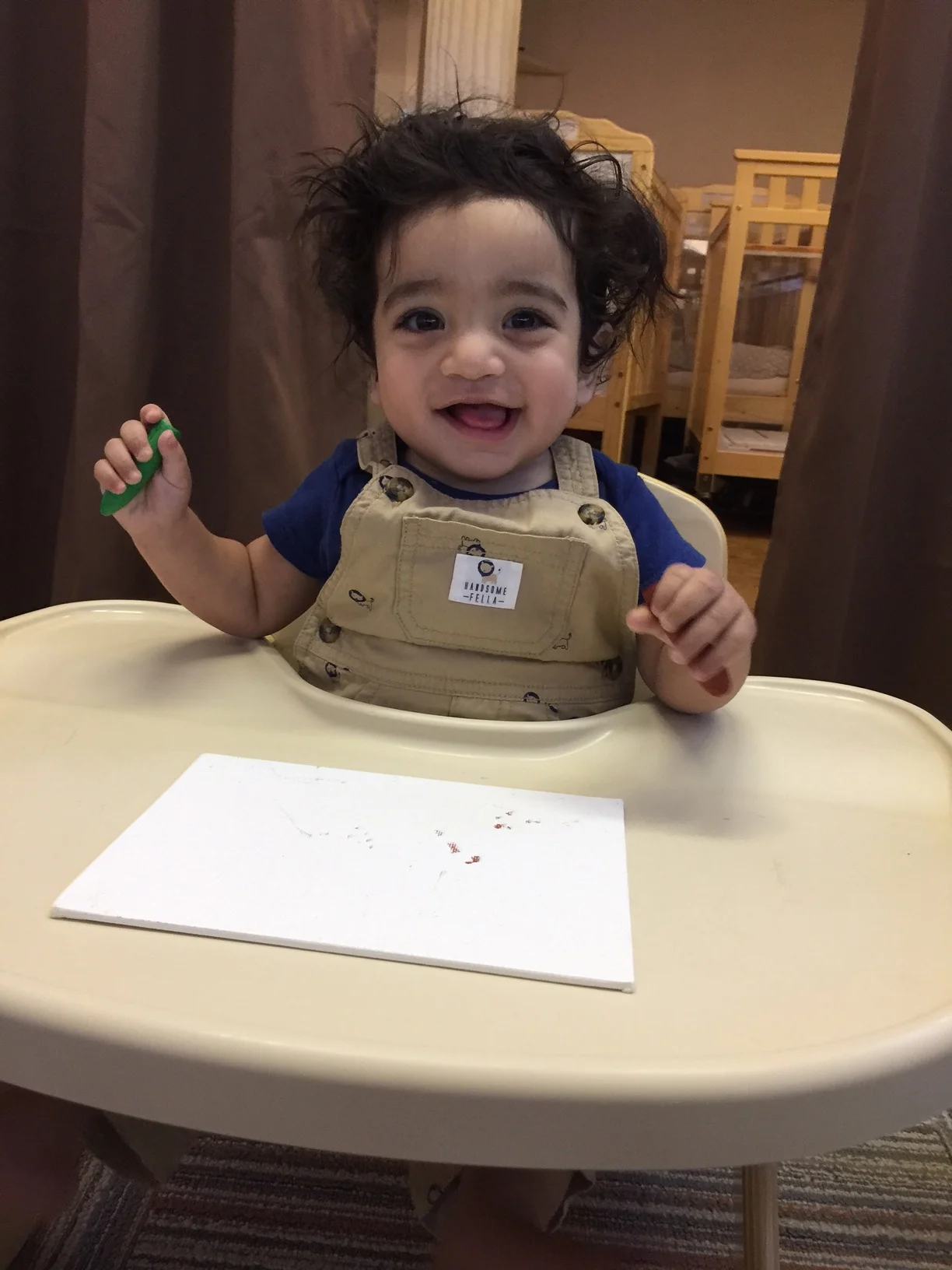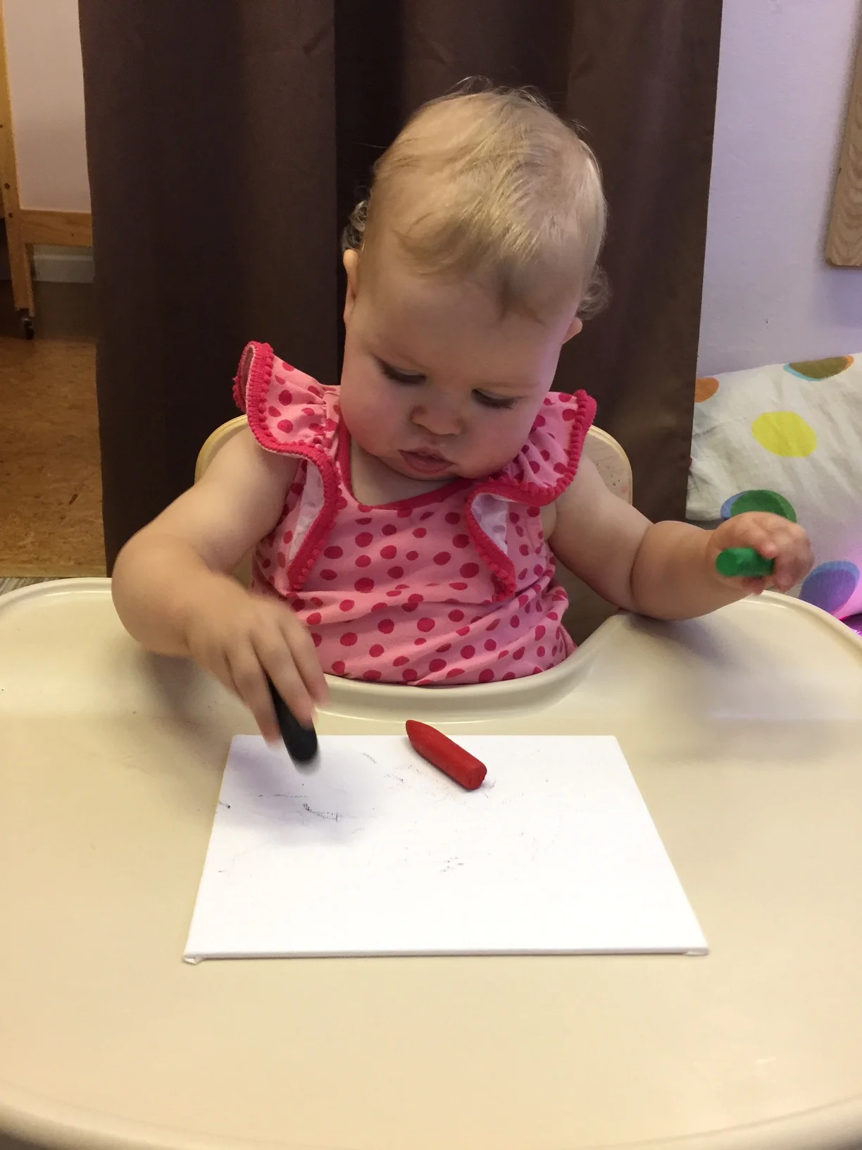 Sloane and her classmates are strengthens their fine motor skills, as they draw with crayons- encouraging the movement of their fingers, hands and wrists.