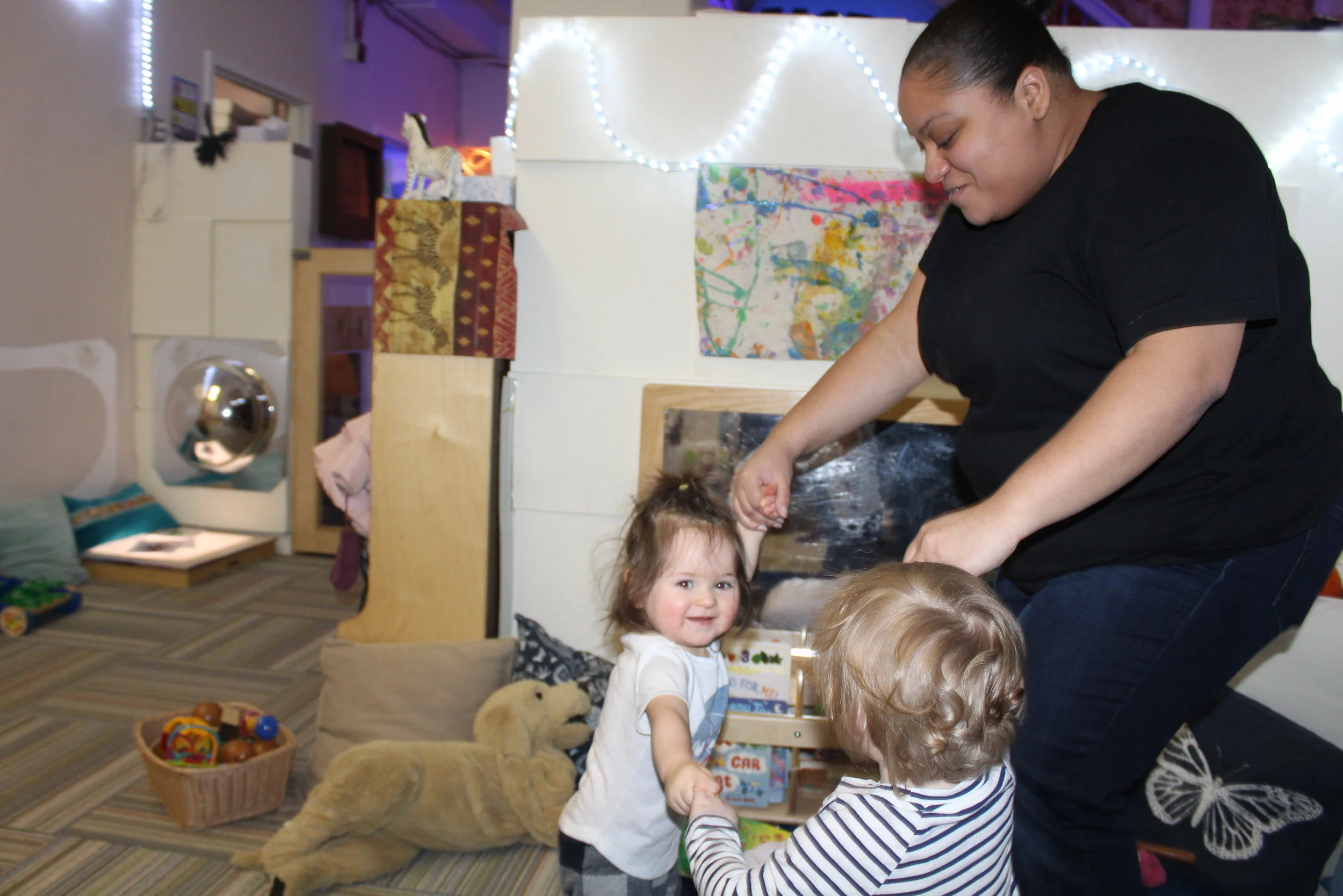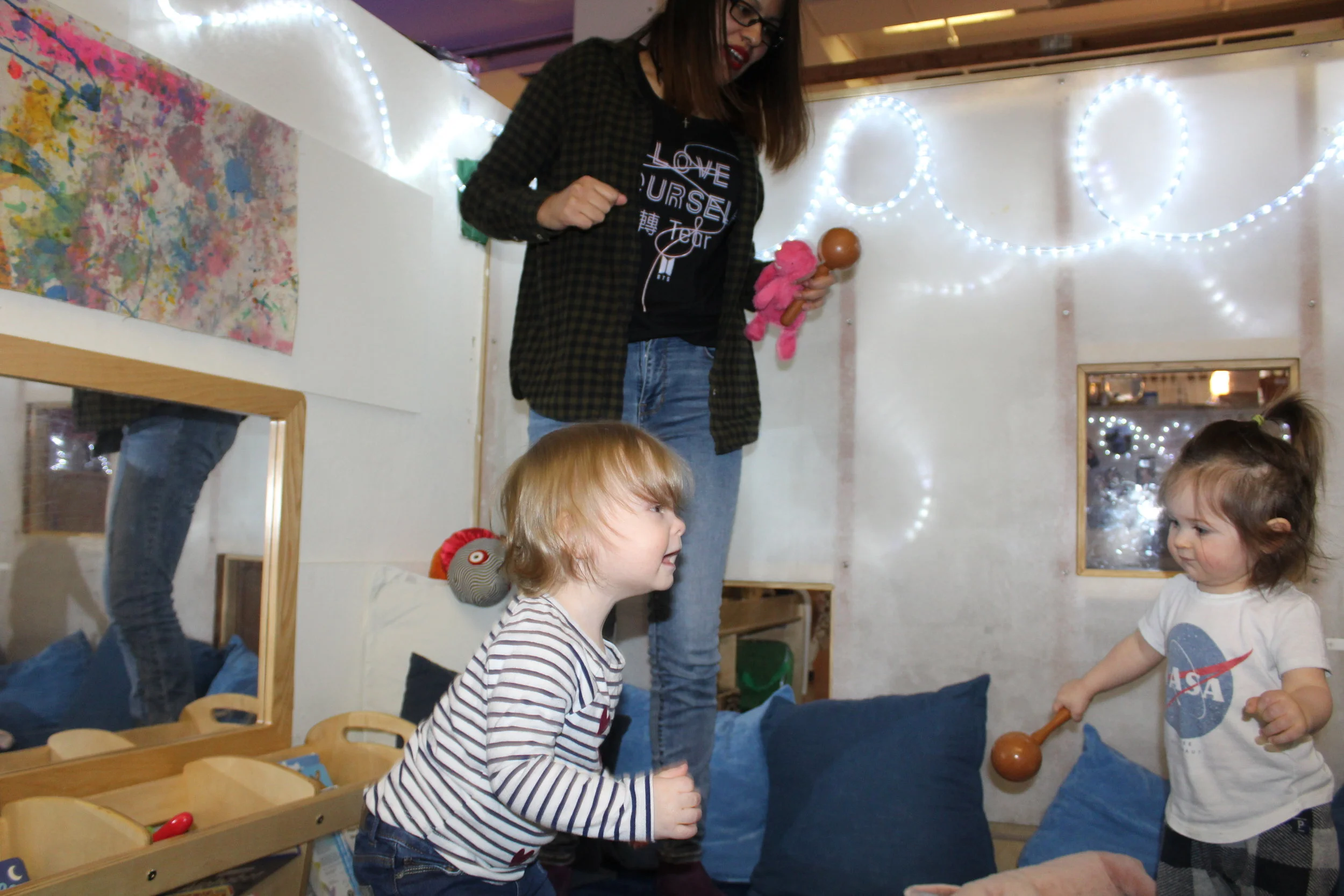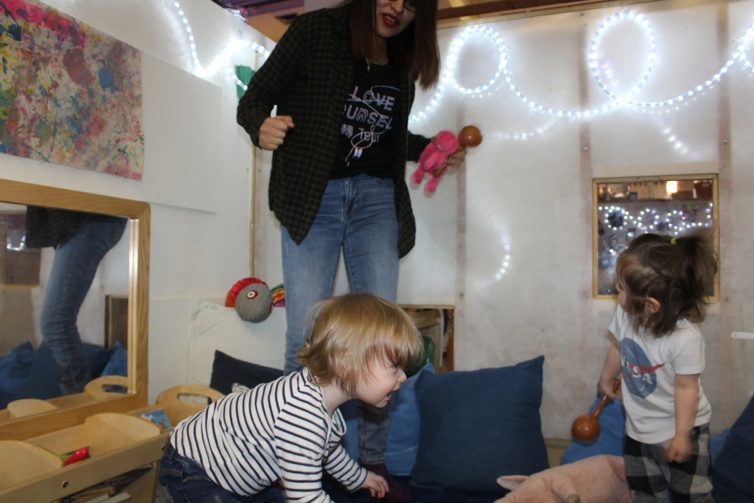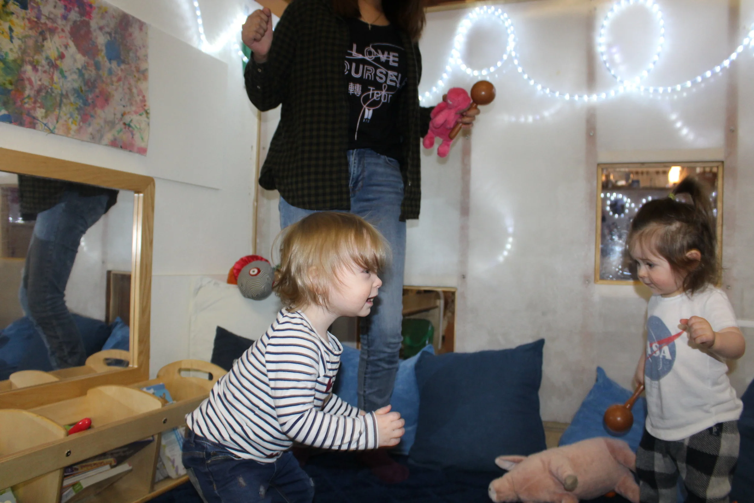 The whole group singing “Ring Around the Rosie” and dancing with Ms. Sara in the middle!