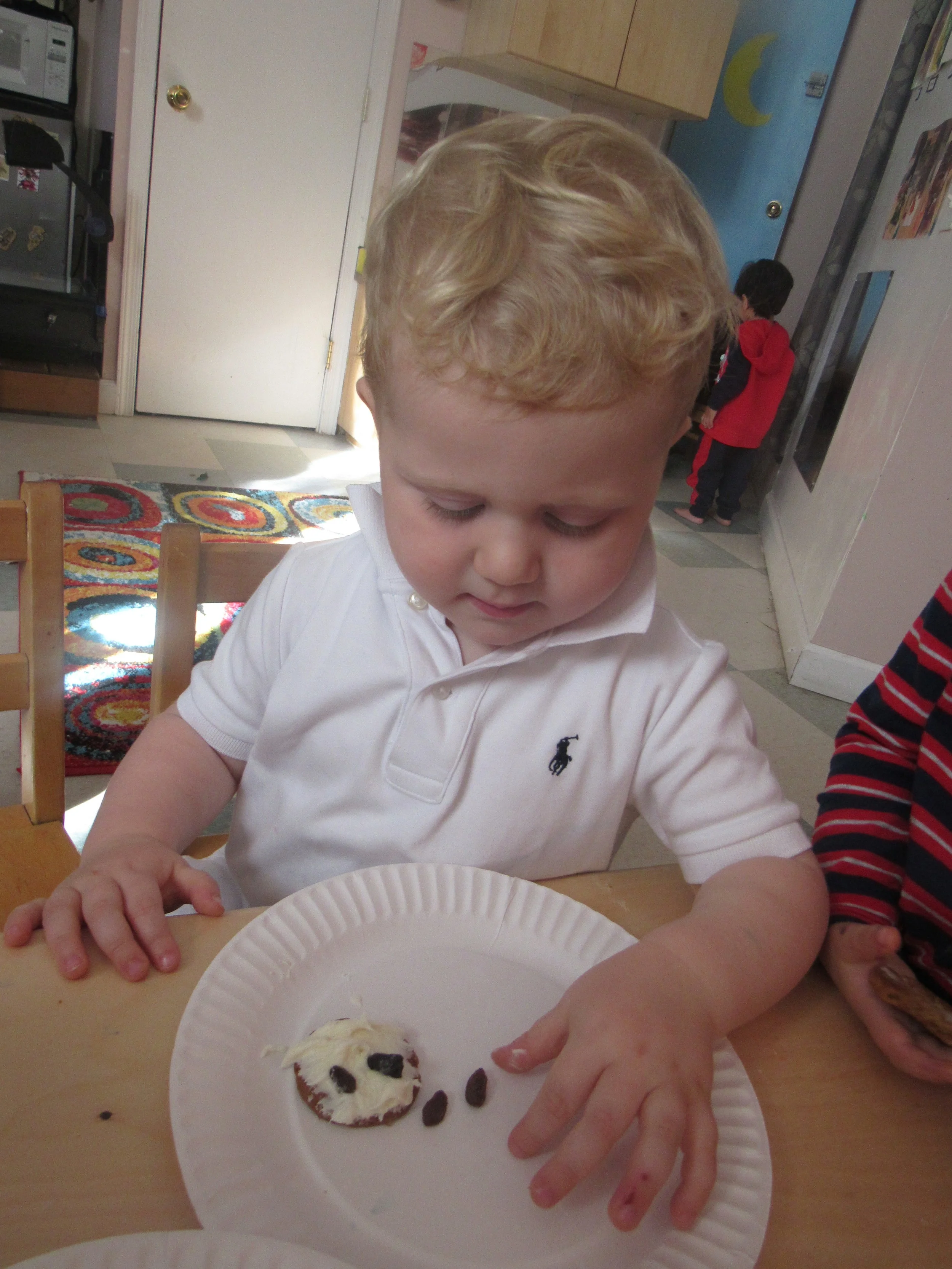 Friday, we read the story of the Gingerbread Boy again. Over the last week when we have read the story, the children have wondered what gingerbread tasted like. So, during cooking time today, we decorated ginger snap cookies with raisins and frosting to make our very own gingerbread people. The children loved decorating and then eating the cookies.